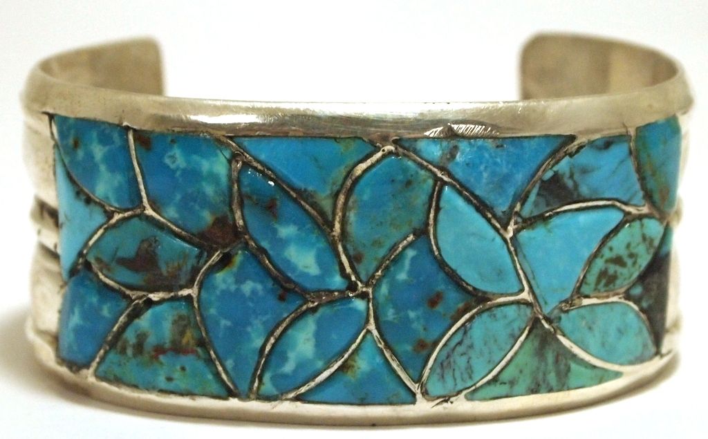Vintage Old Pawn Zuni Turquoise Inlay Sterling Silver Cuff Bracelet - ALH