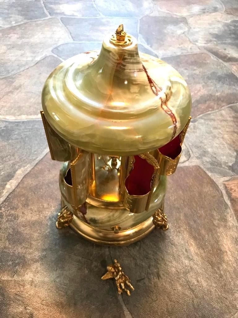 Vintage, 1960's musical cigarette dispenser. Could also function as a  lipstick, cosmetic holder. Thorens movement, made in Switzerland. Green onyx with gold gilt, cherub playing mandolin inside center. Plays "Madame Butterfly". **** in working condition, however small doors remain open at the end of the tune, possibly needing adjustment, gilt metal cherub finial has broken away from base ( per photos ) & needs repaired, also two cracks to the onyx at the base, one with minor loss ( per photos ).