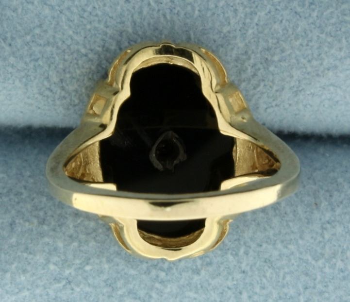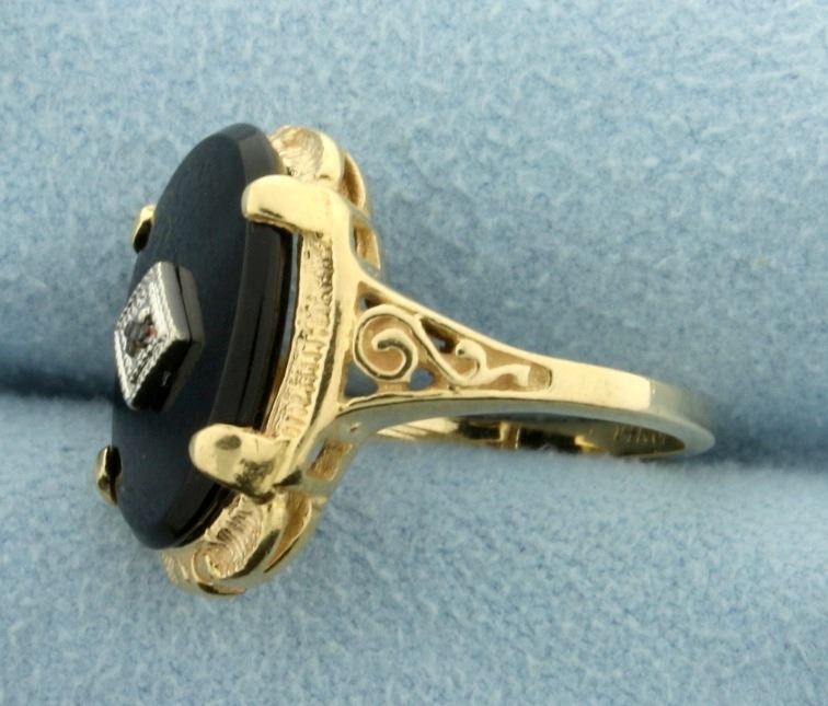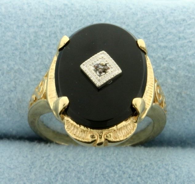 In 14k yellow and white gold. Contains an oval 16x12mm onyx gemstone as well as a 1/2 pt diamond. Detailed design on shank. Size 5 1/2. 4.3g.