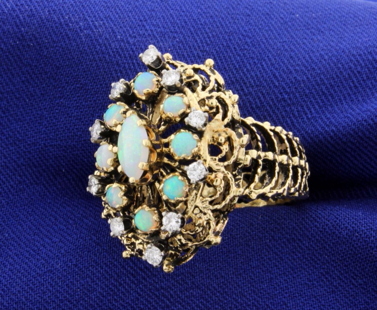 In 14k yellow gold this cocktail style ring contains 10 round diamonds, 1/2ct total weight with SI-1 clarity & H color. Also there are 9 marquis & round opal gemstones with excellent play of color. Size 7.5 10.9g