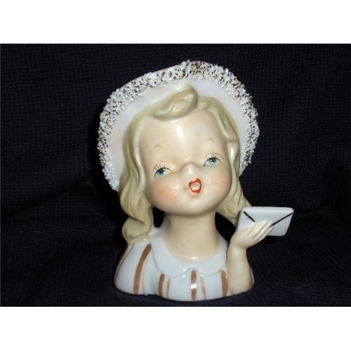 Vintage and original Young Girl holding a Letter. She has blonde hair with a white hat flecked with 24K gold. Her dress is a stripe in a light brown and white. In her left hand she is holding a letter. Her sweet little mouth is open and heart shaped. In "The Encyclopedia of Head Vases By K. Cole" there is a photo with five of the same vases only each one has something different in their hands. So this might help someone missing this one from the set or, she could be the first one in your set and the pleasure of the Hunt for the remaining four. There are no markings. Condition is excellent, no cracks, chips, crazing or paint loss. See photos. Take a glance at my other items. Thank you for viewing.