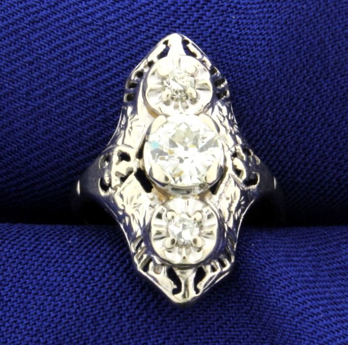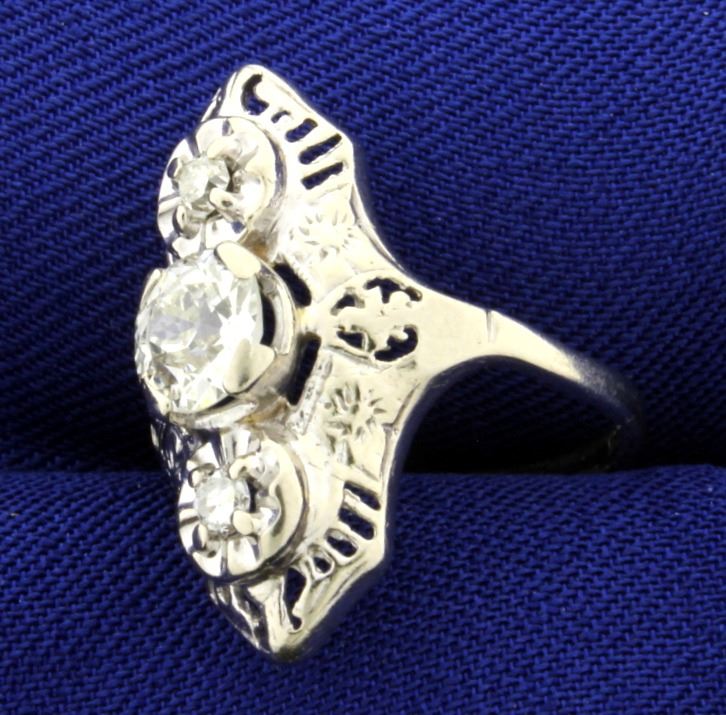 In 14k White Gold. The center diamond is a high quality Old European cut 3/4 ct diamond with VS clarity and H color. Also contains two smaller diamonds of similar high quality, each .04 cts. Beautiful handcrafted workmanship on face of ring. Size 4. 3.1g