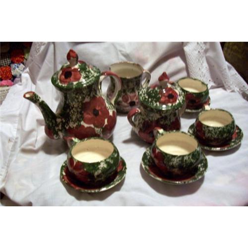 Gorgeous Oaxacan tea set, Hand painted, a combination of sponging, and hand painted flowers. I have never seen another like it and i have been dealing with Talavera and Oaxacan wares for 15 years. In excellent condition, no chips, no cracks, no crazing. The teapot is 10 inches high, and 7 inches wide, the sugar bowl is 7 inches high, and 5 inches wide, with a lid, and the creamer is 5 inches high, and 5 inches wide, the cups and saucers are 3 inches high, and 3 inches wide, excluding the handle. A lovely piece of Mexican folk art. Thanks for shopping in the land of Enchantment!