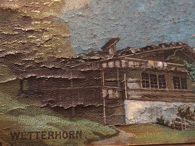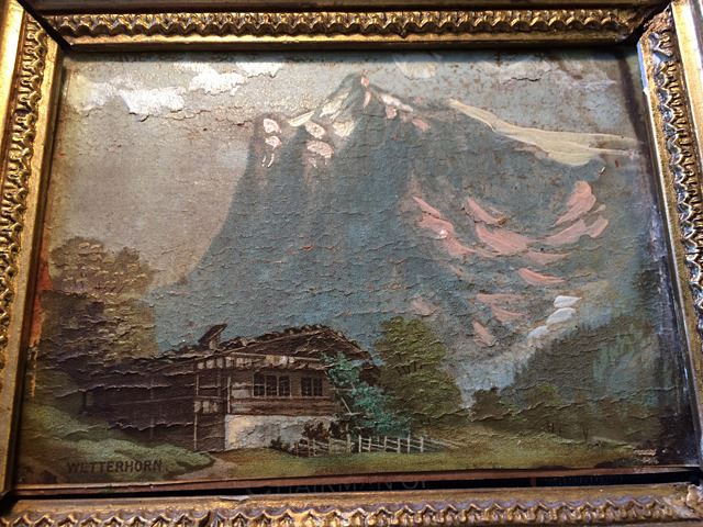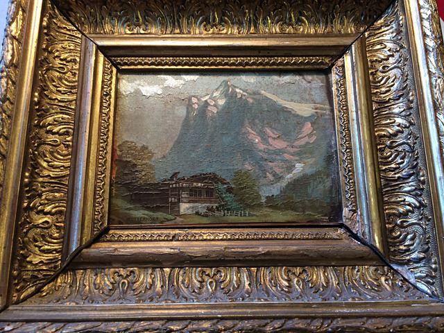 Vintage oil painting on canvas of "Wetterhorn" in ornate vintage gold gilted frame, measures approx. 10" wide x 8 1/2" tall.