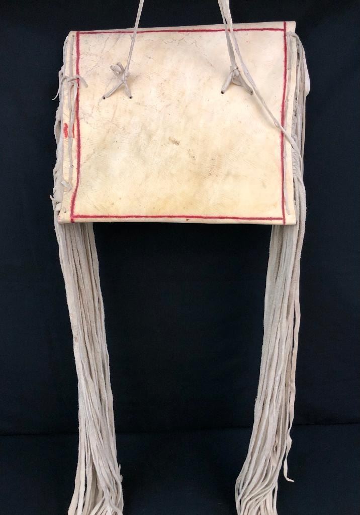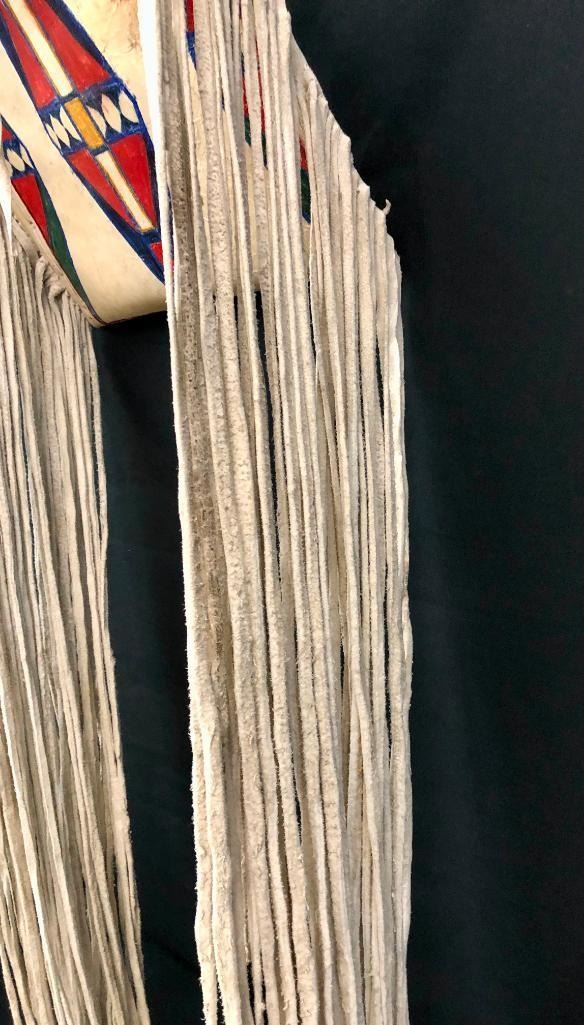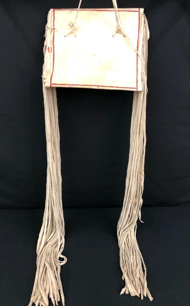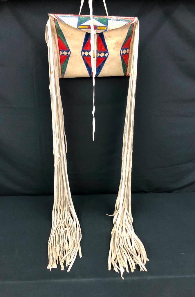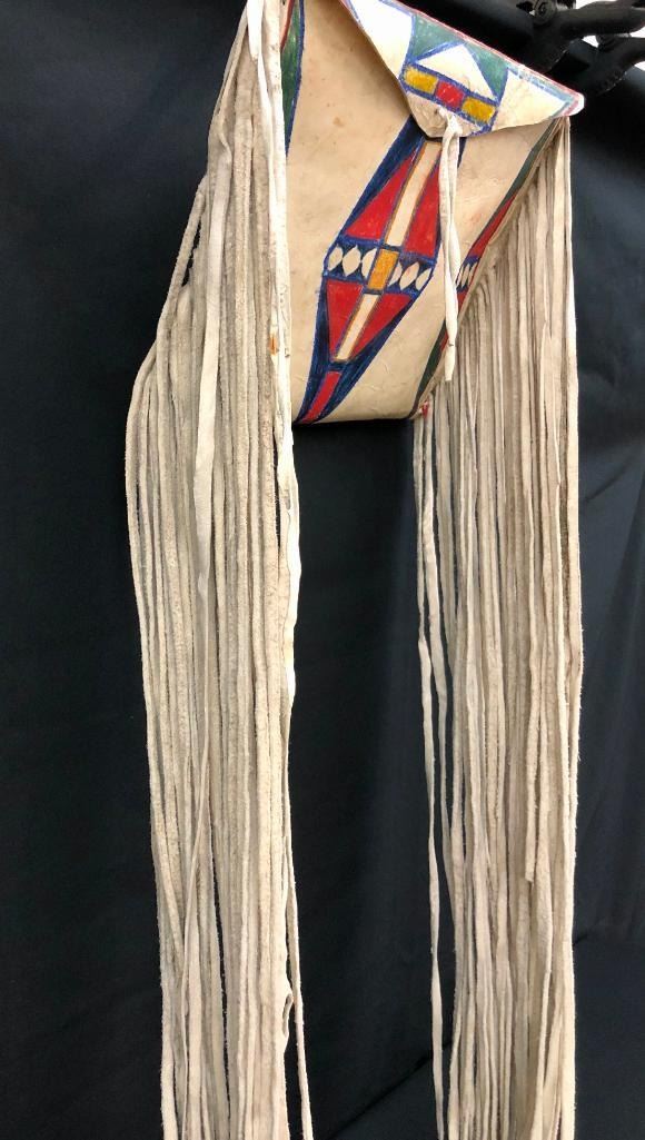 Offered for sale in this lot is a vintage parfleche container featuring traditional designs and accented with long leather fringe. A parfleche is a Native American rawhide bag, typically used to package and transport goods, clothing, and foodstuffs. Among many of the tribes, it was women's work to make and decorate parfleche (often with designs passed down for generations through families). MAKER: Unmarked. APPROX AGE: Vintage. SIZE: 13 inches wide x 52 inches long. CONDITION: Good for its age, normal wear expected. Please look closely at the pictures as they are an important part of our description and are hereby incorporated into the description, specifically with regards to condition. SHIPPING: There will be a $10 handling / packaging fee for shipping this lot. The actual cost of postage will be added on top of that. BUY IT NOW: If you would like to buy this item now, without waiting for the auction day to bid on it, we do offer this option (which is available up to 48 hours before the actual auction starts). The “Buy it Now†price is the high estimate of this lot (plus applicable fees and the Buyer's premium is discounted to 10% when using the Buy it Now option). If you would like to exercise this option, you must contact us by email (or phone as long as you talk to someone live). Reference this lot number and your intention to "Buy it Now."