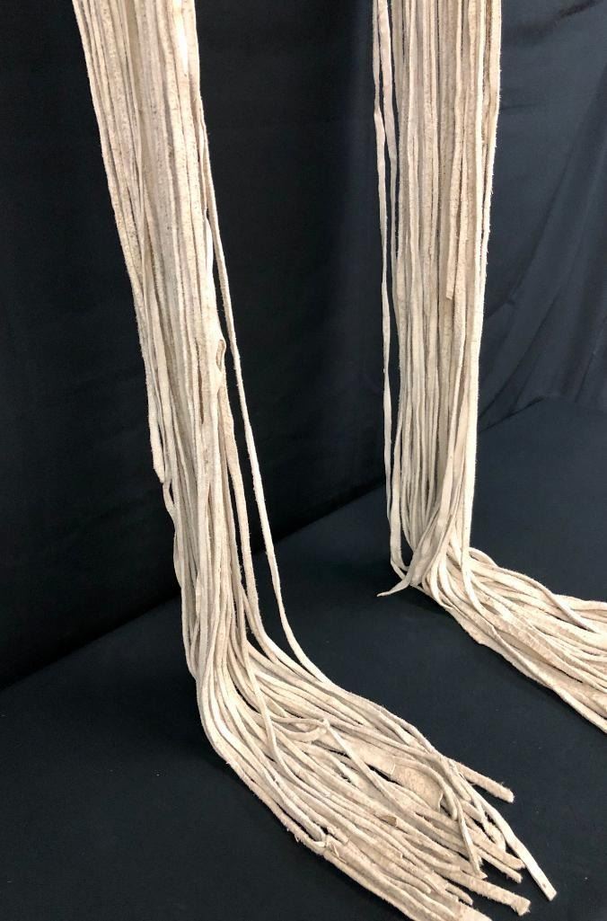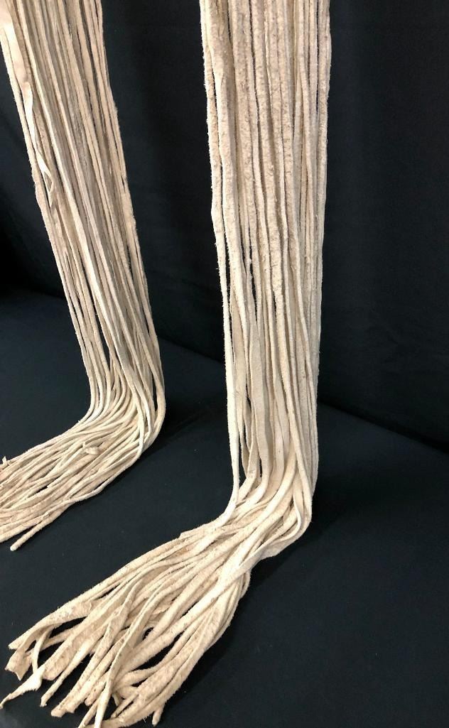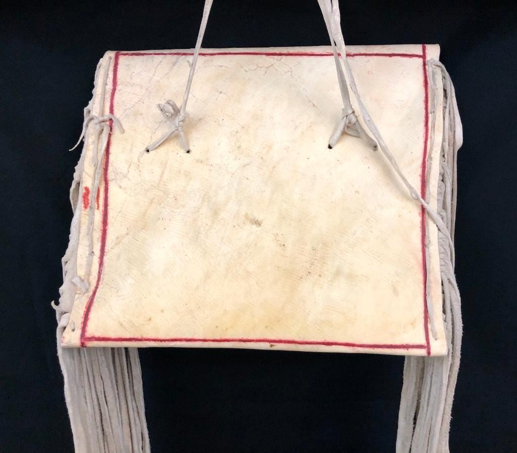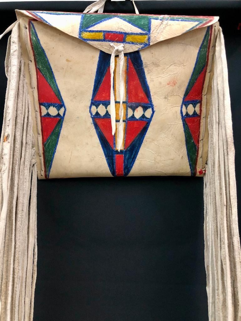 Offered for sale in this lot is a vintage parfleche container featuring traditional designs and accented with long leather fringe. A parfleche is a Native American rawhide bag, typically used to package and transport goods, clothing, and foodstuffs. Among many of the tribes, it was women's work to make and decorate parfleche (often with designs passed down for generations through families). MAKER: Unmarked. APPROX AGE: Vintage. SIZE: 13 inches wide x 52 inches long. CONDITION: Good for its age, normal wear expected. Please look closely at the pictures as they are an important part of our description and are hereby incorporated into the description, specifically with regards to condition. SHIPPING: There will be a $10 handling / packaging fee for shipping this lot. The actual cost of postage will be added on top of that. BUY IT NOW: If you would like to buy this item now, without waiting for the auction day to bid on it, we do offer this option (which is available up to 48 hours before the actual auction starts). The “Buy it Now†price is the high estimate of this lot (plus applicable fees and the Buyer's premium is discounted to 10% when using the Buy it Now option). If you would like to exercise this option, you must contact us by email (or phone as long as you talk to someone live). Reference this lot number and your intention to "Buy it Now."
