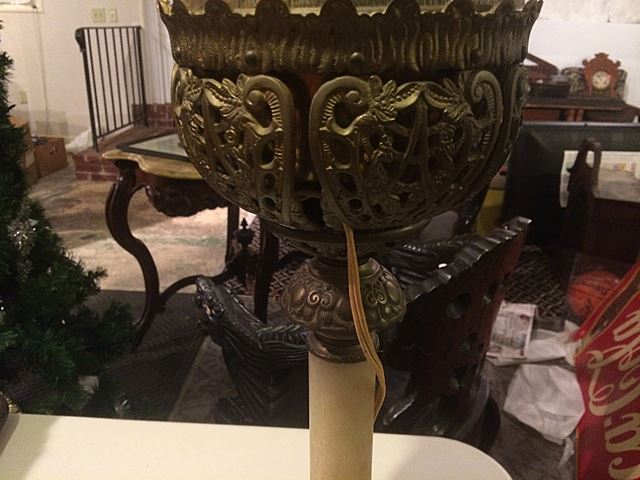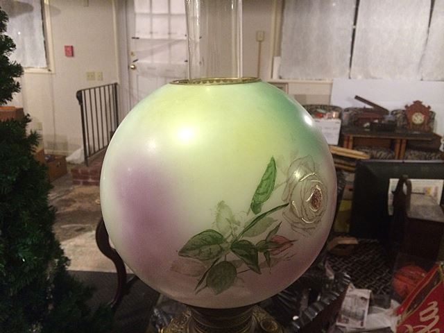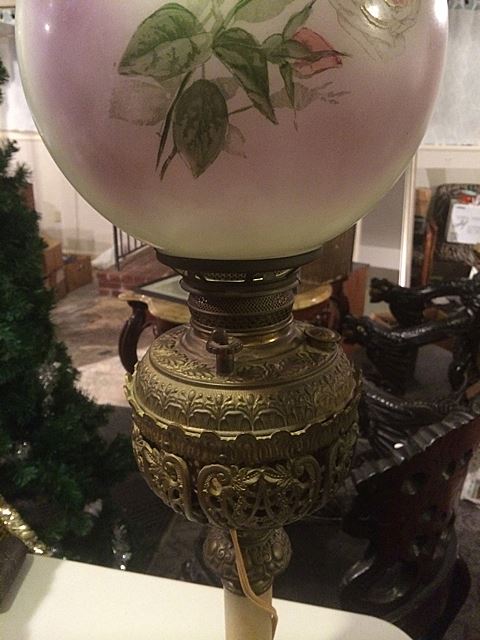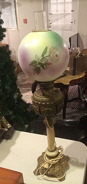 Beautiful vintage parlor lamp, brass and marble lamp base with hand painted globe, has been electrified. Measures approx. 29" tall.
