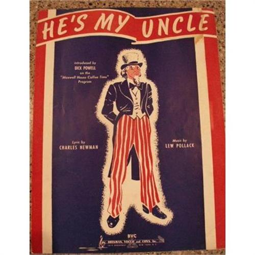 What a great collection of vintage "Patriotic" Songs that still rings true in our hearts today as they did 65 years ago as our boys fight for freedom for our country and others.<p>1. 1940 "He's My Uncle" Lyric by Charles Newman and music by Lew Pollack, Introduced by Dick Powell on the "Maxwell House Coffee Time" Program. Excellent Condition except for staining in upper right corner. $20<p>Sale on all 4 - $60.00<p>2. 1937 "National Emblem Marc" by E.E. Bagley, Copyright, Walter jacobs. $18<p>3. 1941 "Any Bonds Today" The theme song of the National Defense Savings Program, words and music by Irving Berlin. Souvenir Copy - States Not for Sale. - $20<p>4. 1940 "We're All Americans" (All True Blue), words and music by James T. Mangan, Featured by Kate Smith. Collwill Incorporated Music Publishers, NYC. $18