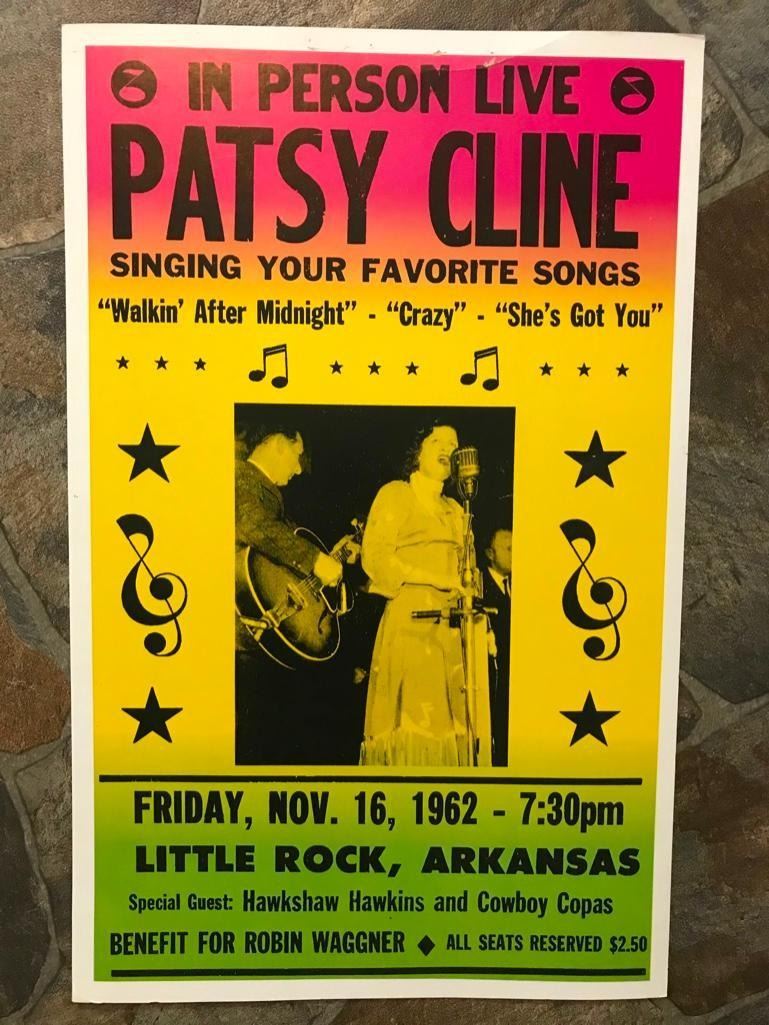 Vintage late 1980's, early 1990's creation, Patsy Cline concert poster replica, created after her 1962 concert in Little Rock Arkansas November 16, 1962. 14" X 22" on heavy cardstock. * creasing to top portion of poster.Â