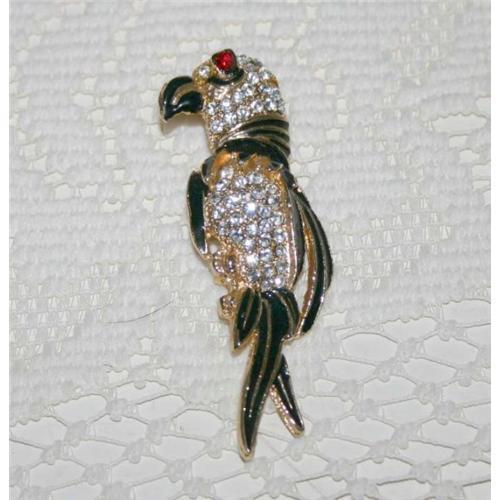 A beautiful gold plated metal set with Pava Rhinestones create this vintage Rhinestone Parrot Brooch from the 1950s-60s. Trimmed in black enameling setting off the bird?s feathers and beak with a large Red Chaton Rhinestone Eye; pin stem runs on the diagonal for perfect balance. Weighty and well made measuring 2 ¾ inches long by 1 inch wide. Appears to be in unworn condition!