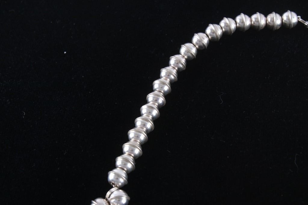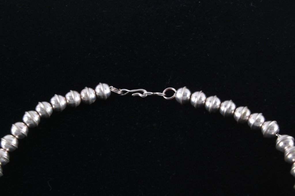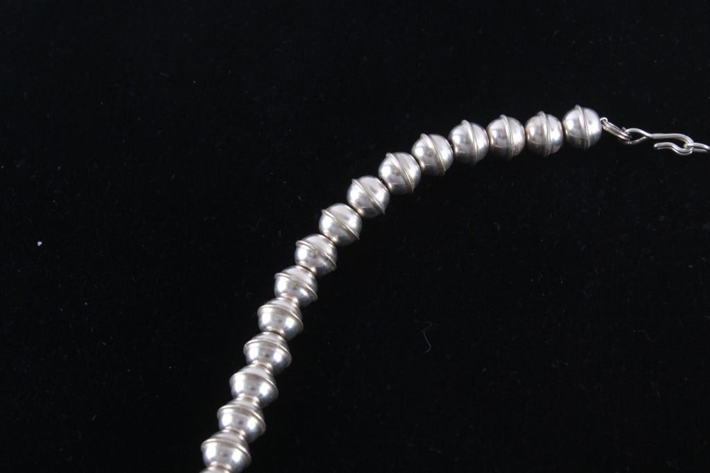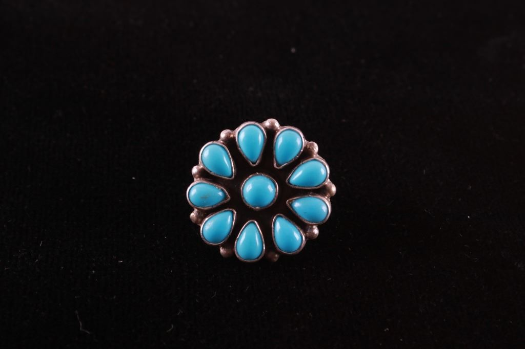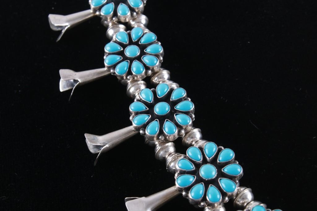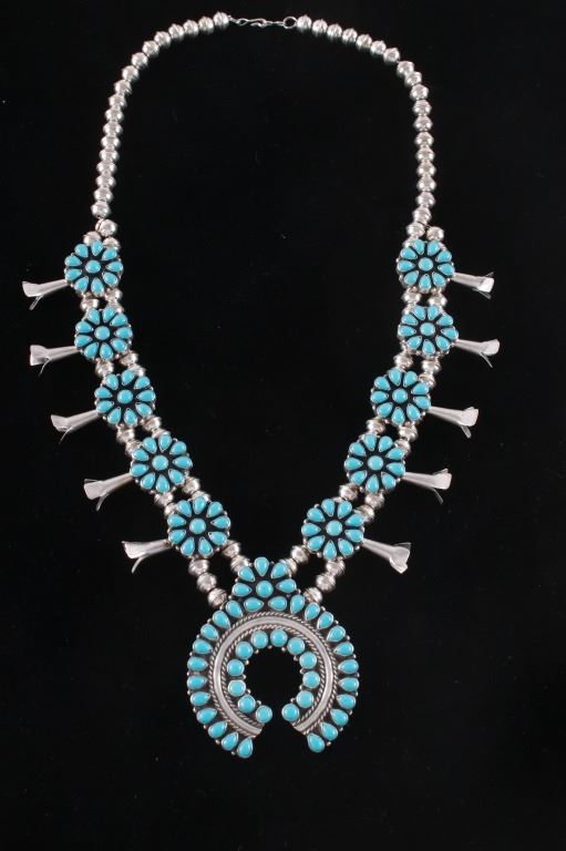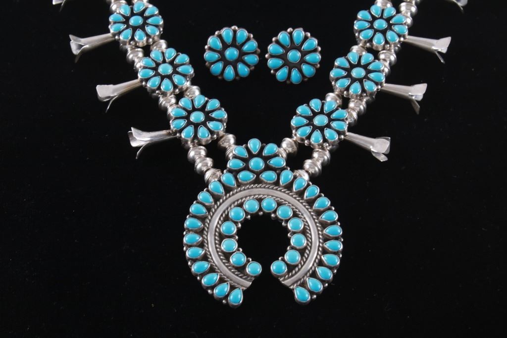 This is an outstanding Vintage Pawn Trading Post squash blossom necklace and earring set with amazing petit point cluster Turquoise and sterling silver signed K.C. Cook Silver Dust Trading Company. The set includes a squash blossom necklace and earrings both with an amazing petit point cluster pattern set with Sleeping Beauty Turquoise from Globe, Arizona. The naja squash pendant is stamped "SILVER DUST TRADING CO." / "STERLING", / "K.C. COOK". The earrings match with a petit point cluster pattern in turquoise and sterling silver stud back. The vintage set is well preserved and displays wonderfully. Necklace is 23.5"L clasp to clasp, naja 2.75" by 2.25". Earrings are each 7/8" diameter. Total weight of 134.2 grams.