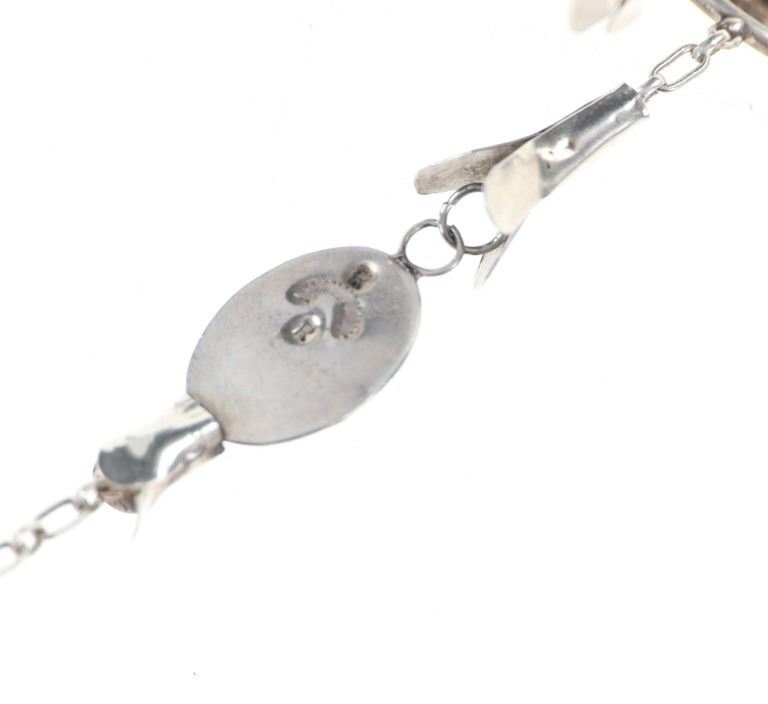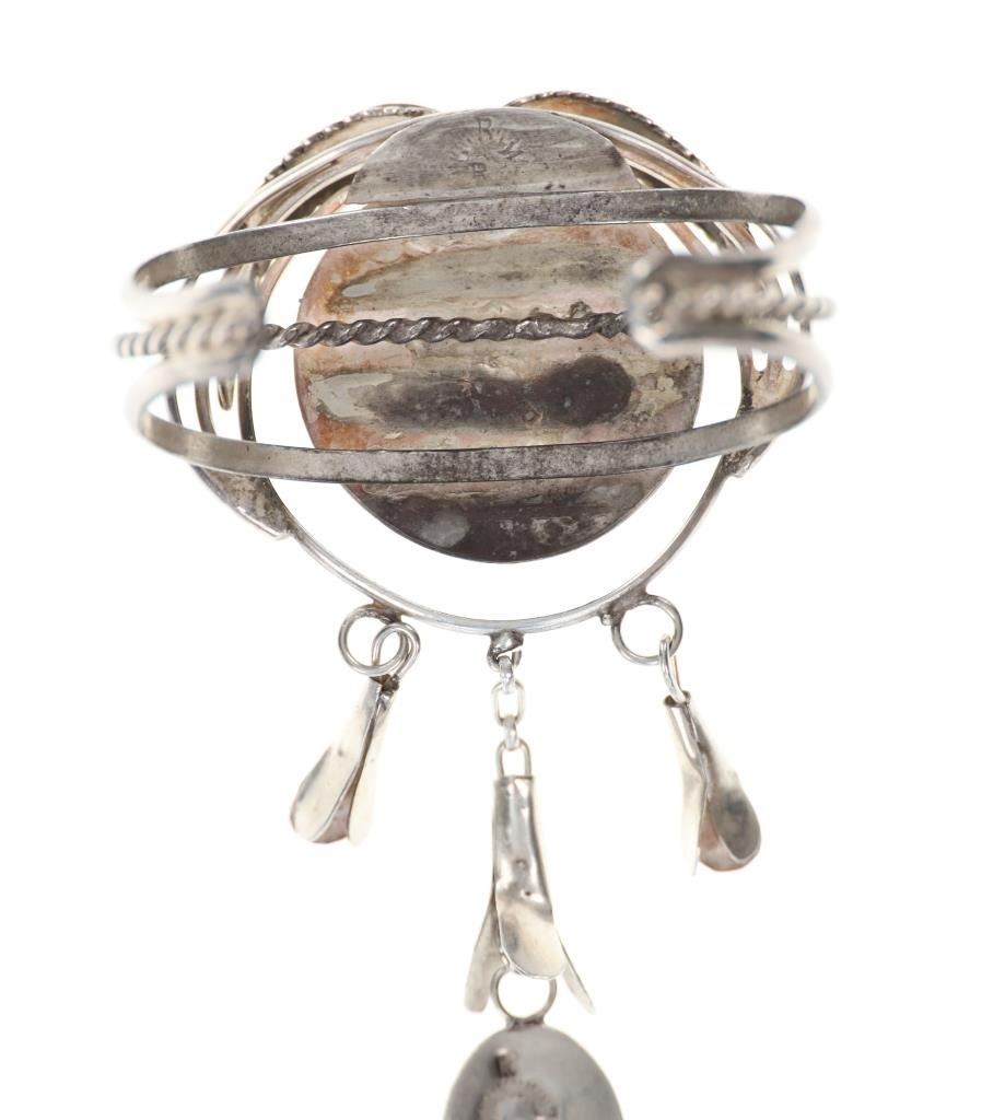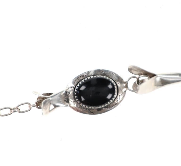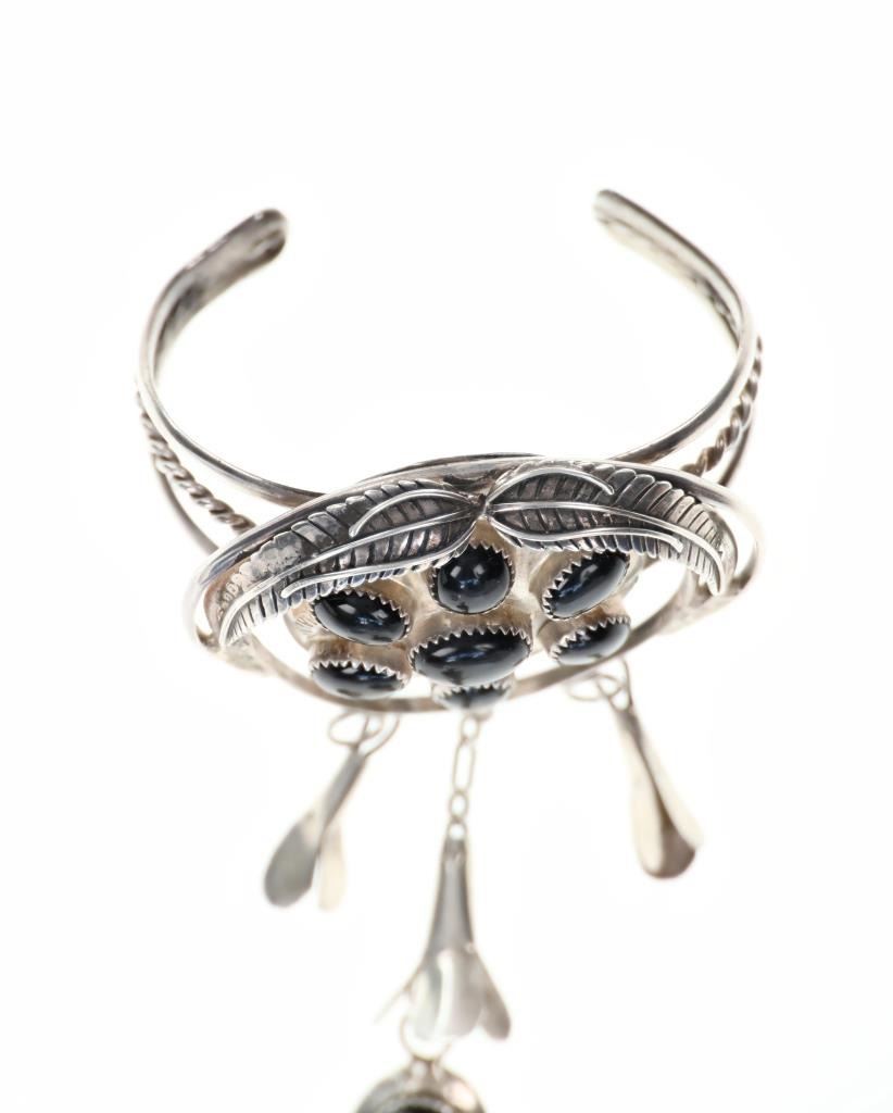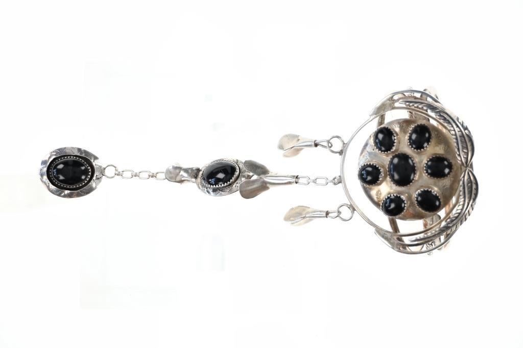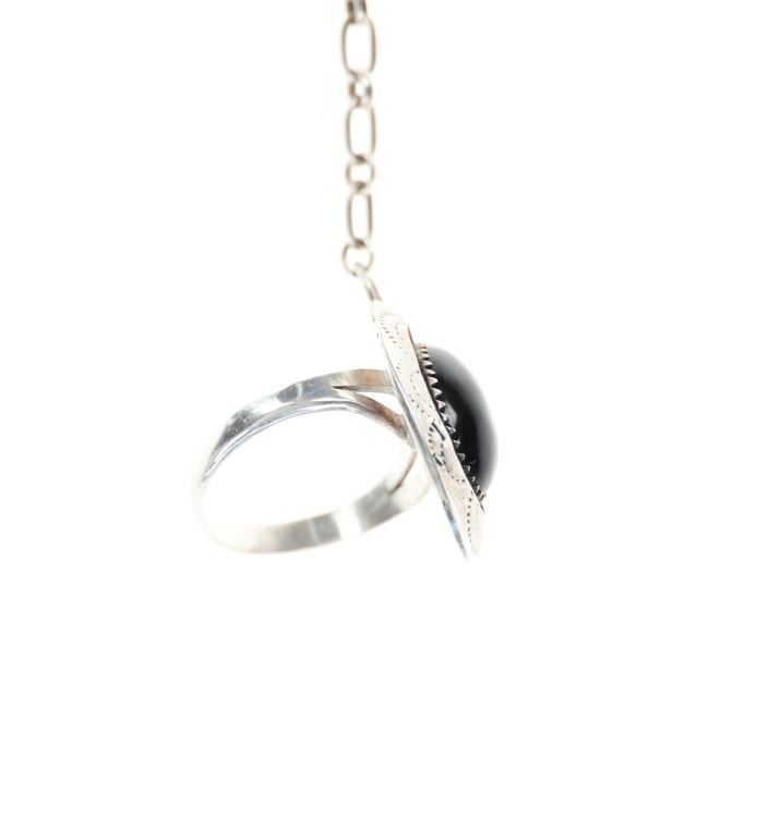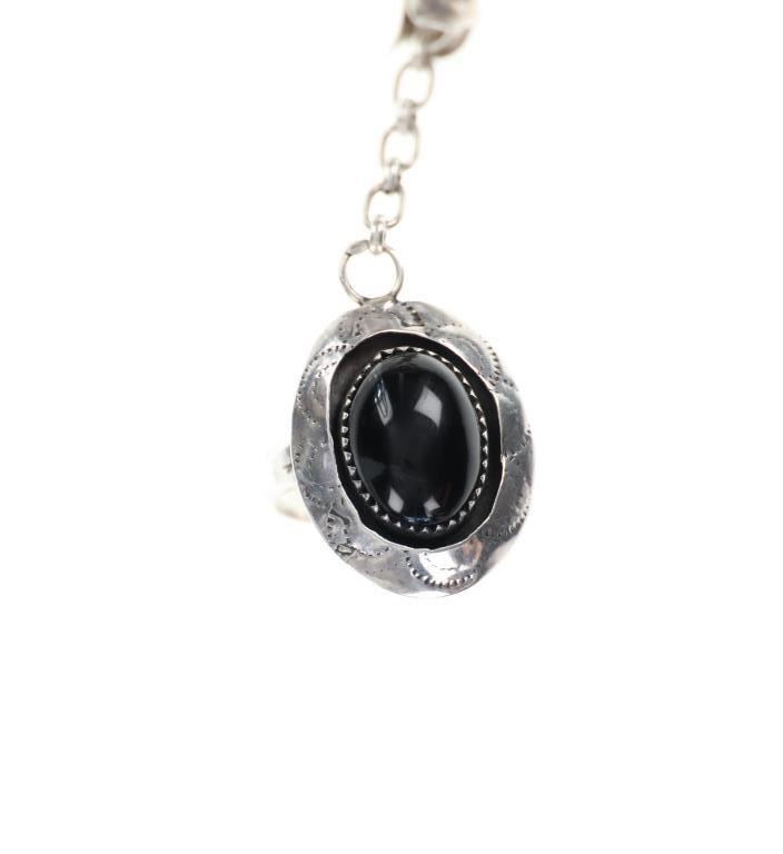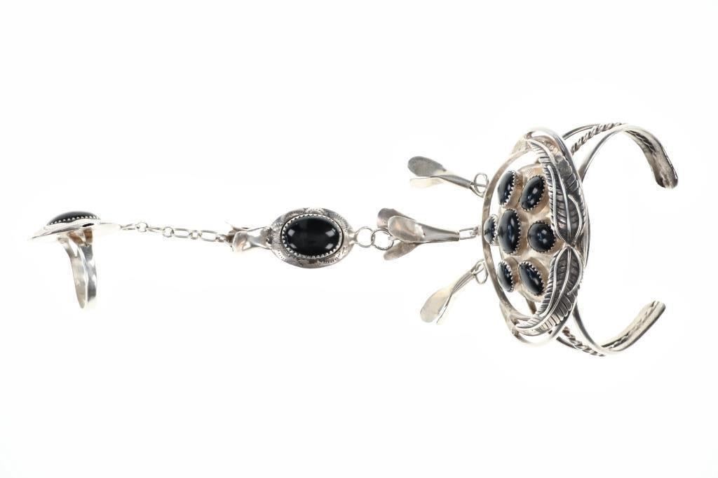The lot features a Vintage Pawn circa 1960-1970's sterling silver bracelet and ring setup from a Navajo artist, signed. The bracelet matches the previous lot, the reversible turquoise and onyx squash blossom. The piece is signed "R (stamped arch) R" and "R". This is often referred to as a "slave bracelet" and shows a bracelet, pendant like piece with chain and ring, all connected. This piece could easily be used together or separated into a bracelet, necklace pendant and ring. The bracelet has a round top with concho like center set with seven polished Black Onyx stones with a border of leaf feather silver and triple band. The bracelet has an inside circumference wrist size of 6.5-inches which includes the 1.25-inch wide opening. The box measurement of the entire piece when laid out is 2.5-inches wide by 7.25-inches long. The ring is a size of about 11 US.