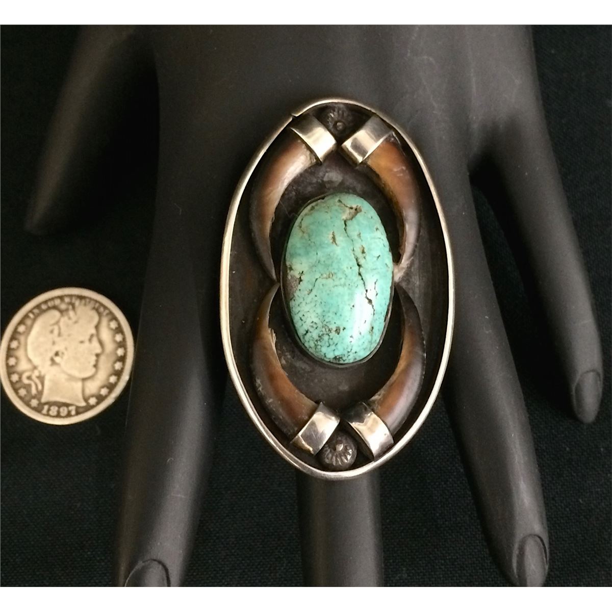 This large, vintage, "Pawn" ring features a beautiful green turquoise cabochon and bear claws. Size 11 and weighs approx. 24.3g.