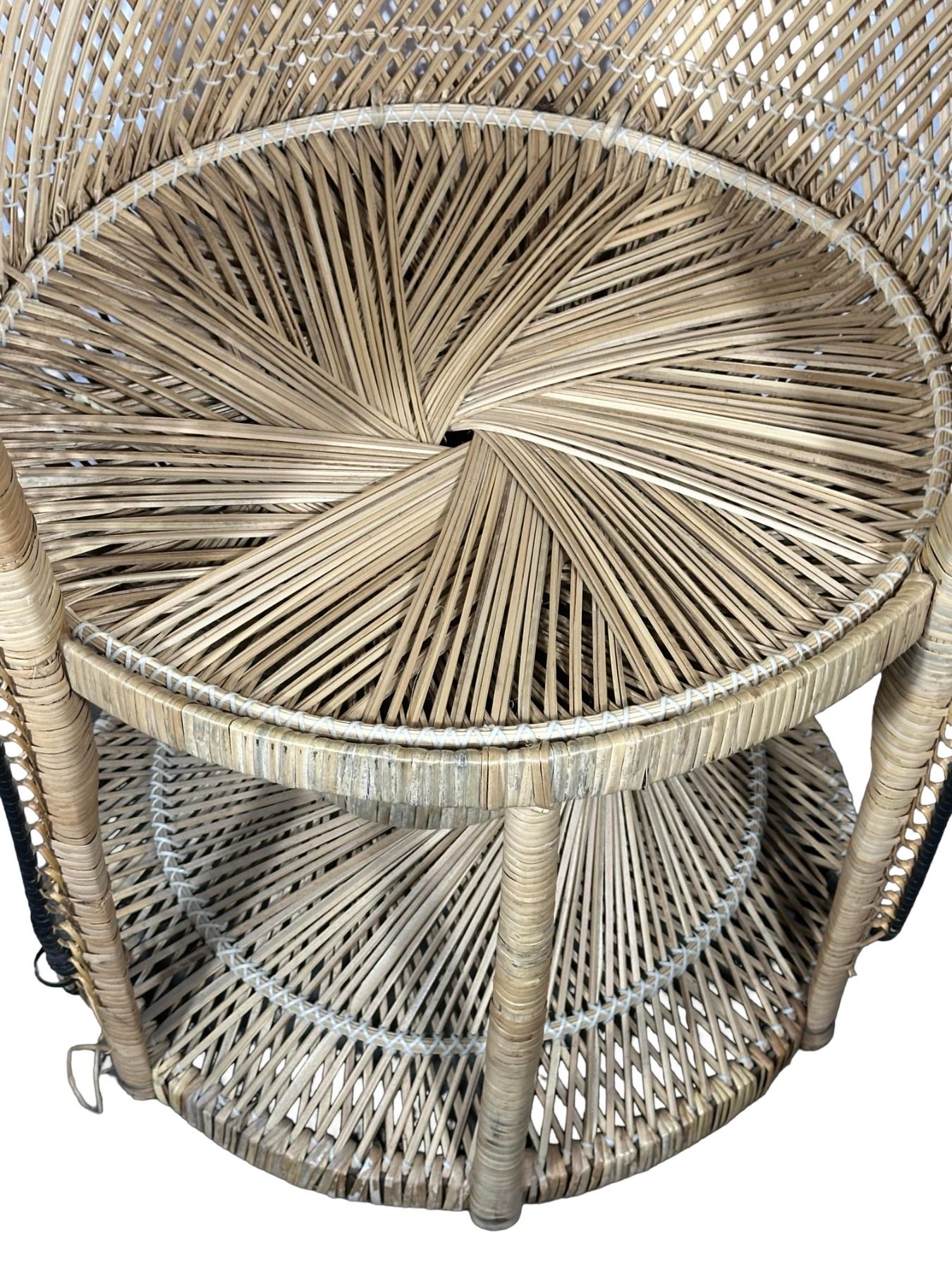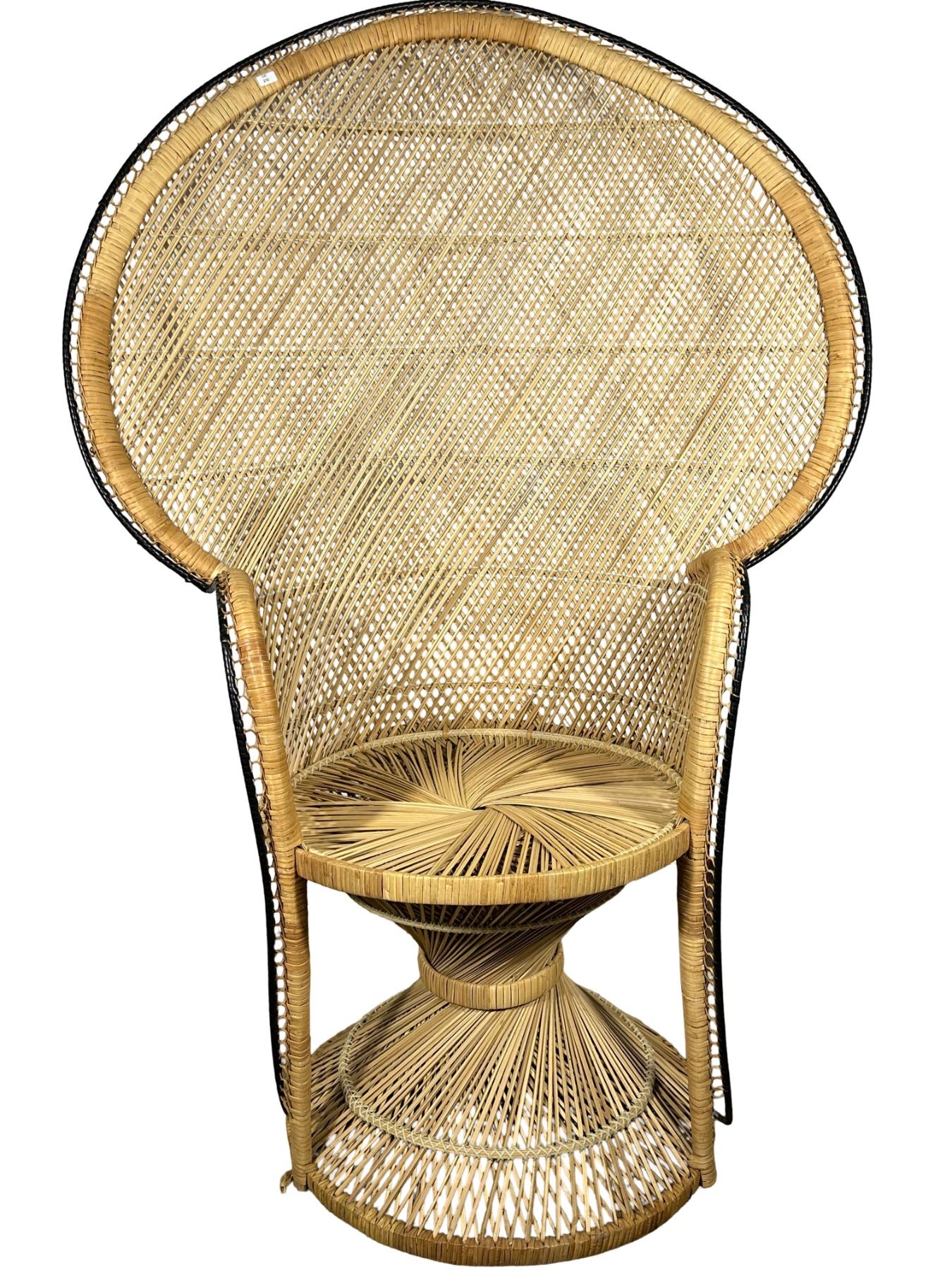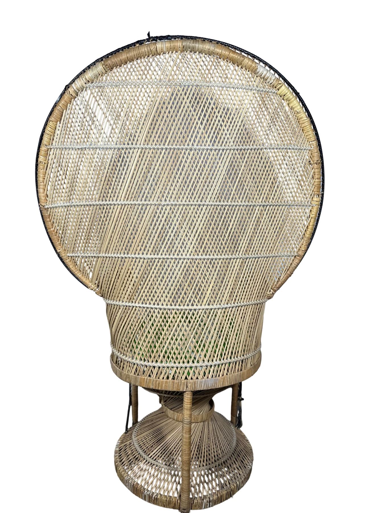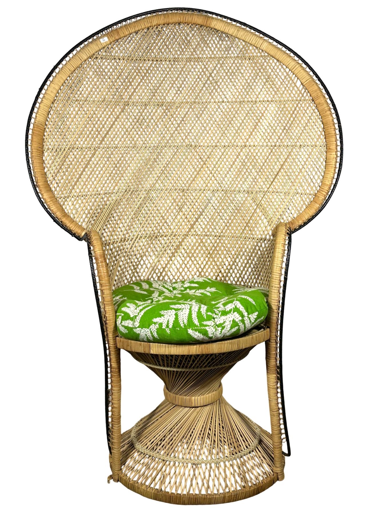 Tall vintage wicker peacock chair with intricate woven design and high rounded back. Includes a bright green patterned cushion. A classic bohemian style statement piece for décor or seating. 58.5"H x 39"W