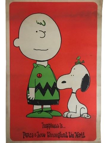 Vintage Peanuts poster featuring Snoopy and Charlie. Quote of the poster: "Happines is...Peace and Love throughout the world". Approx 33"x22". Rolled. Condition: Good. One slight rip at the outer bottom edge.