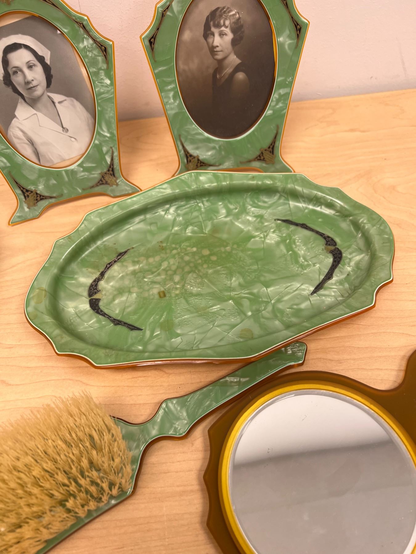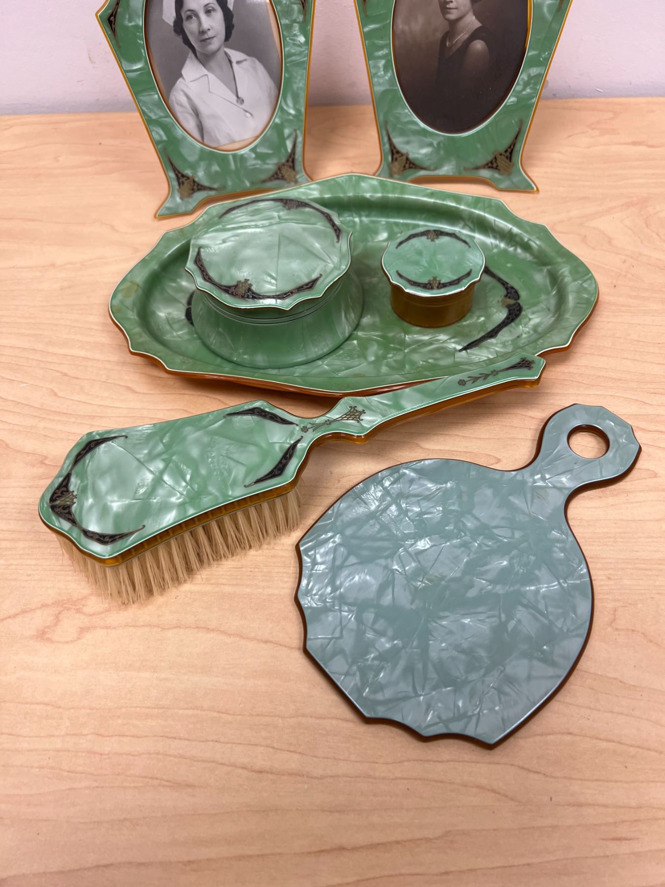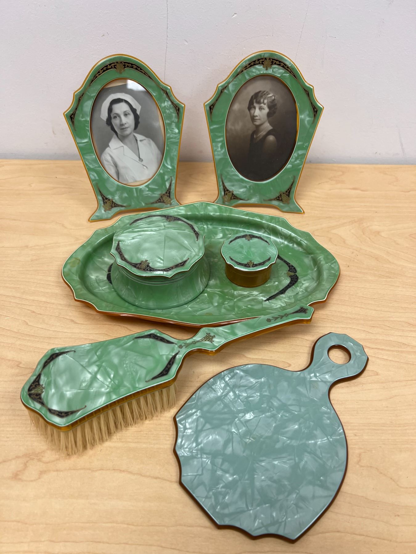 Vintage Pearl Tone Vanity Set as pictured (mirror looks slightly different pattern). Tray 10.5" wide; Picture frames 6.5" tall
