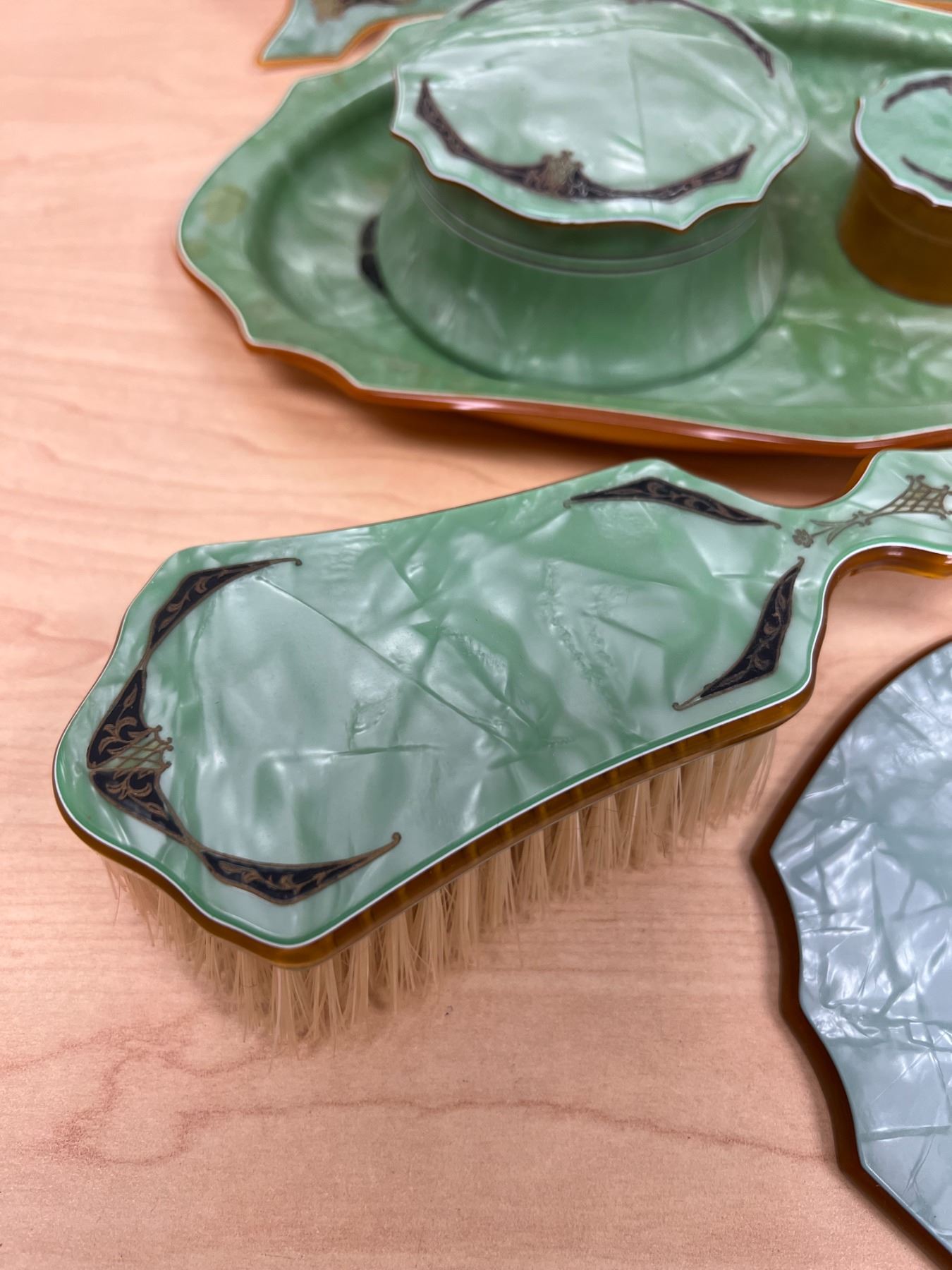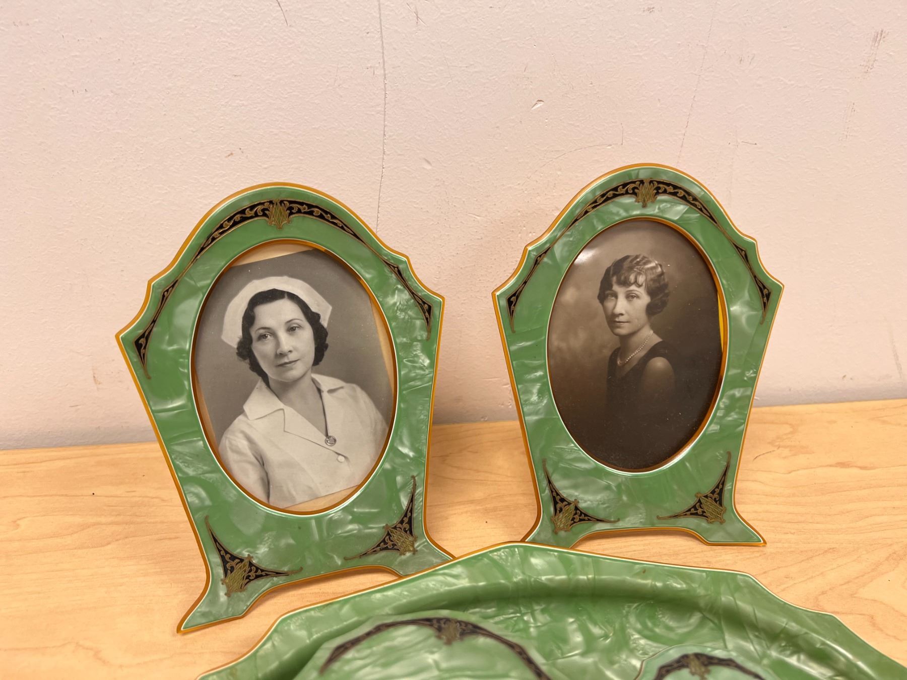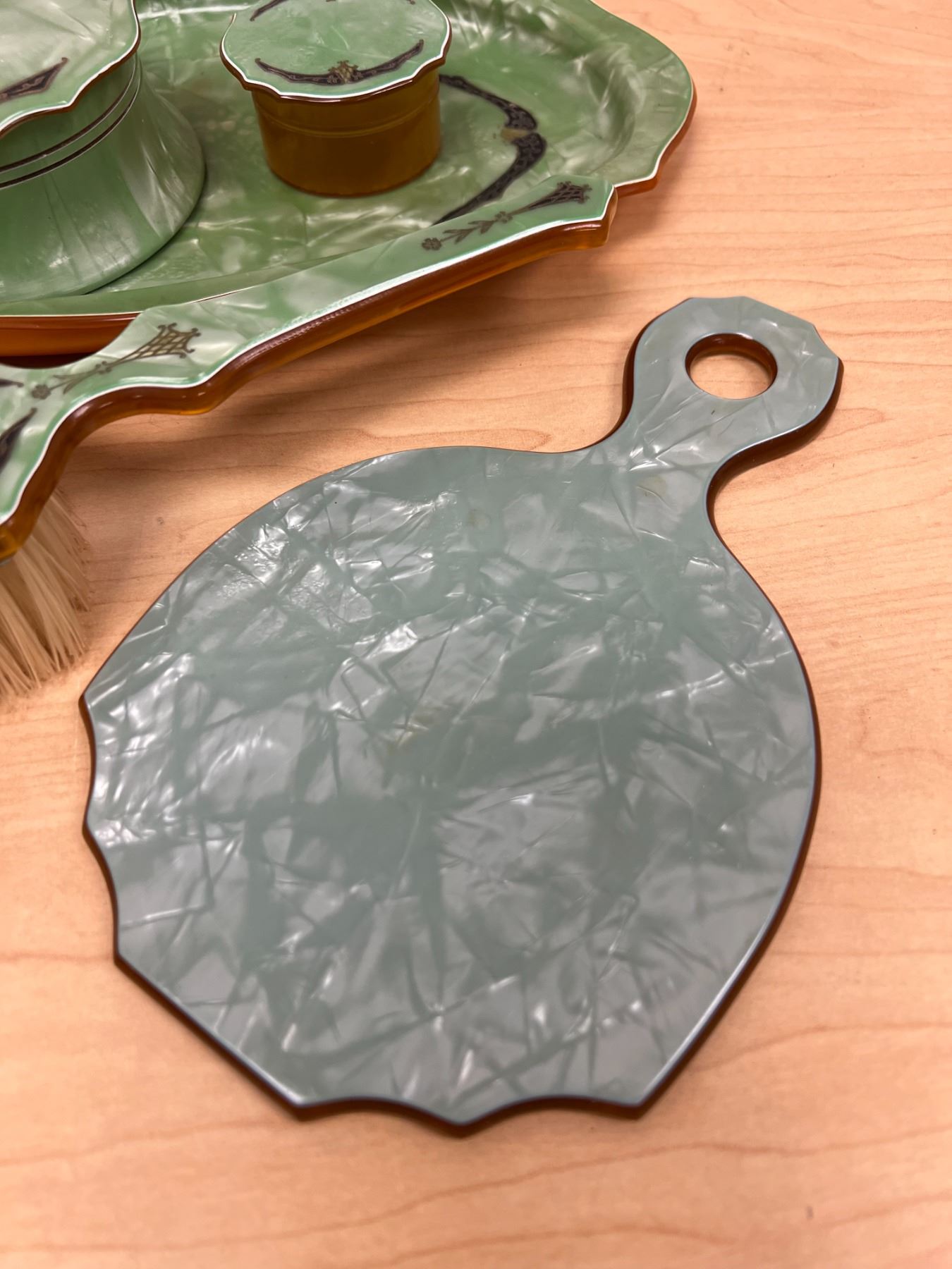 Vintage Pearl Tone Vanity Set as pictured (mirror looks slightly different pattern). Tray 10.5" wide; Picture frames 6.5" tall