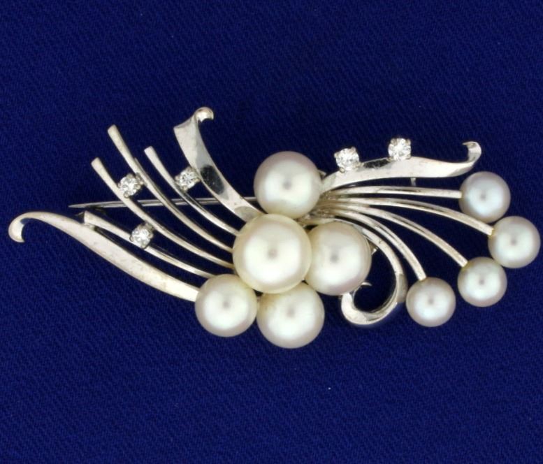 In 14k white gold, containing nine cultured pearls ranging from 5 to 8mm with excellent color and luster. Also containing two .05ct and three .03ct high quality diamonds of VS clarity/G color. 2 1/4" long. 12.6g.