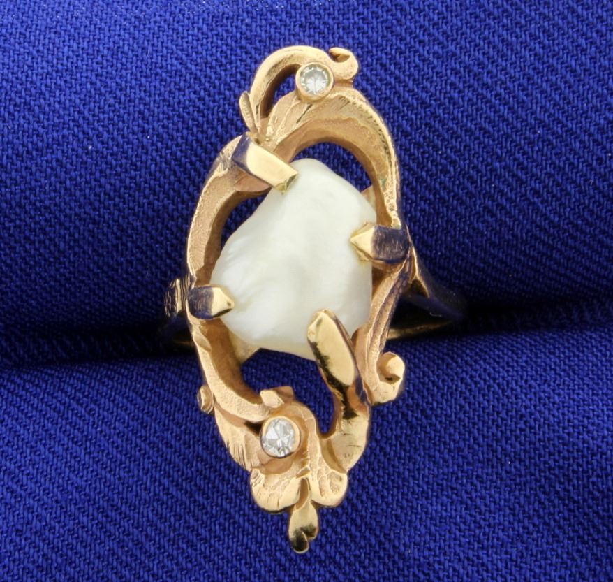 This ring is 14K yellow gold and contains a 10mm pearl and two .03ct diamonds. Size 6 5.4g