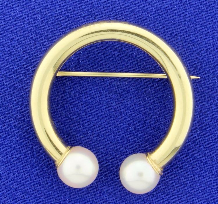 In 14K yellow gold, the pin is 1 1/4 inches long and contains two 7.3mm round pearls with great color and luster. 2.9g