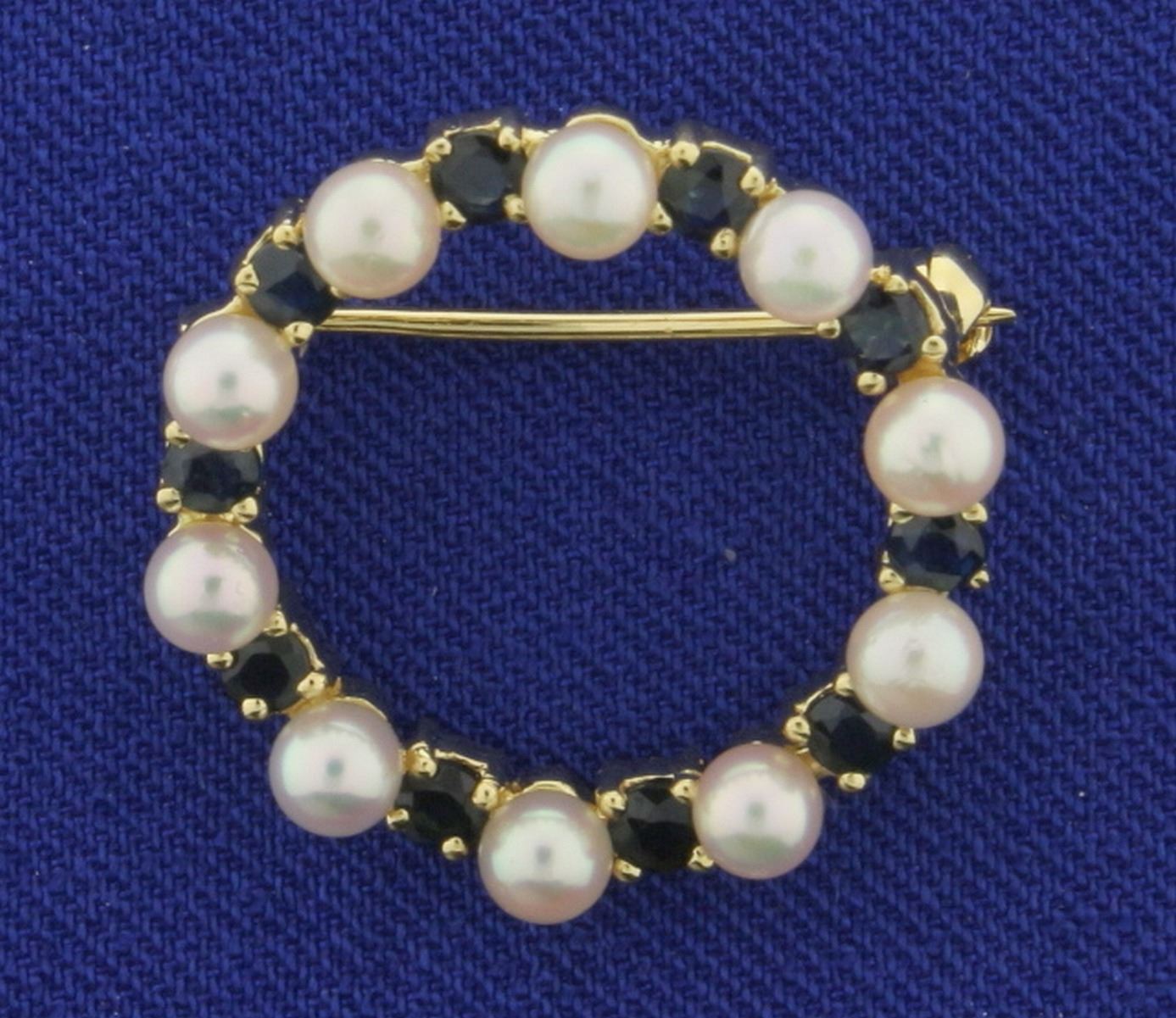 In 14K Yellow Gold. Contains ten natural 2.5mm Sapphire gemstones with deep blue color and excellent clarity. Also contains ten 3mm Pearls with excellent color and luster. 3/4" long diameter. 2.5g