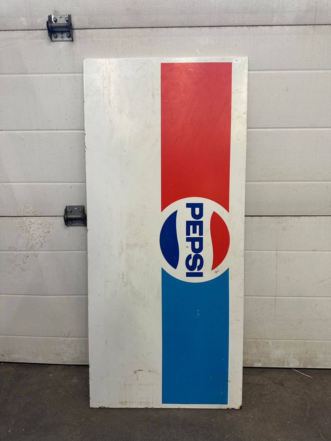 Large metal Pepsi advertising sign in classic red, white, and blue design. Approx. late 20th century. Condition: scratches and age wear.