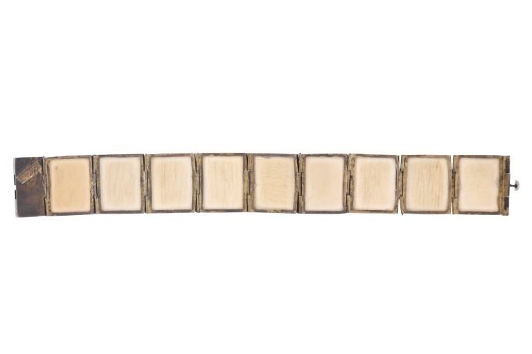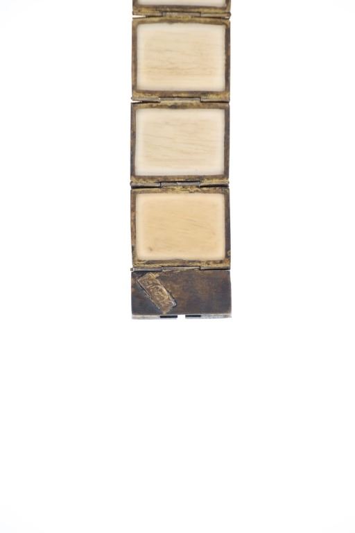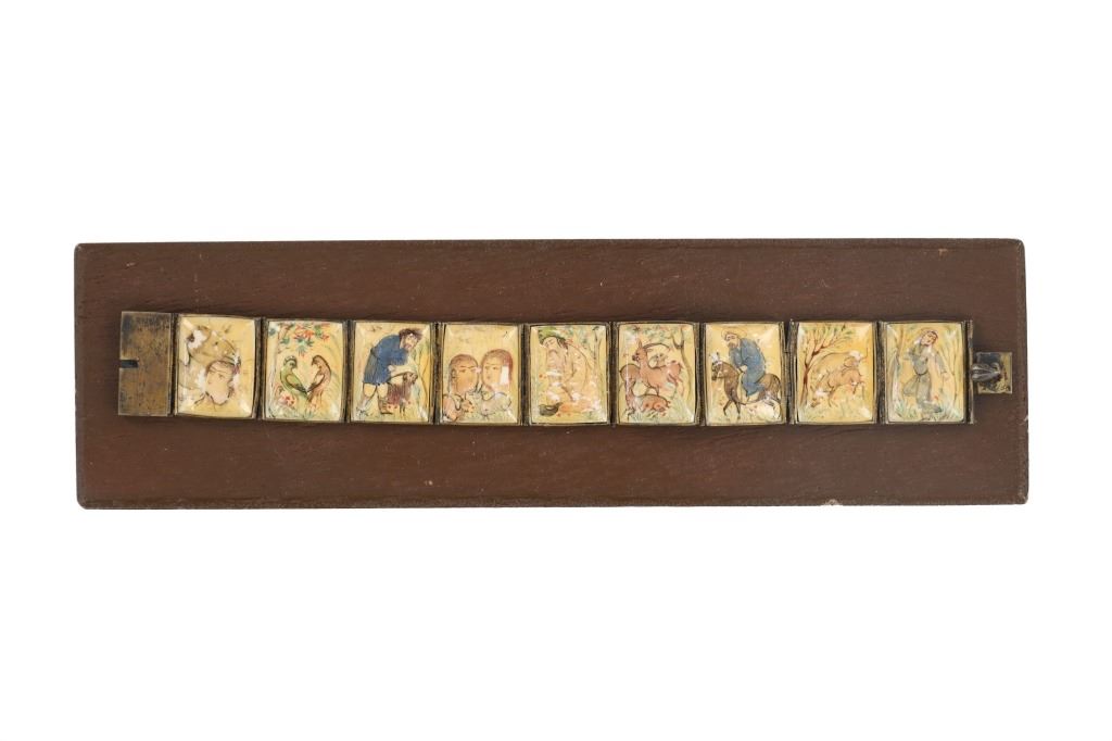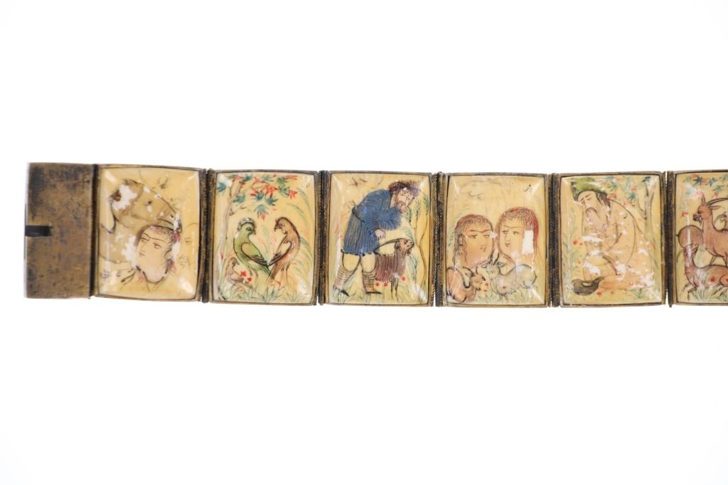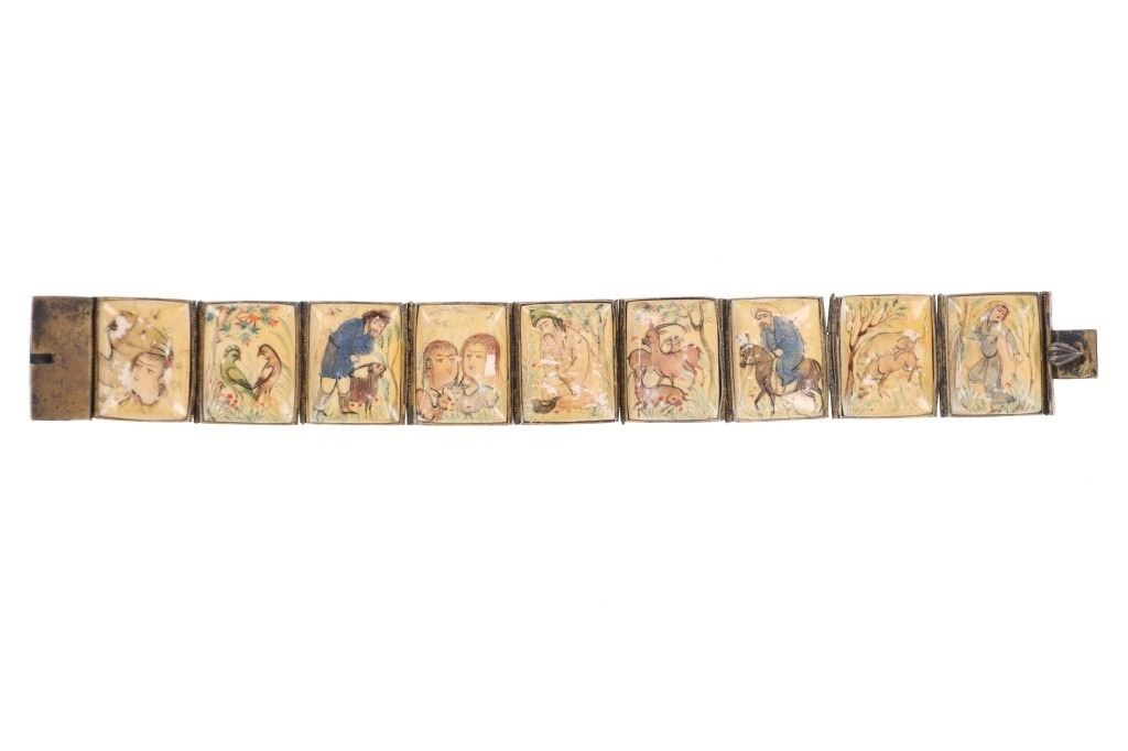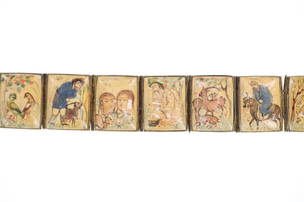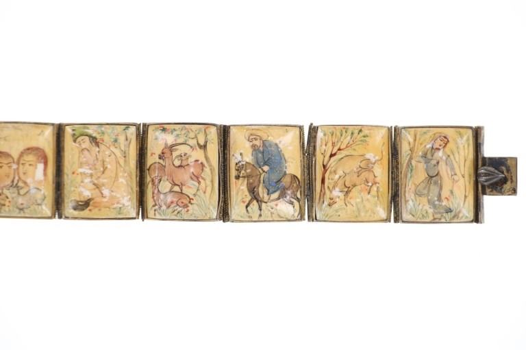 For your consideration is a Vintage Persian Hand-Painted Bone Storyteller Panel Bracelet, circa mid 1900s, World War 2 era. Persian miniature paintings happen most often on paper as illustrations for books or as separate works of art. Miniature paintings became important in Persia (modern day Iran) in the 13th century, and collectors of means kept examples they admired in albums called a “muraqqa.” The faces are youthful, plump, shown in three-quarter profile and most interestingly are not faces normally associated with the Persian people. Instead, they typically resemble visages more commonly associated with Central Asia or China, and this may be because the Persians were greatly influenced by the art from this region after the Mongol conquests. the highest point in the tradition was reached in the 15th and 16th centuries. The tradition continued, under some Western influence, after this, and has many modern exponents. Materials used were often ox bone or mother of pearl. The nine panels tell a story and are ox bone, hand-painted images of people and animals in a wooded area. Frame is a gold-coloured base metal, a small Arabic or Farsi language tag is affixed to back of clasp receiver. Each panel is .75"W x 1"L, bracelet is 8.25"L. Original wood box is painted brown, lid end piece missing. Box is 2.375"W x 8.75"L x 1.125"D
