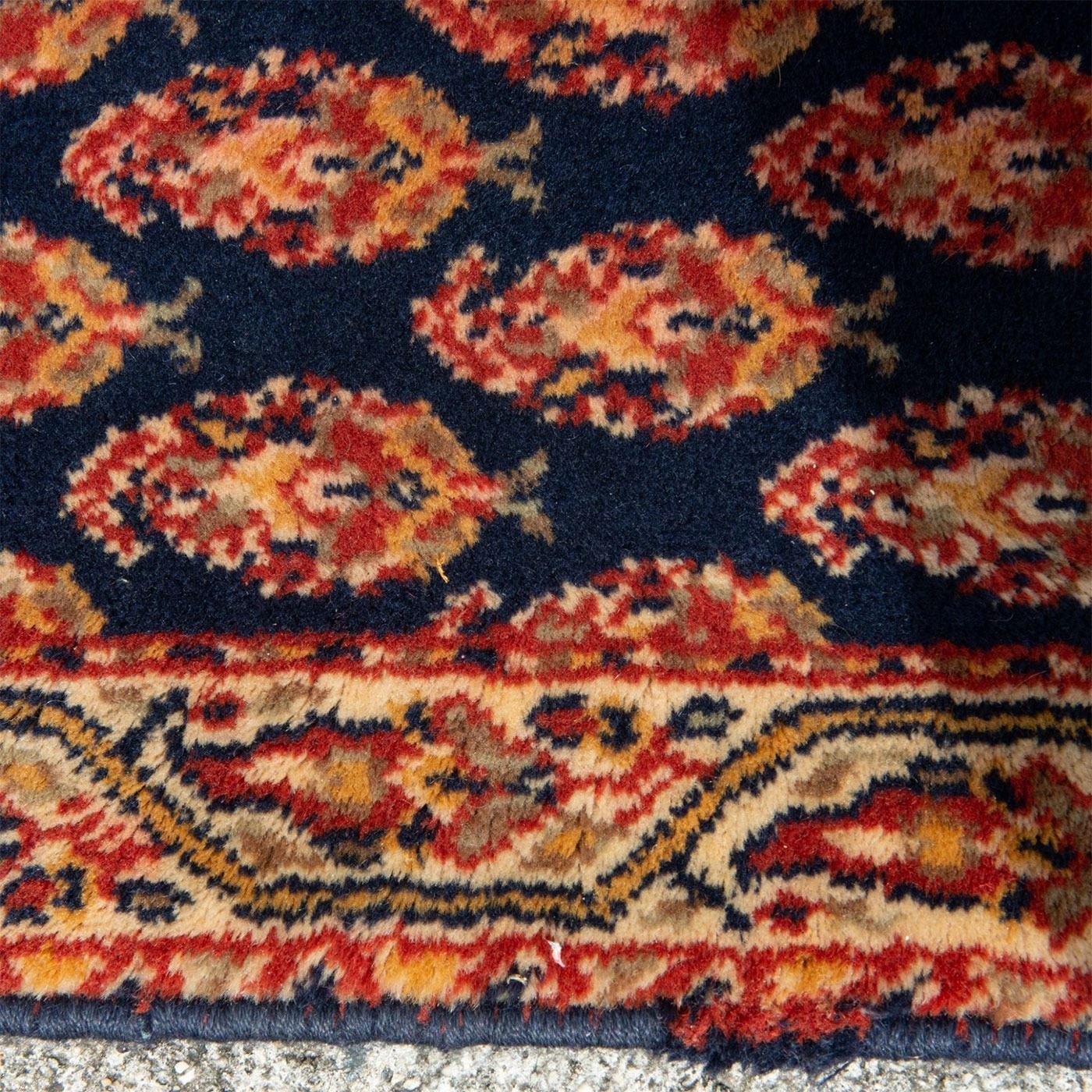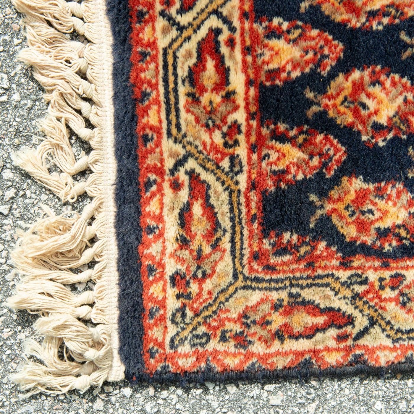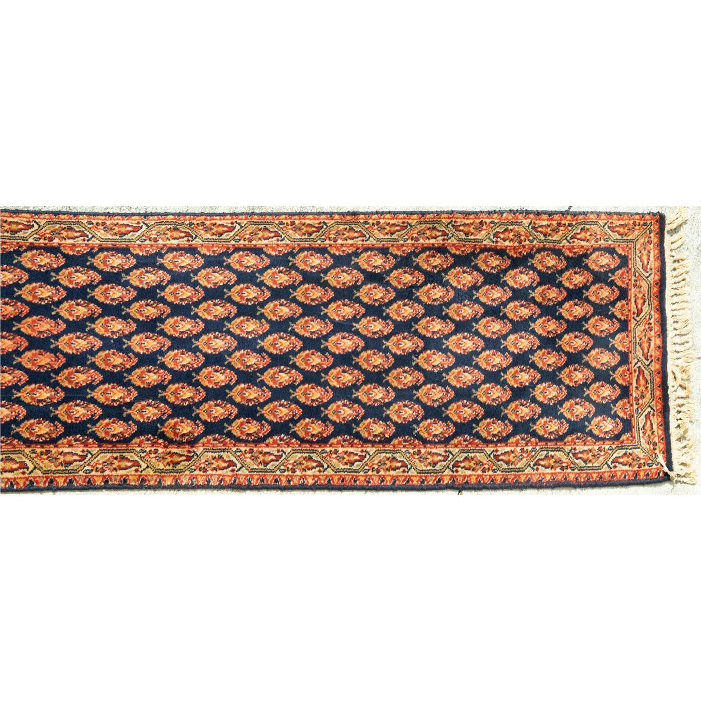 Vintage navy blue and red low pile runner rug with oval floral ageless Persian style patterns. Long knotted beige fringe at either end. 148 in x 25 in. #rugrunner #persian #vintagerug