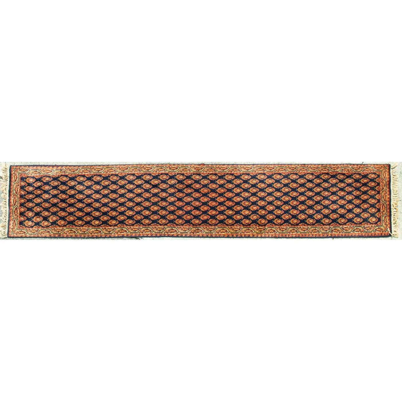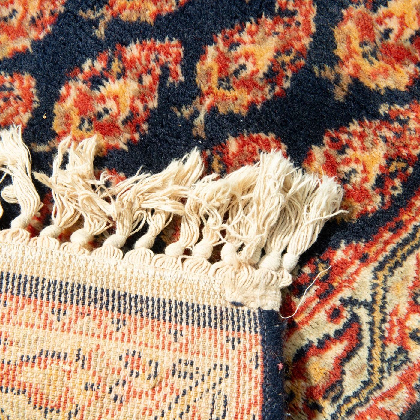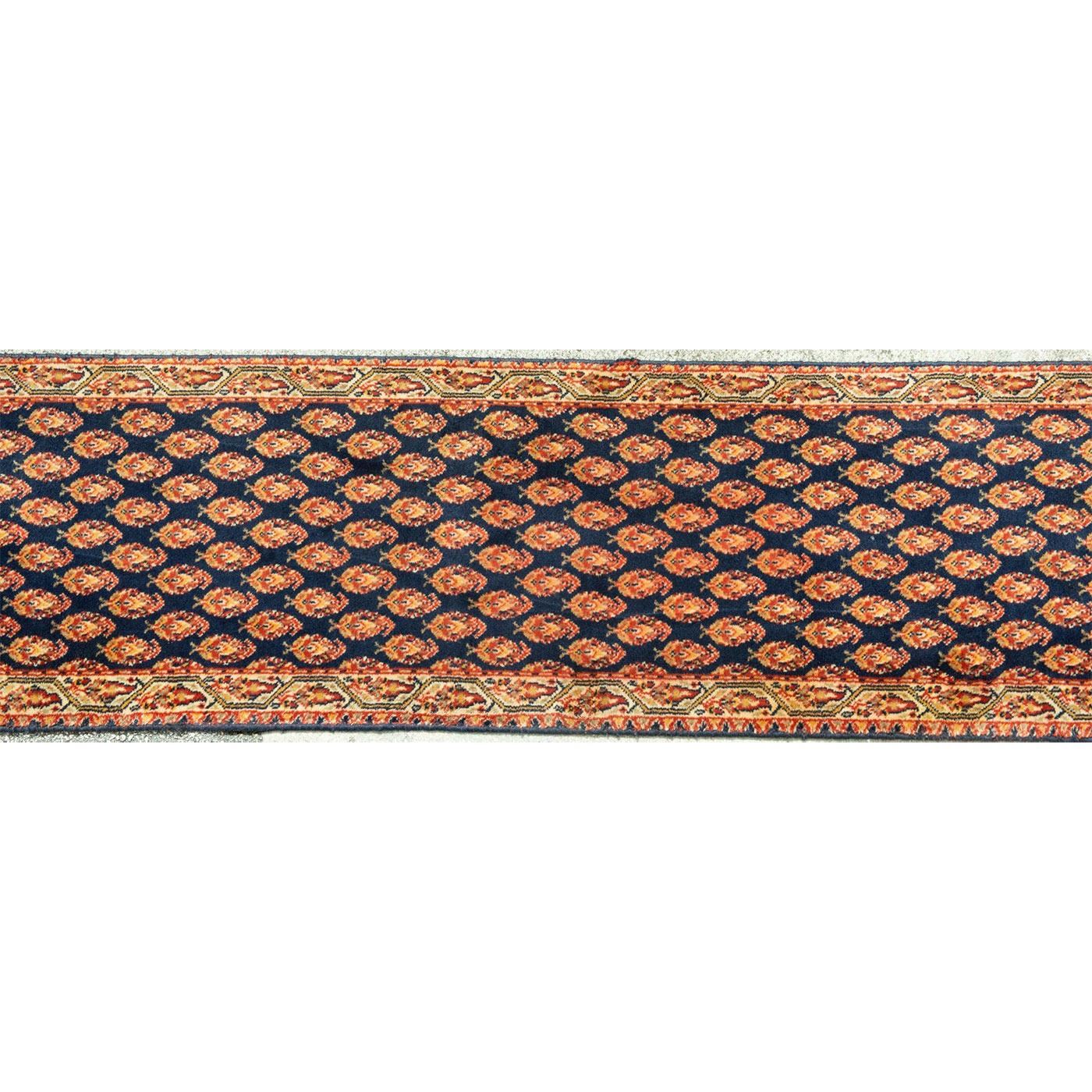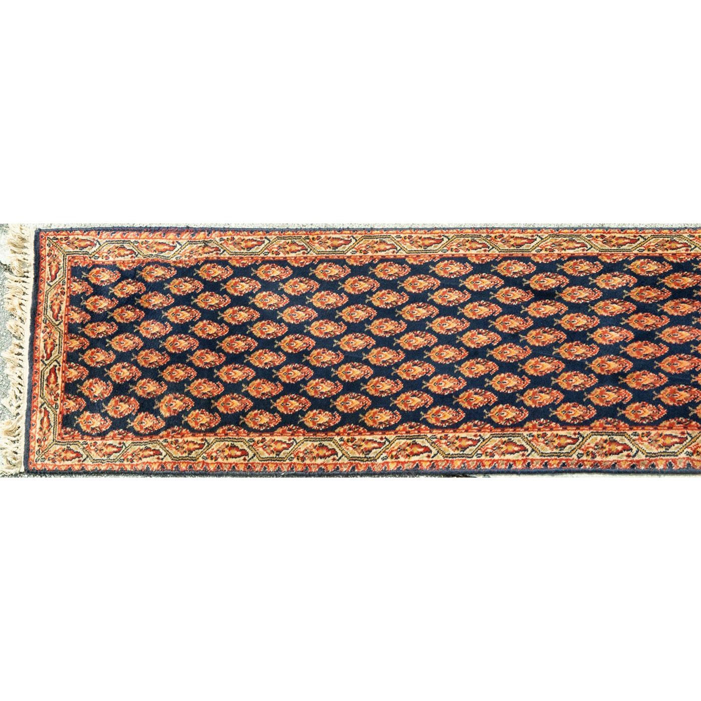 Vintage navy blue and red low pile runner rug with oval floral ageless Persian style patterns. Long knotted beige fringe at either end. 148 in x 25 in. #rugrunner #persian #vintagerug