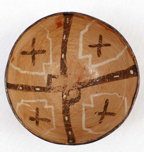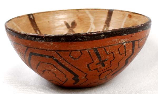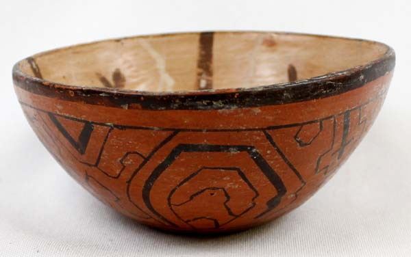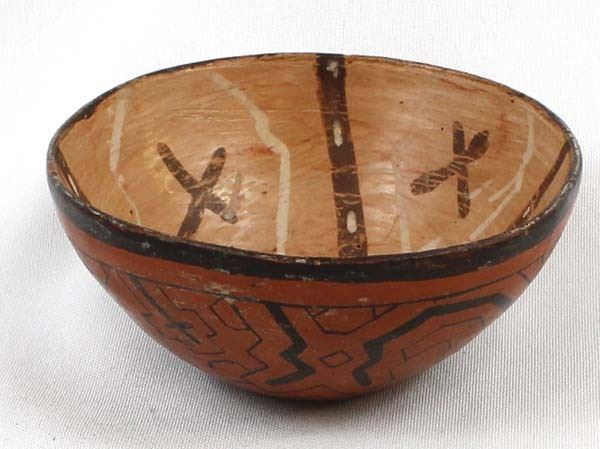 Vintage South American Peruvian Shipibo Pottery Bowl, measures 2''H x 4''D, FYI: ''Along the Ucayali River of Northeastern Peru, women from the Shipibo-Conibo villages have been composing striking, geometric designs to cover pottery, woodcarvings, and textiles for over twelve hundred years. Each woman must design her own pattern that both expands upon the work of her ancestors and remains faithful to a highly traditional style. She will then use that pattern to decorate the crafts she makes throughout her life. The Shipibo people are remarkable because they are not only one of the few indigenous groups where women are the primary artists, but they also have an elaborate rite of passage ceremony marking women's transition into puberty, as opposed to a more common male-based celebration.''
