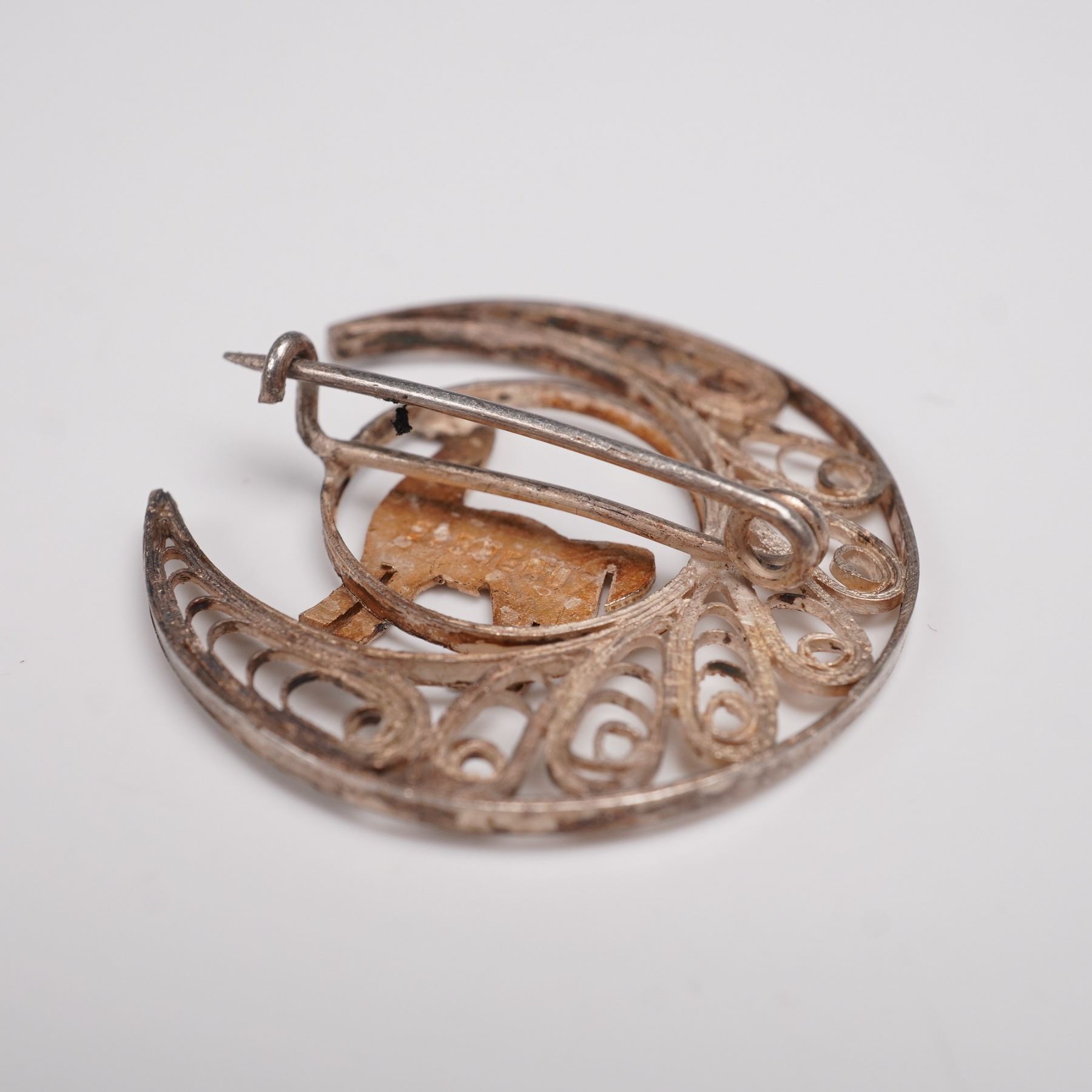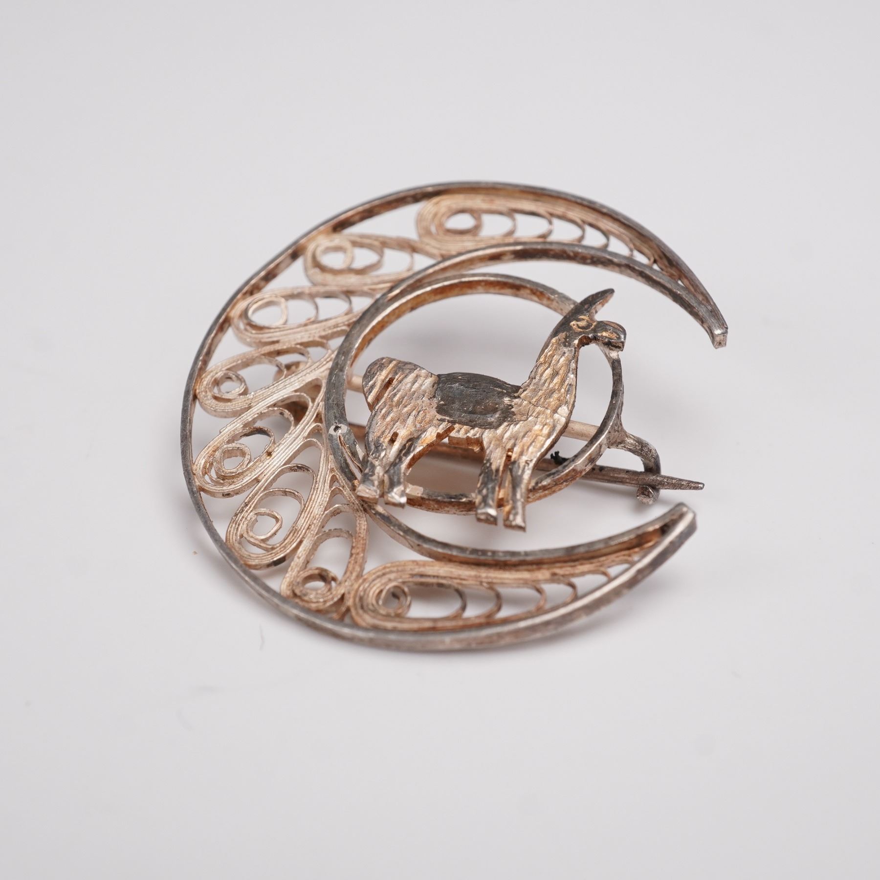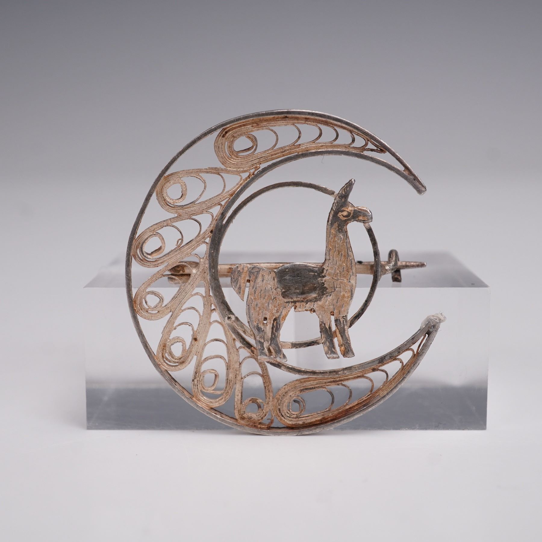 A vintage Peruvian silver filigree brooch featuring a finely detailed standing llama within a crescent moon frame, the outer edge decorated with delicate scrolling wirework. The reverse retains a partial label stamped Peru, along with 925. Weight 3.36 g.
