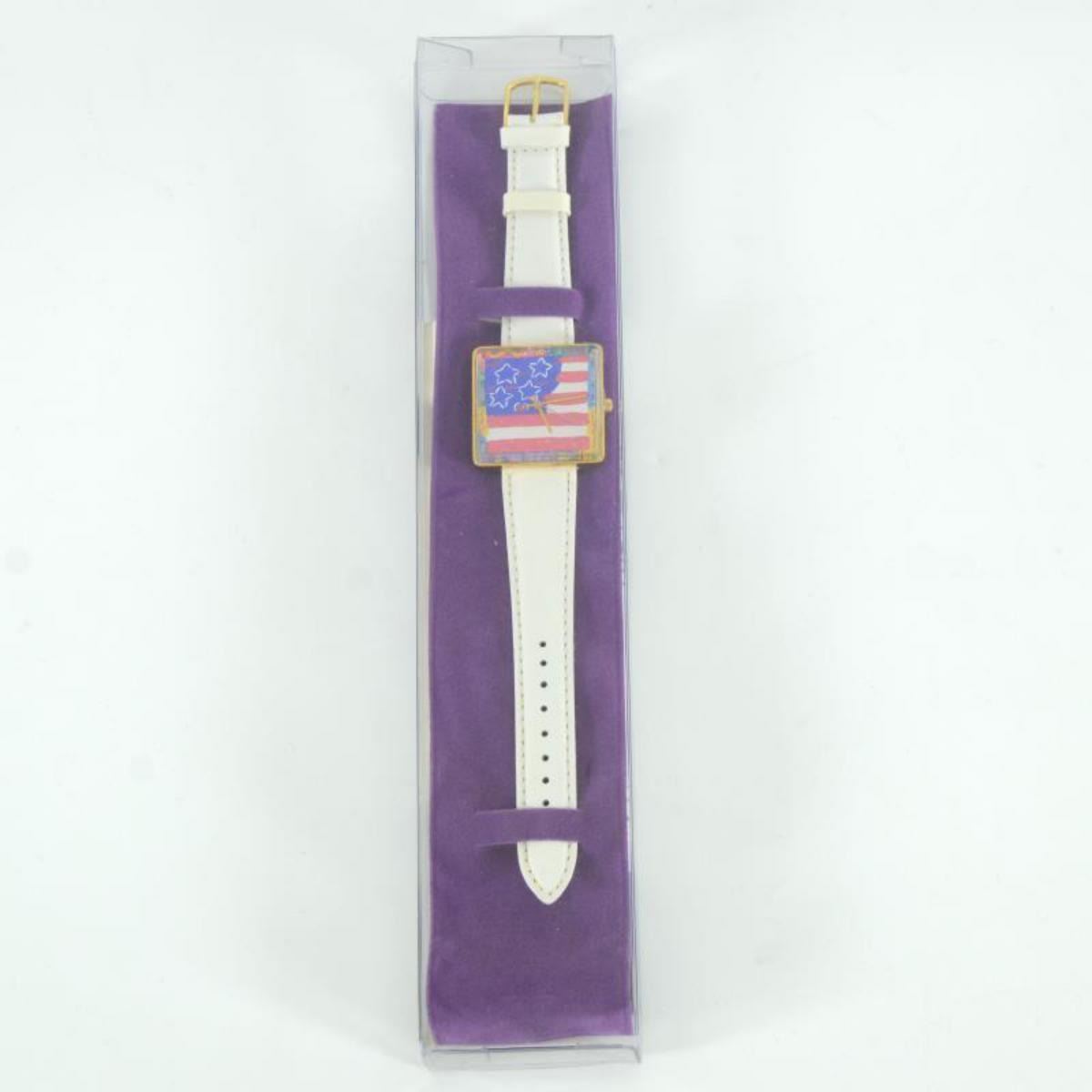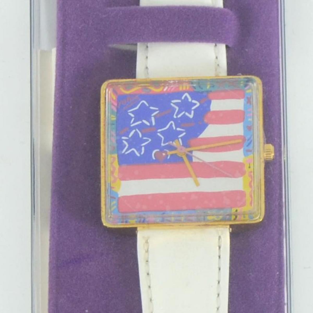 This is a vintage Peter Max "American Flag" wrist watch created for the Japanese market in 1991. This watch comes in the original packaging and with paperwork. Due to the age of the watch the battery will need to be replaced. A replacement battery will be included in this auction complementary. Measures approx. 1.5" x 1.5" (watch face). Reference #: 237991.