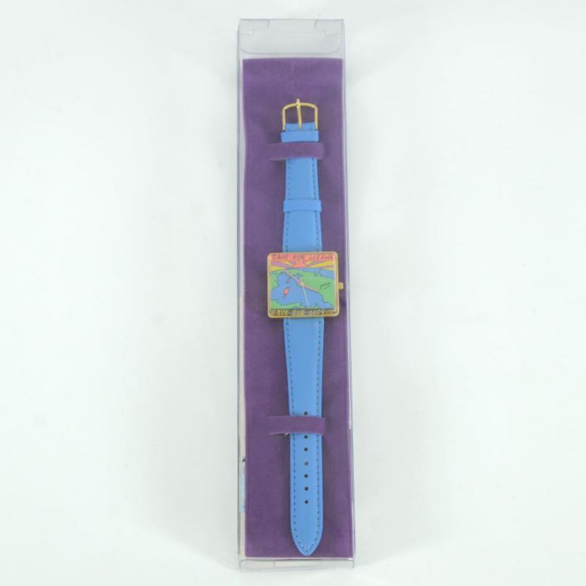 This is a vintage Peter Max "Save Our Oceans" wrist watch created for the Japanese market in 1991. This watch comes in the original packaging and with paperwork. Due to the age of the watch the battery will need to be replaced. A replacement battery will be included in this auction complementary. Measures approx. 1.5" x 1.5" (watch face). Reference #: 237988.