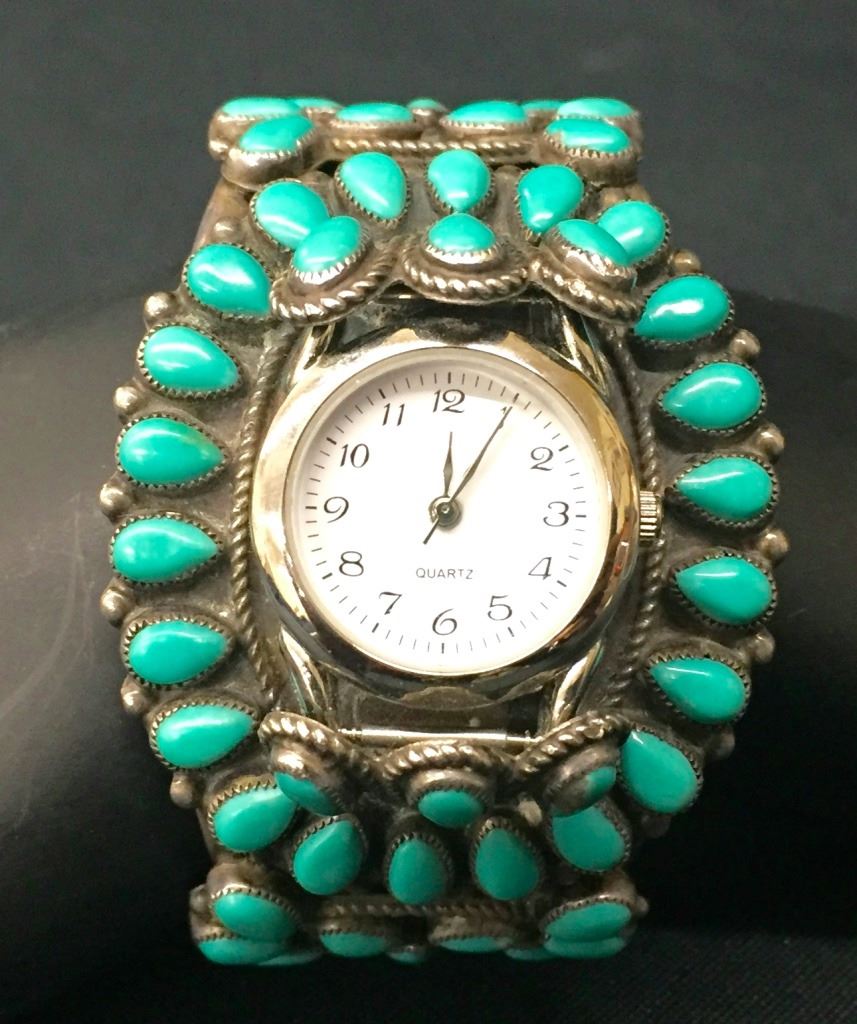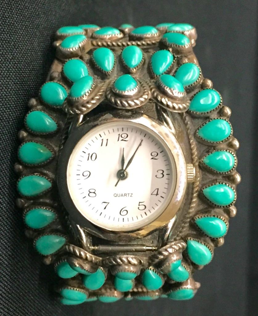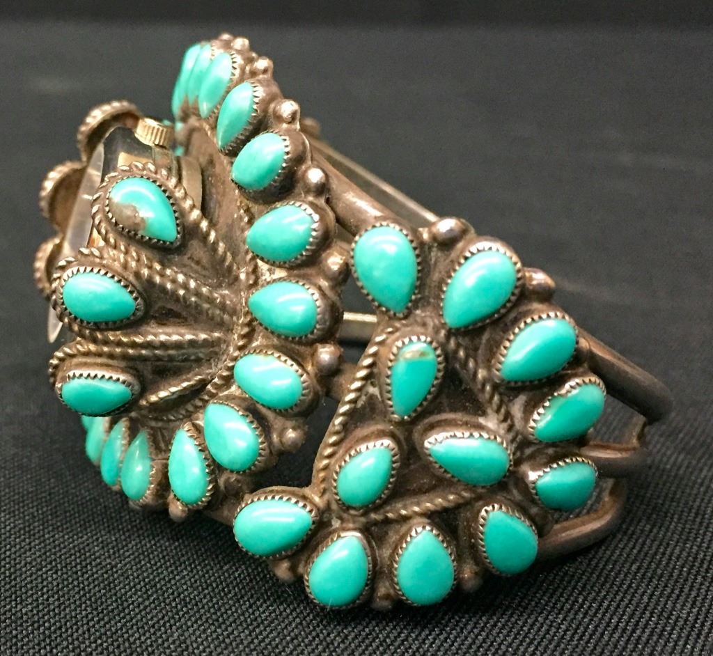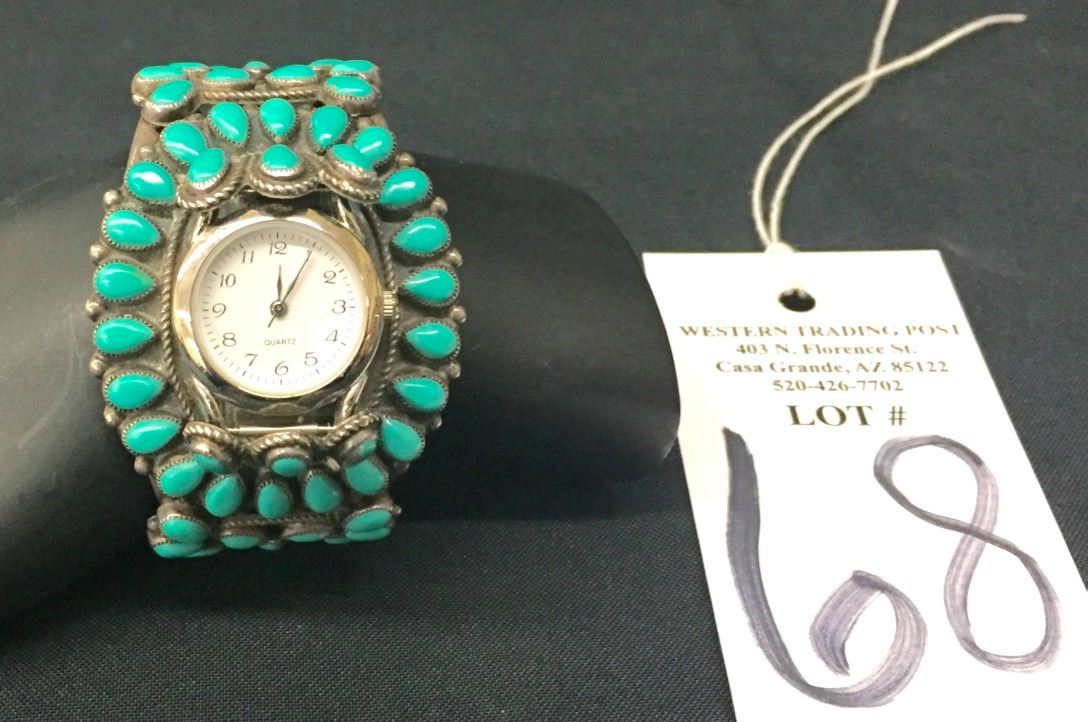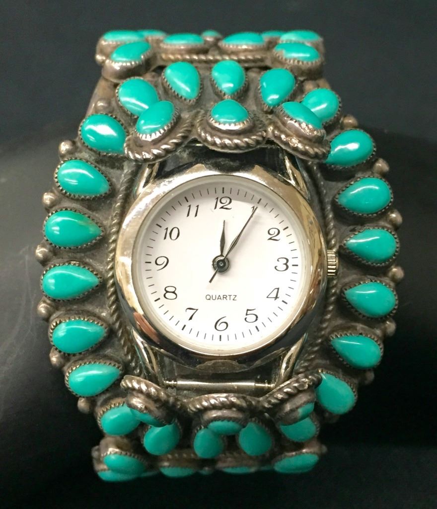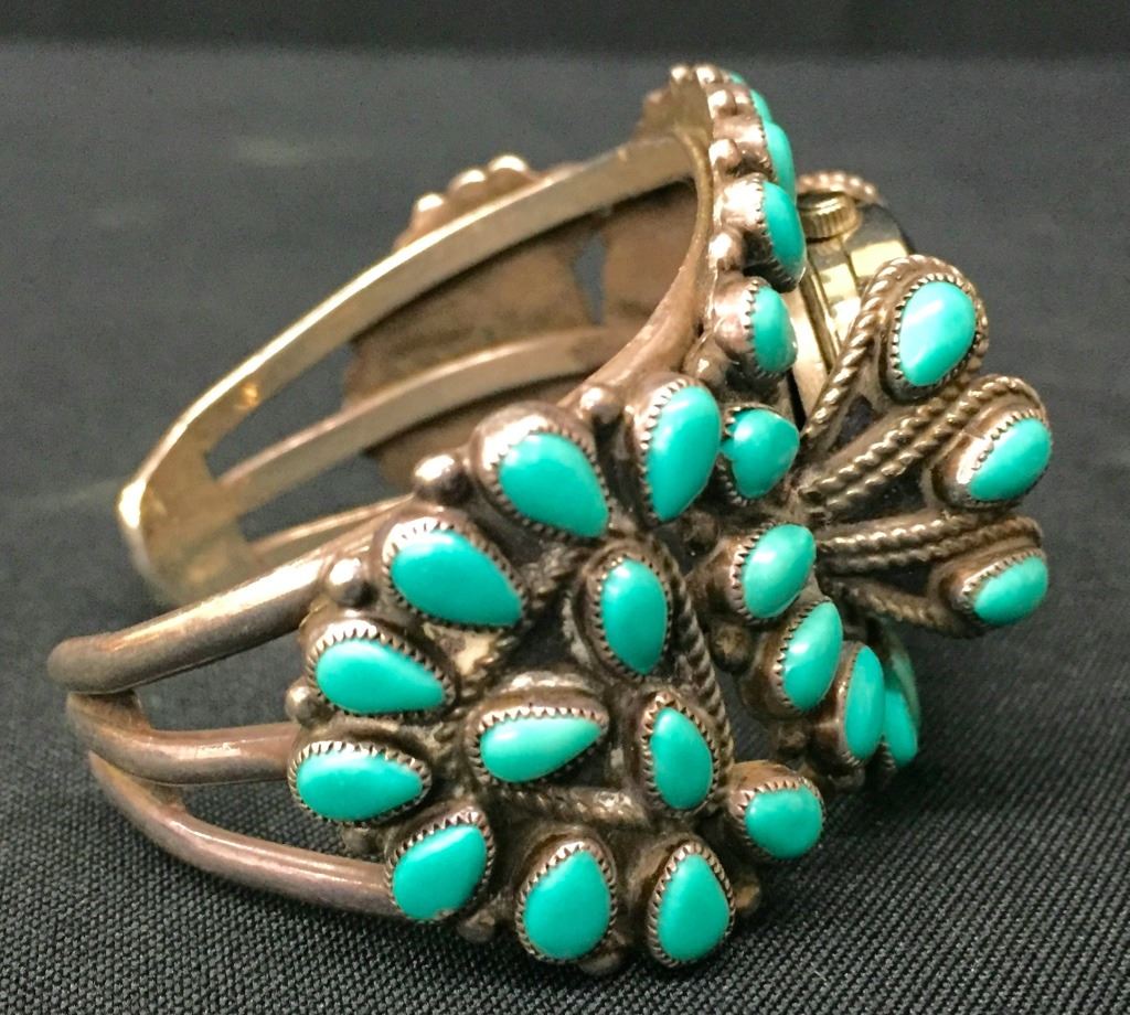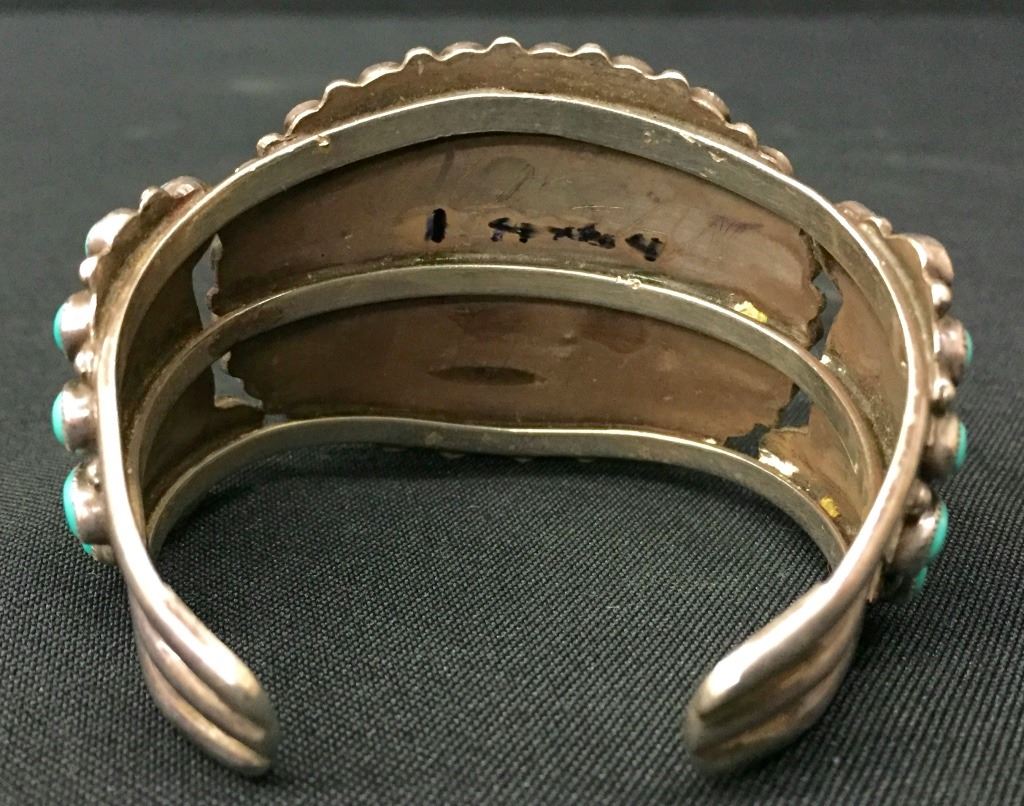 This sterling, vintage Navajo watch cuff measures 5.25 inches inside plus there is a 1 inch opening. It measures 1.75 inches at the widest point and weighs 70.3 g. Signed AB (could be a number of different artist). Please look closely at pics - they are an important part of our description. Shipping: There will be a $5 handling / packaging fee for shipping this lot. The actual cost of postage will be added on top of that.
