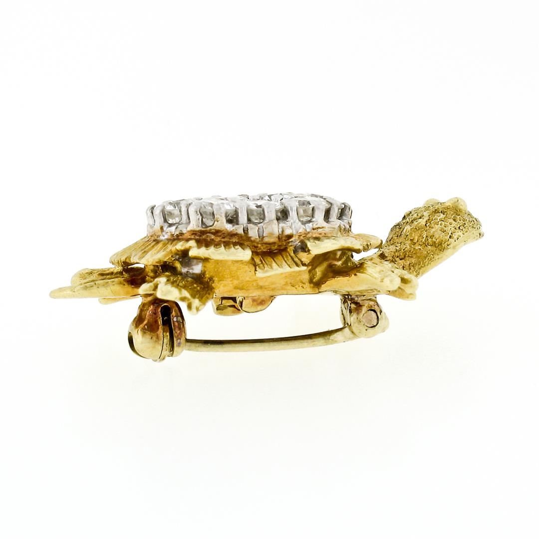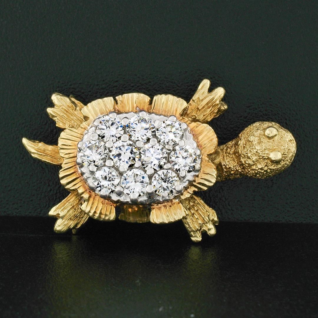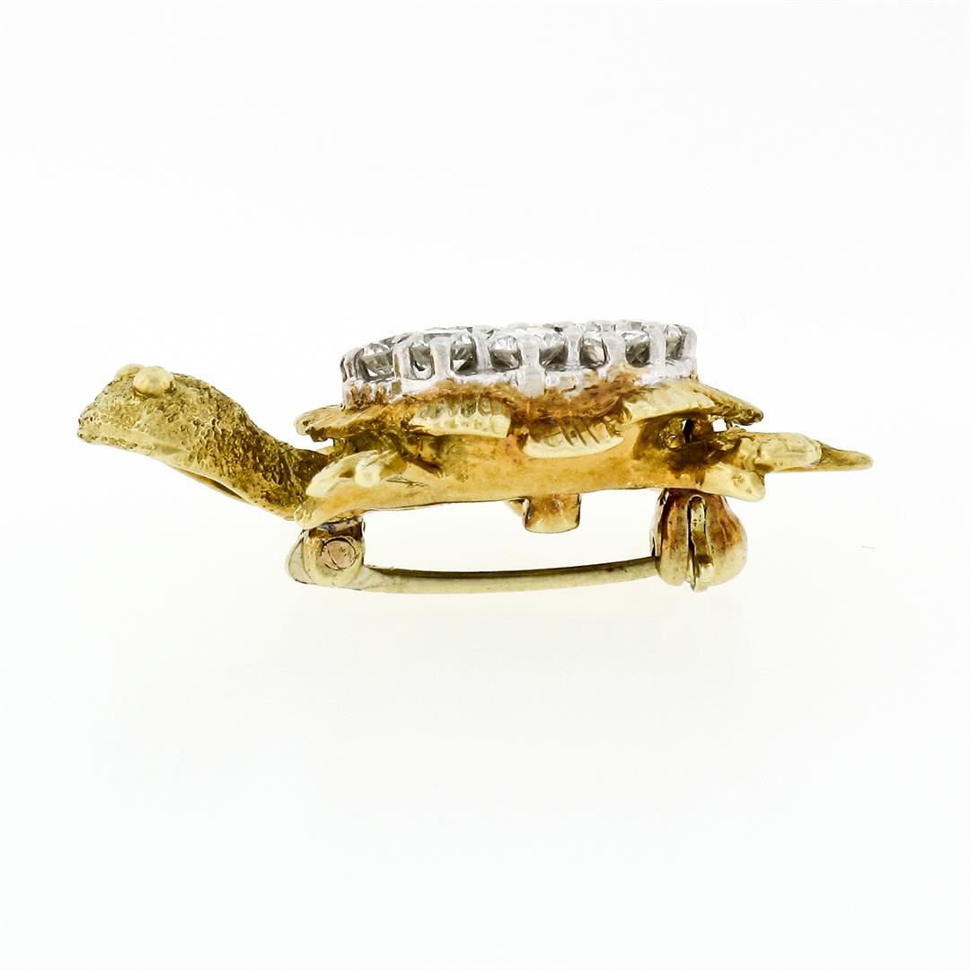 A vintage, petite, solid 18k two tone gold textured turtle brooch pin with 10 round brilliant cut natural diamonds (F/G - VS1/VS2; 1.00ctw). Measures 28.22x16.86mm and weighs a total of 5.77 grams.