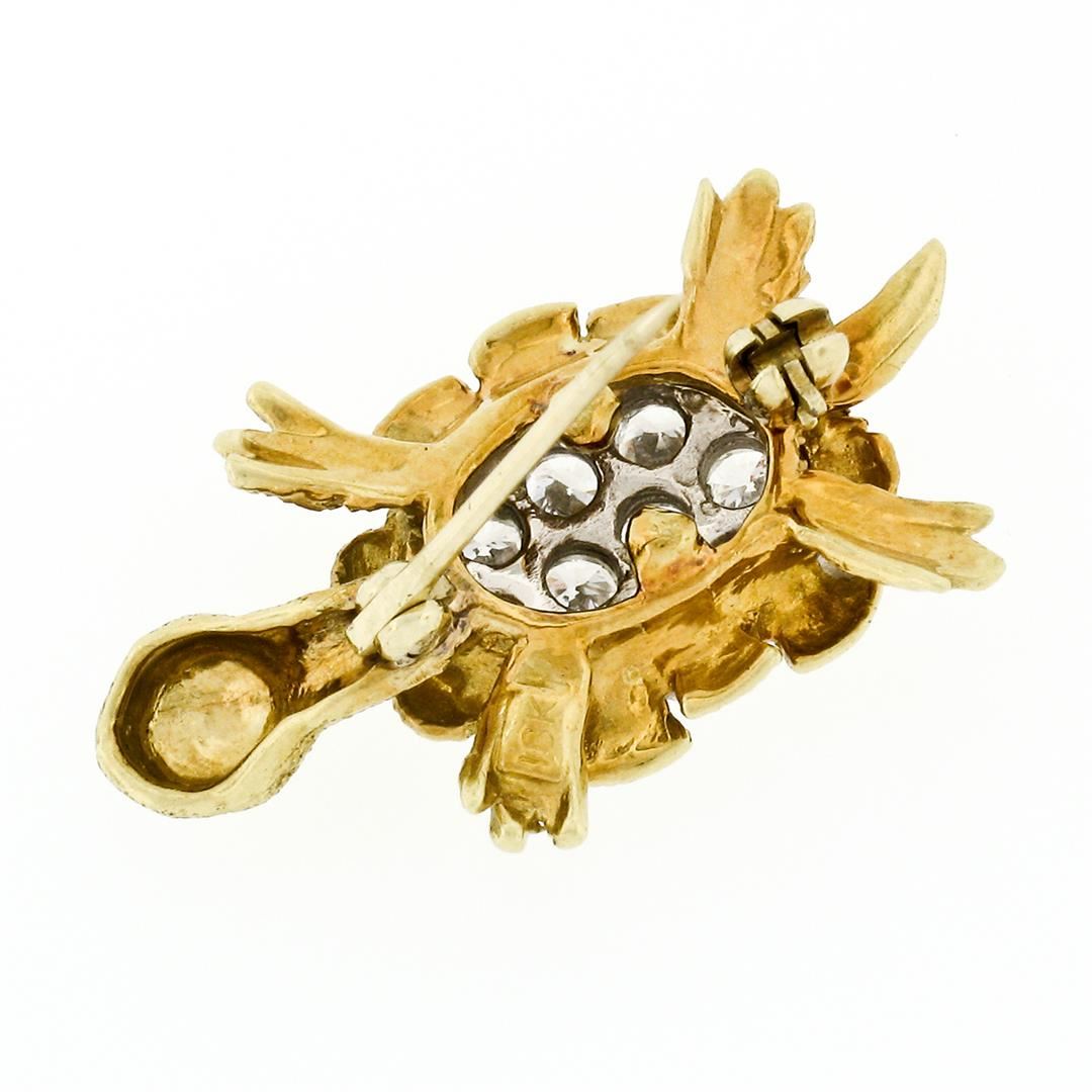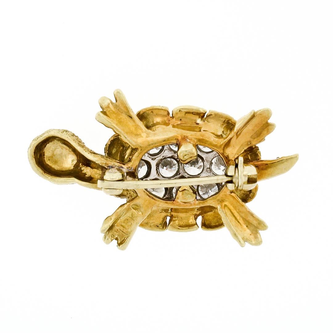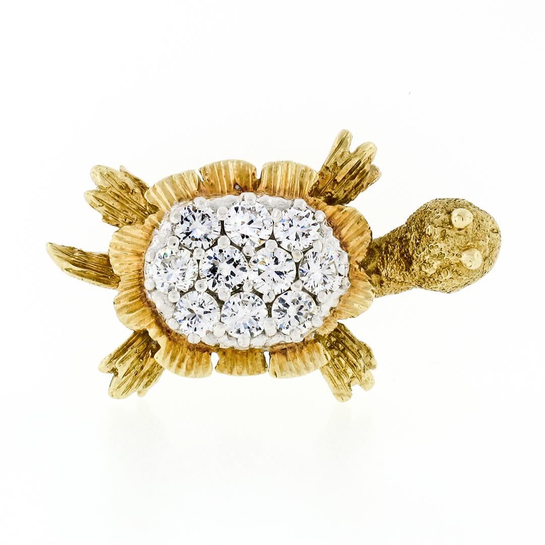 A vintage, petite, solid 18k two tone gold textured turtle brooch pin with 10 round brilliant cut natural diamonds (F/G - VS1/VS2; 1.00ctw). Measures 28.22x16.86mm and weighs a total of 5.77 grams.