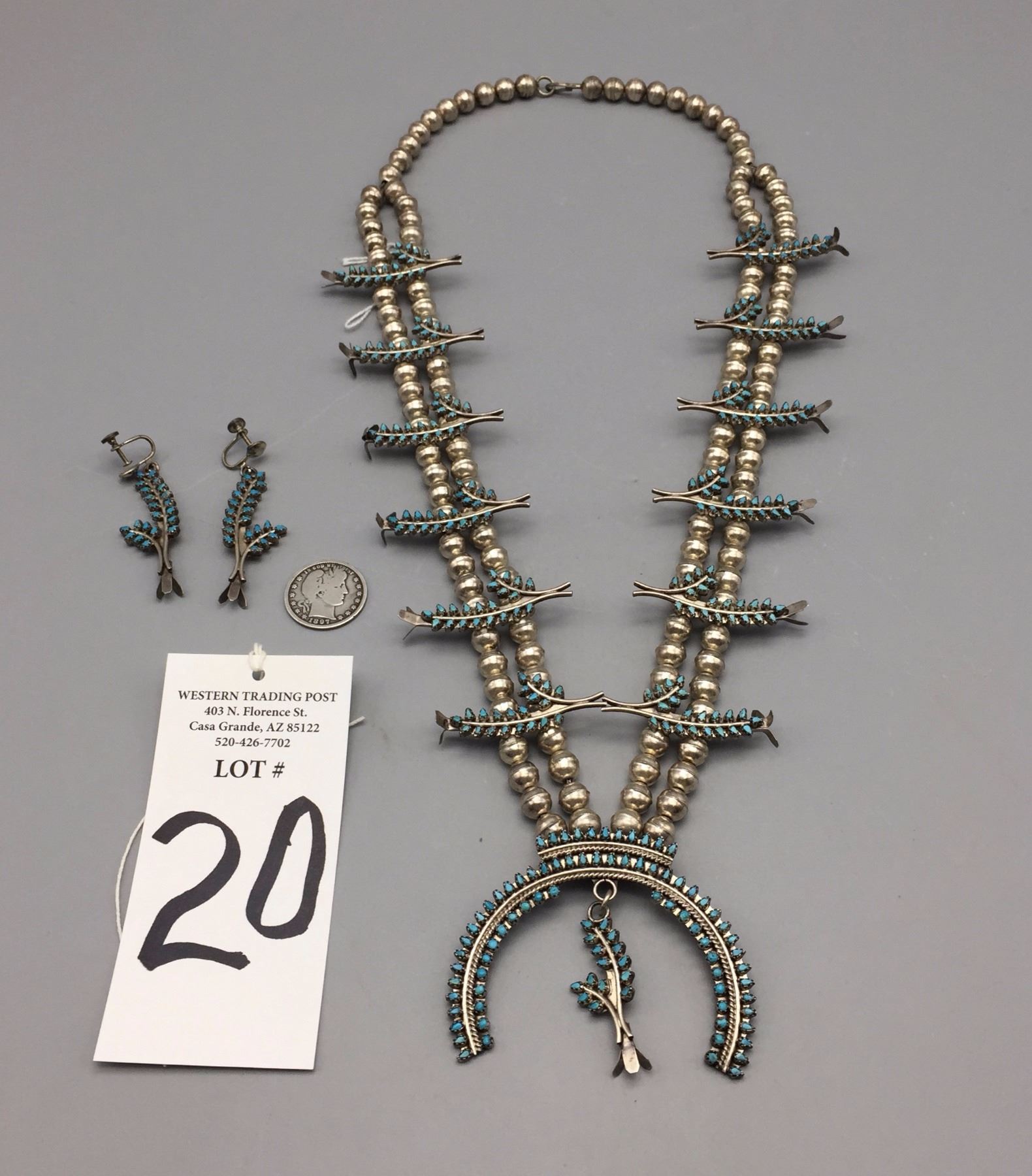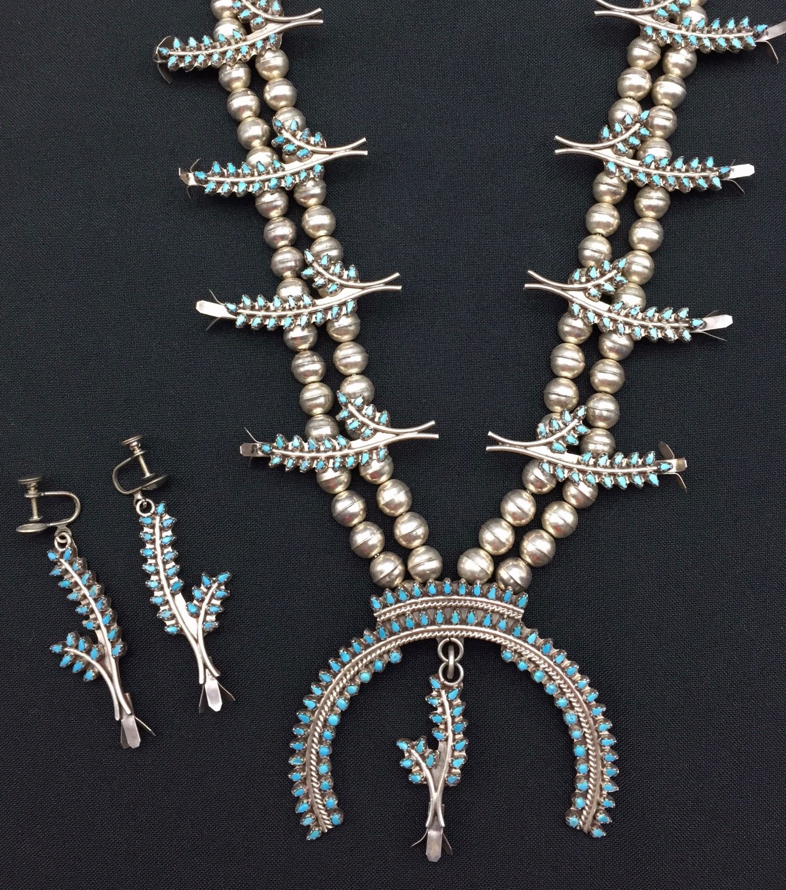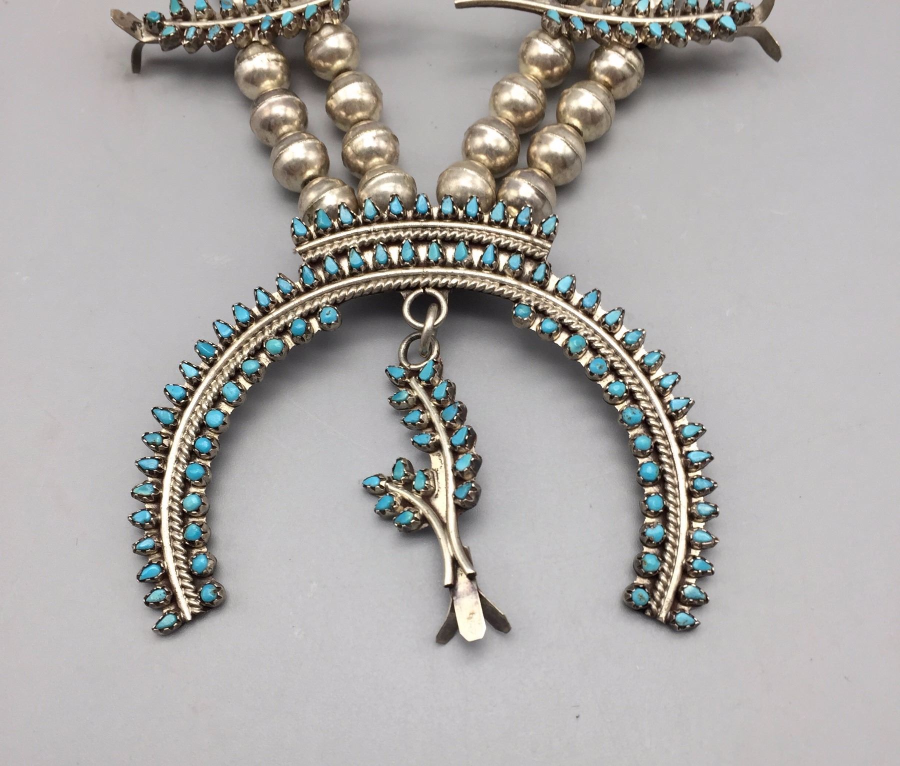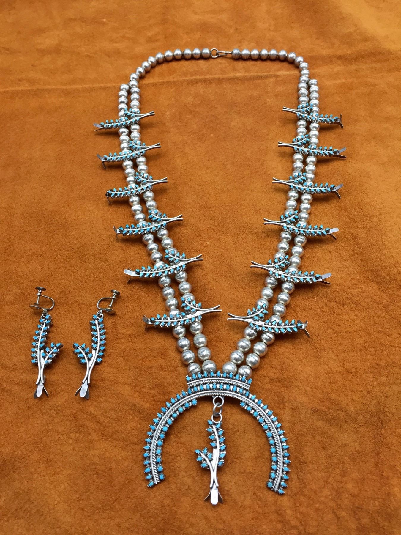 Maker: Unmarked, but vintage Zuni. Approx. Age: Circa 1960s. Size: Necklace fits 26” around the neck, naja is 2 3/4” w x 2 1/2” l. Earrings are 3/4” w x 2 1/4” long. Lot weighs 161.7 g. Additional Info: Nice, vintage Zuni, petitpoint turquoise squash blossom necklace and matching (screw-back) earring set. Condition: Good for their age, normal wear expected. Please look closely at the pictures - they are an important part of our description. Shipping: There will be a $5 handling / packaging fee for shipping this lot. The actual cost of postage will be added on top of that.