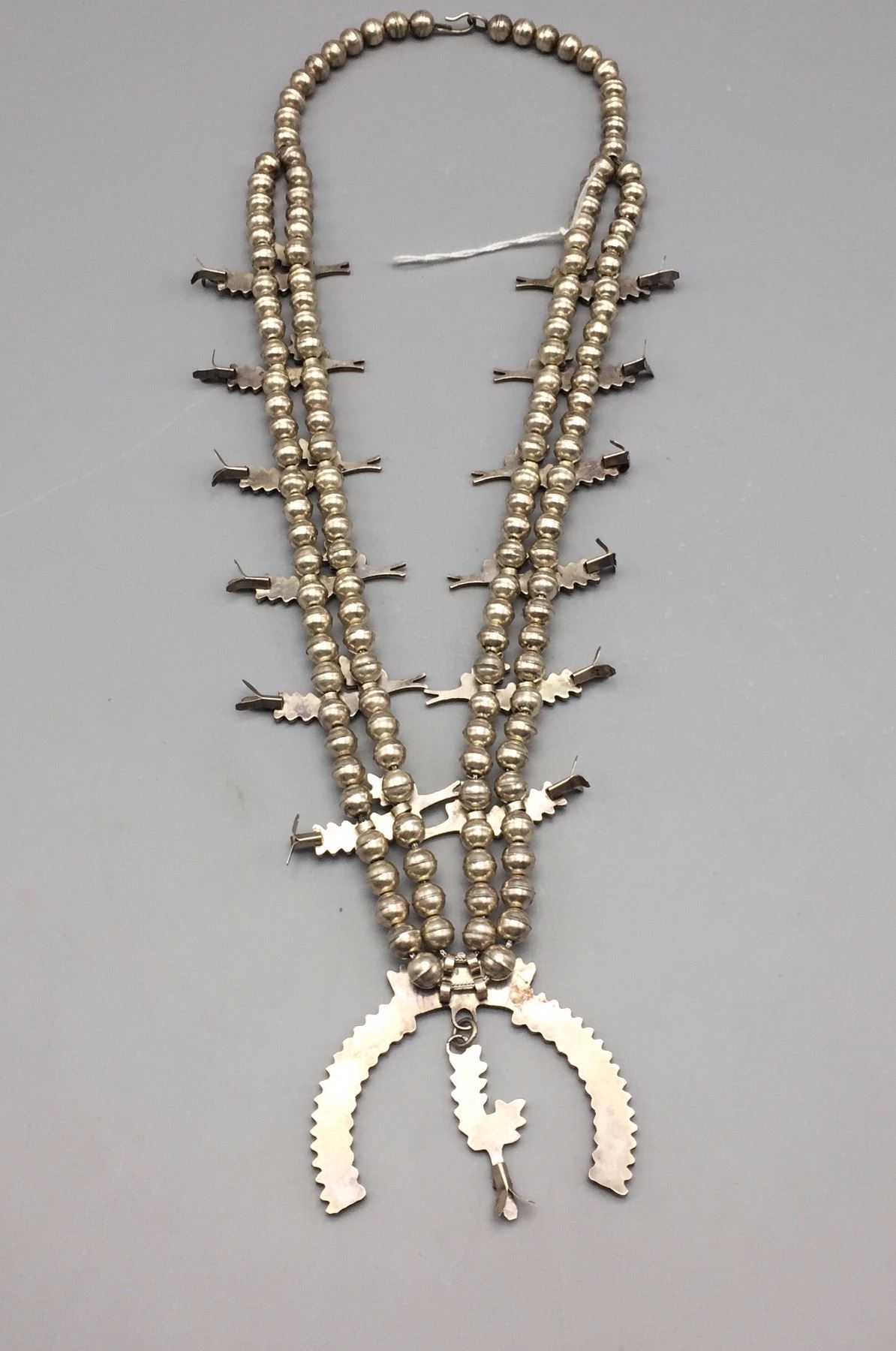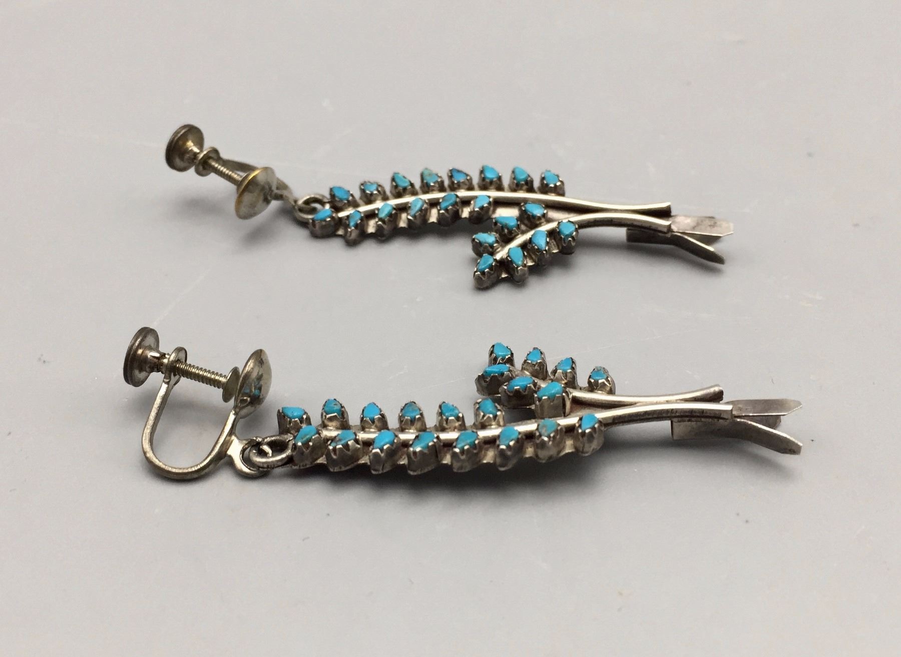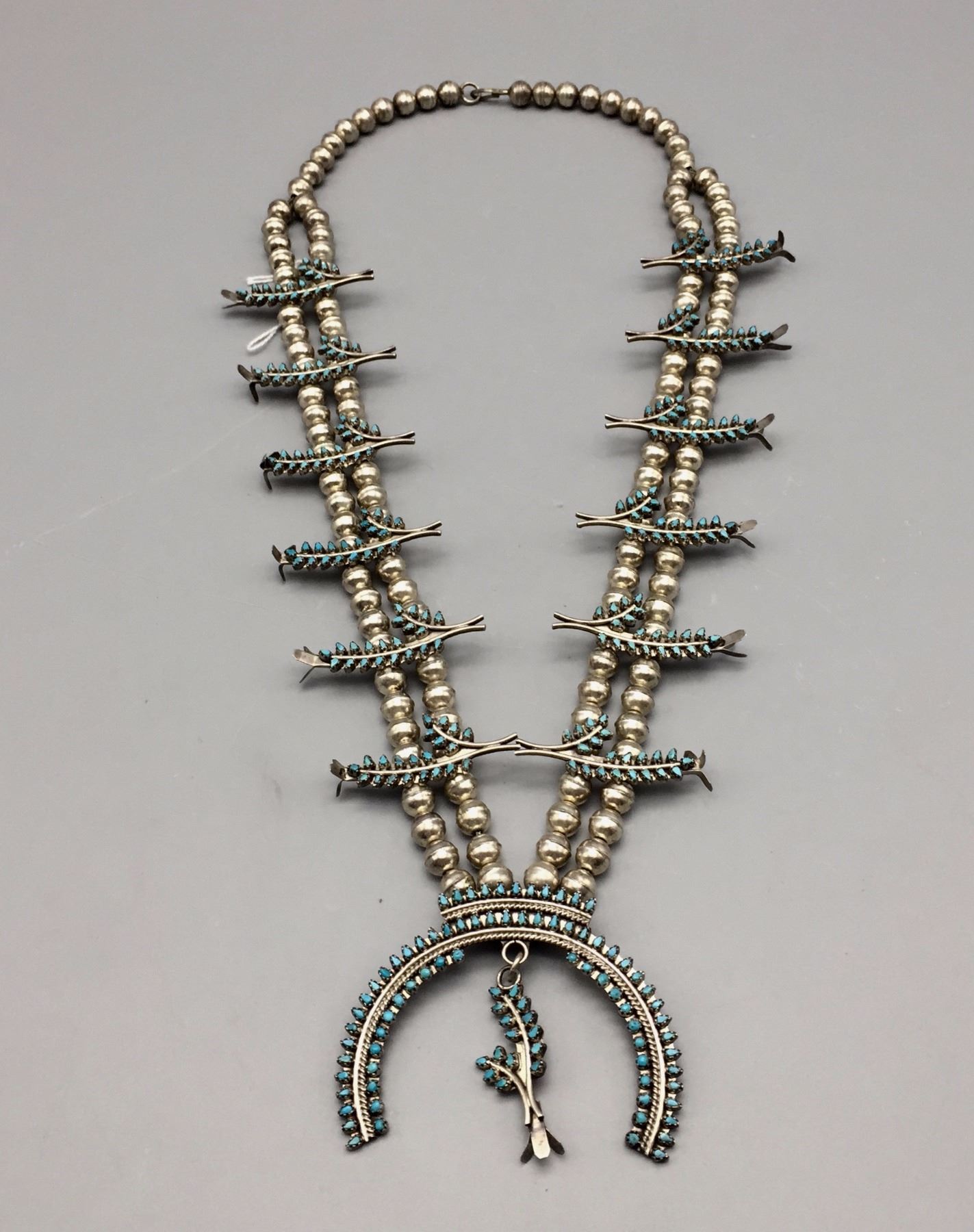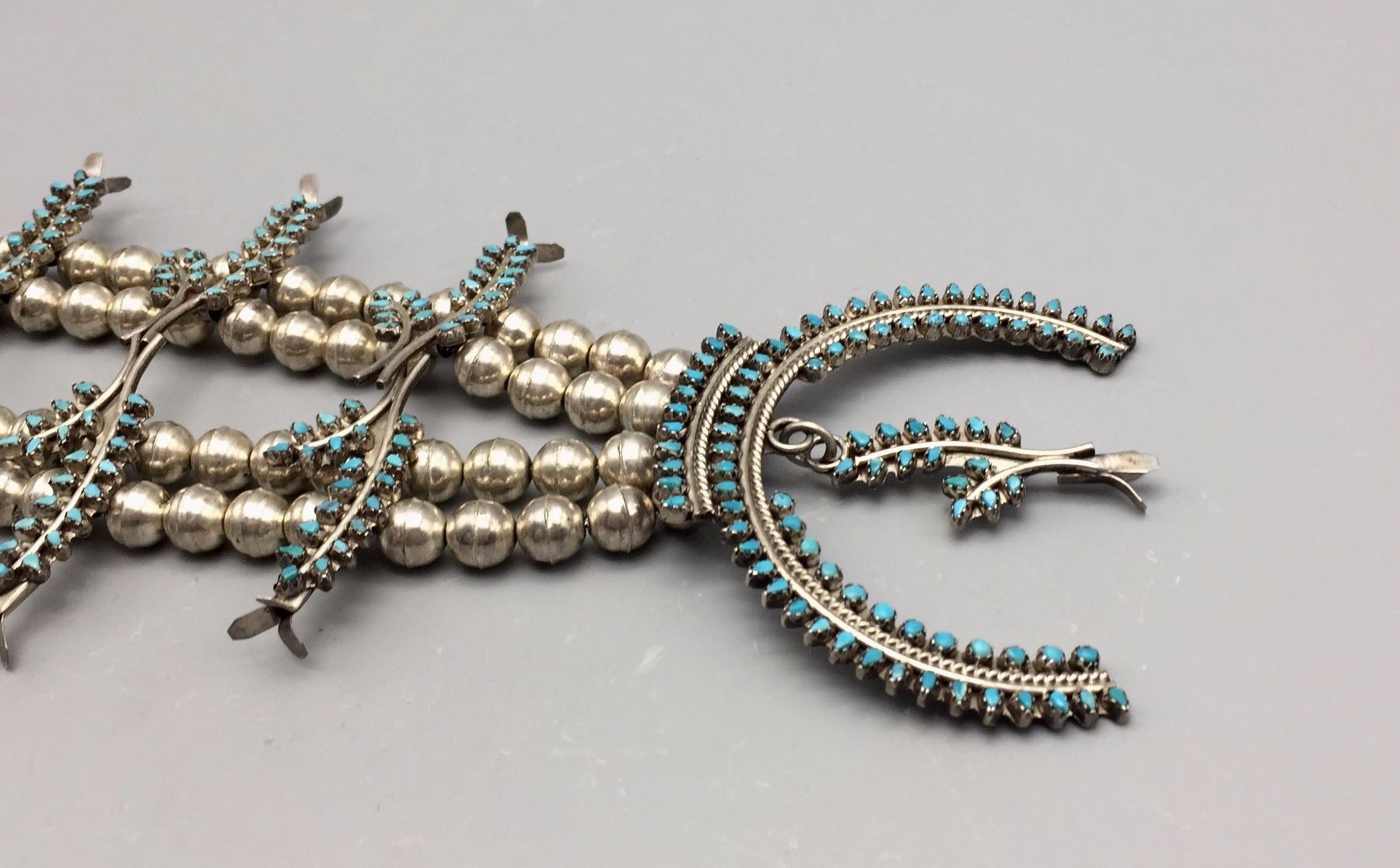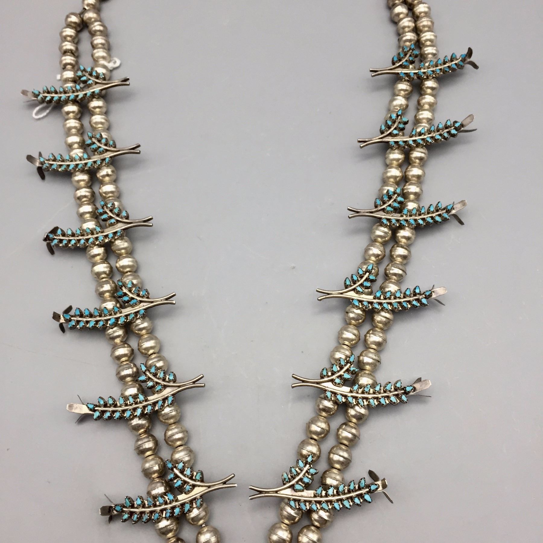 Maker: Unmarked, but vintage Zuni. Approx. Age: Circa 1960s. Size: Necklace fits 26” around the neck, naja is 2 3/4” w x 2 1/2” l. Earrings are 3/4” w x 2 1/4” long. Lot weighs 161.7 g. Additional Info: Nice, vintage Zuni, petitpoint turquoise squash blossom necklace and matching (screw-back) earring set. Condition: Good for their age, normal wear expected. Please look closely at the pictures - they are an important part of our description. Shipping: There will be a $5 handling / packaging fee for shipping this lot. The actual cost of postage will be added on top of that.