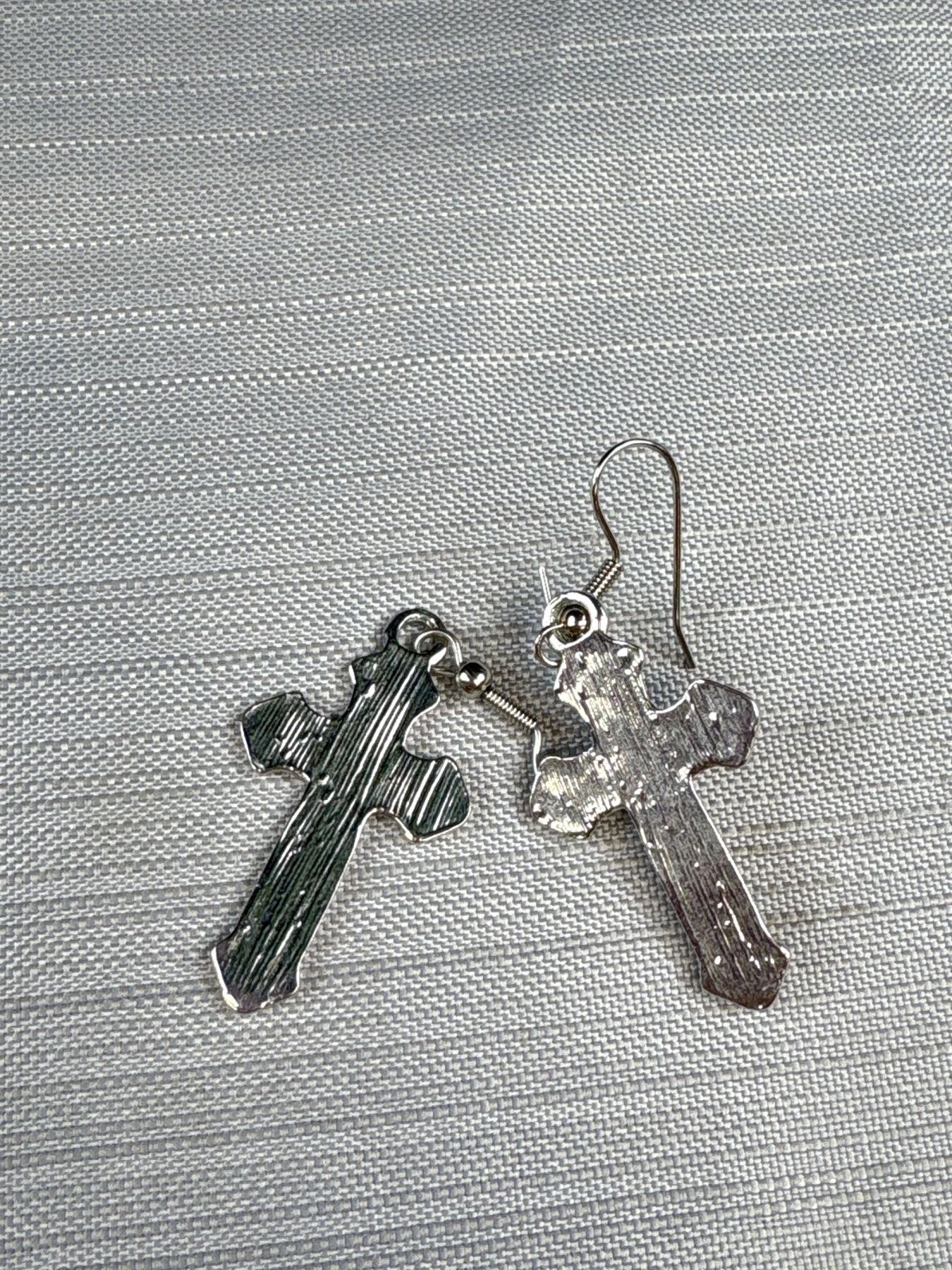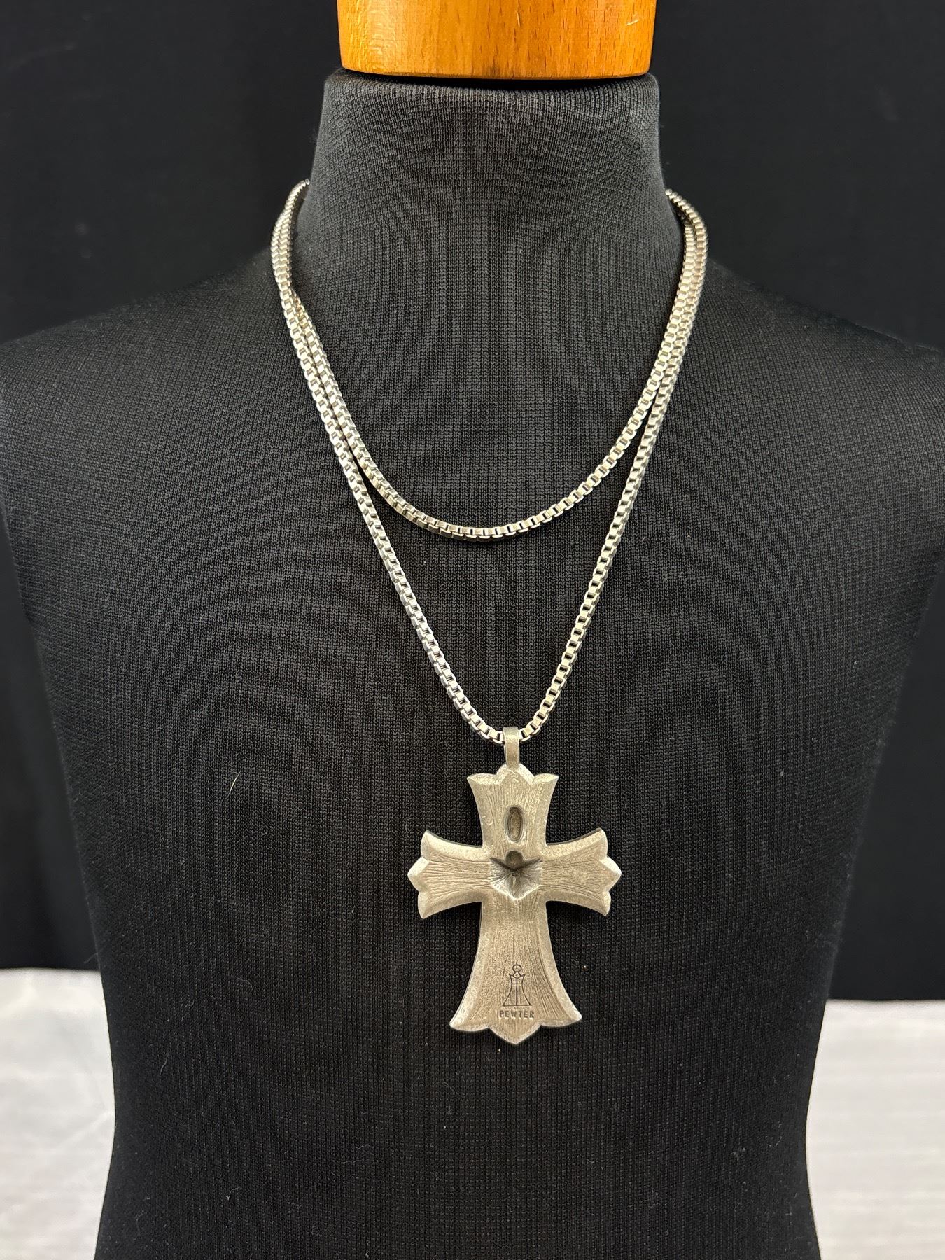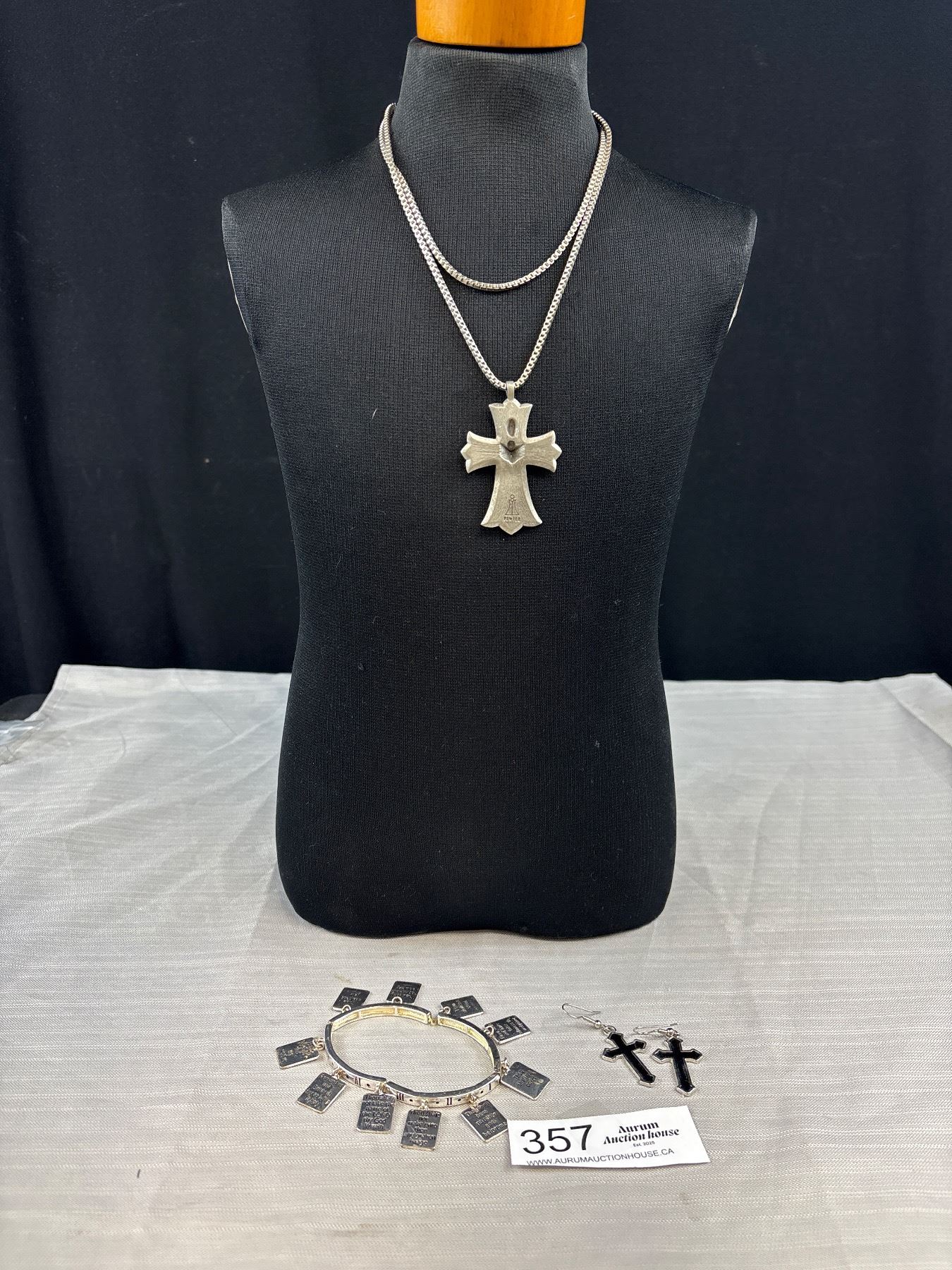 Vintage Pewter Cross w/ Chain Necklace 10 Comm. Bracelet + Pair Cross Earrings