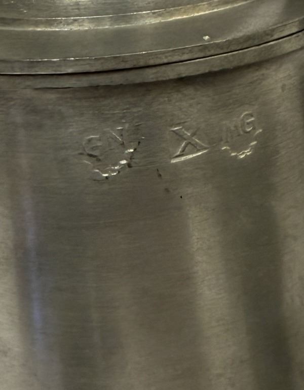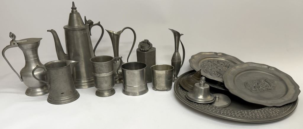 Item/Description: Includes 15 pewter pieces including a variety of serving platters, cups, and decanters. Some hallmarked GN x MG.