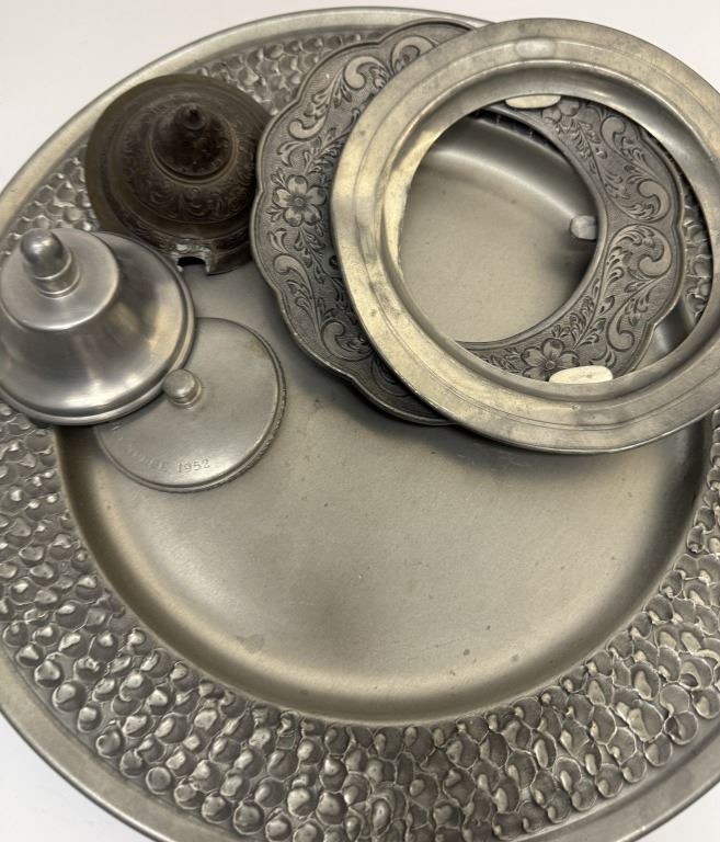 Vintage Pewter Platters, Cups, & Decanter Grouping