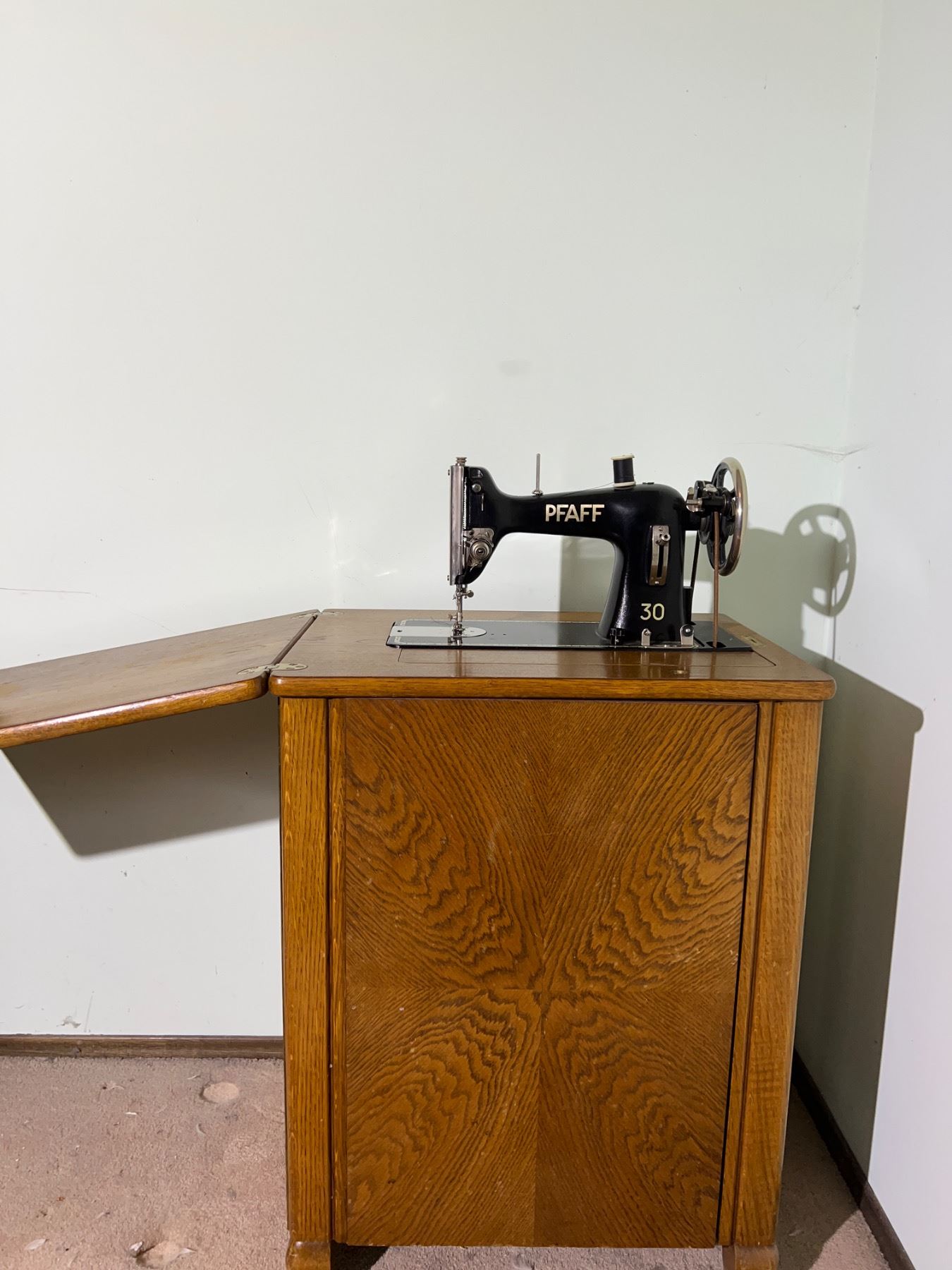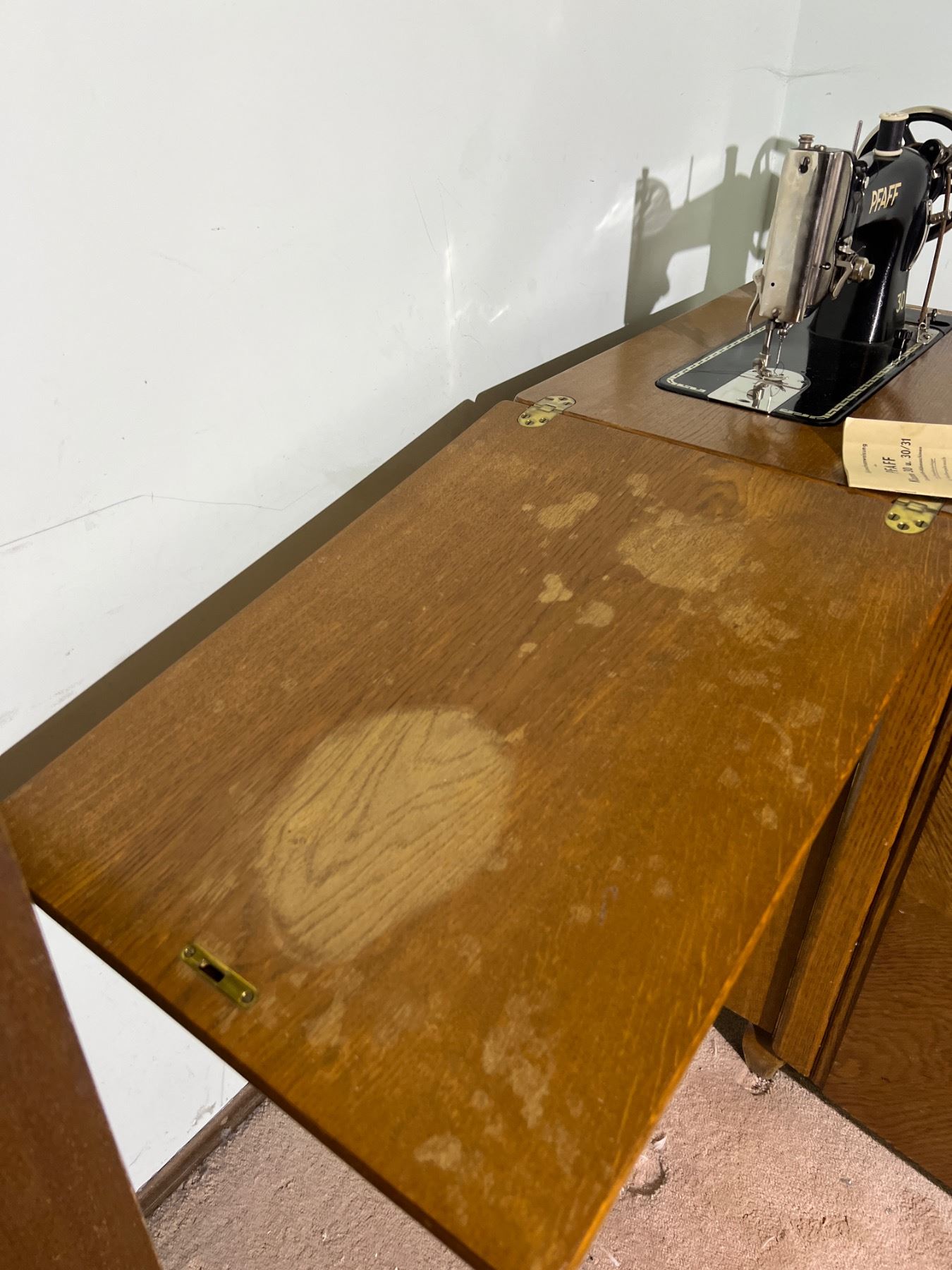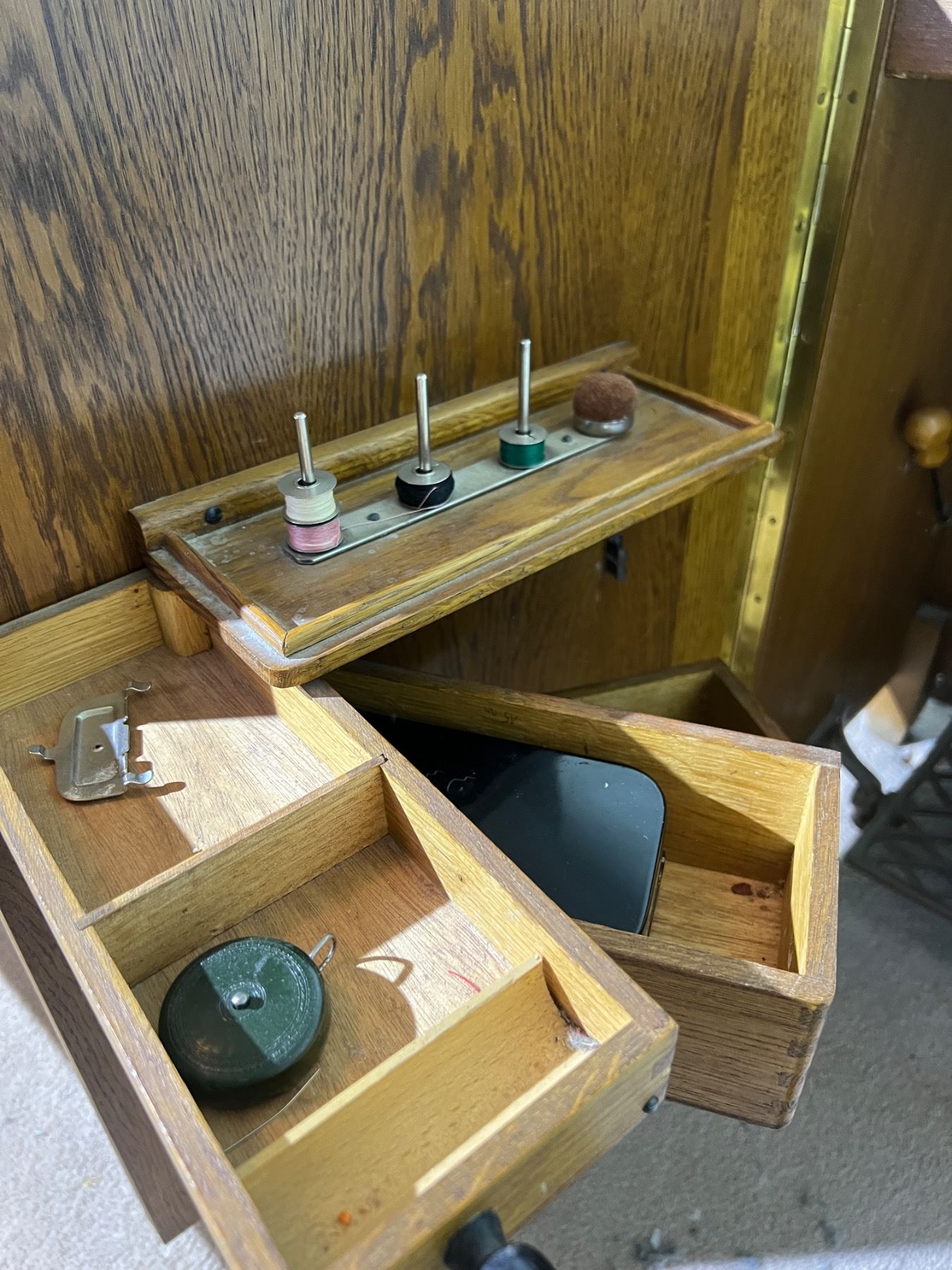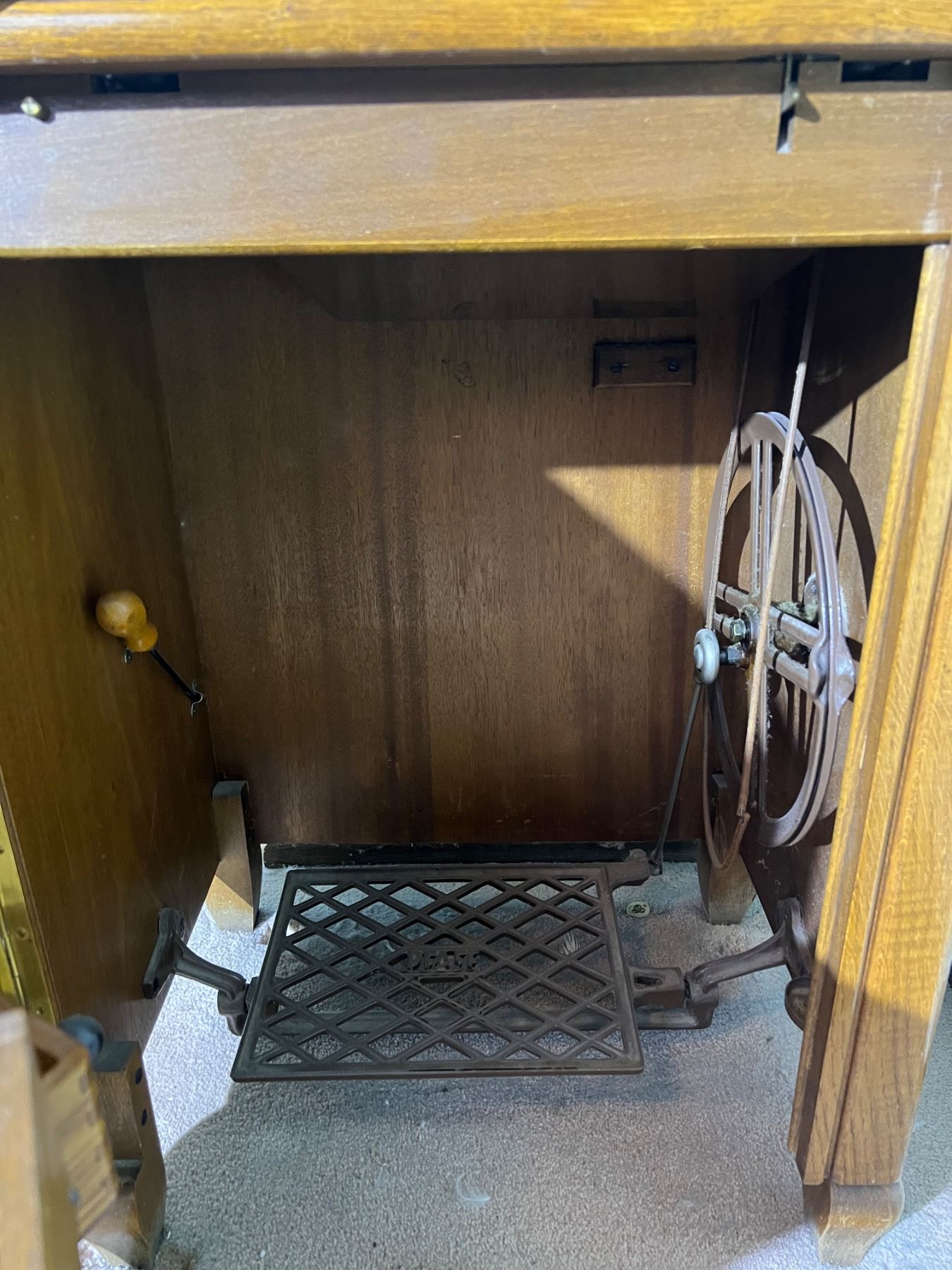 Serial No. 3978217, Includes some spare parts and accessories, The sewing table has some wear and markings on the wood, Fully extended; 46"L x 17"W x 31"H, Closed; 23"L