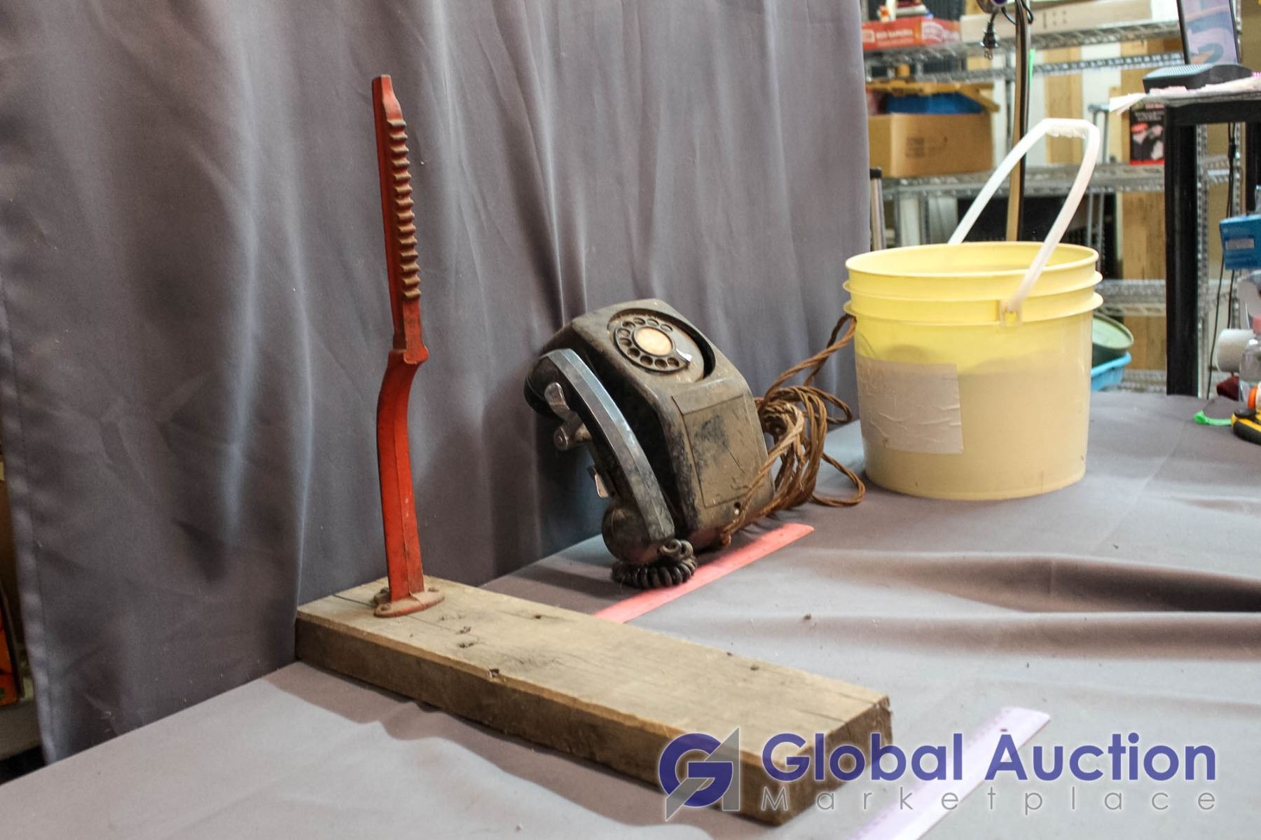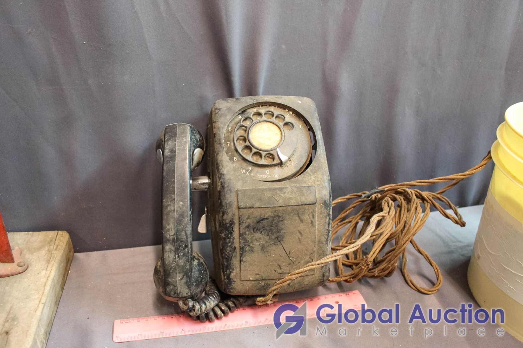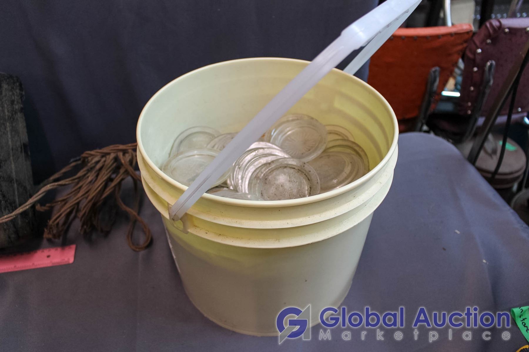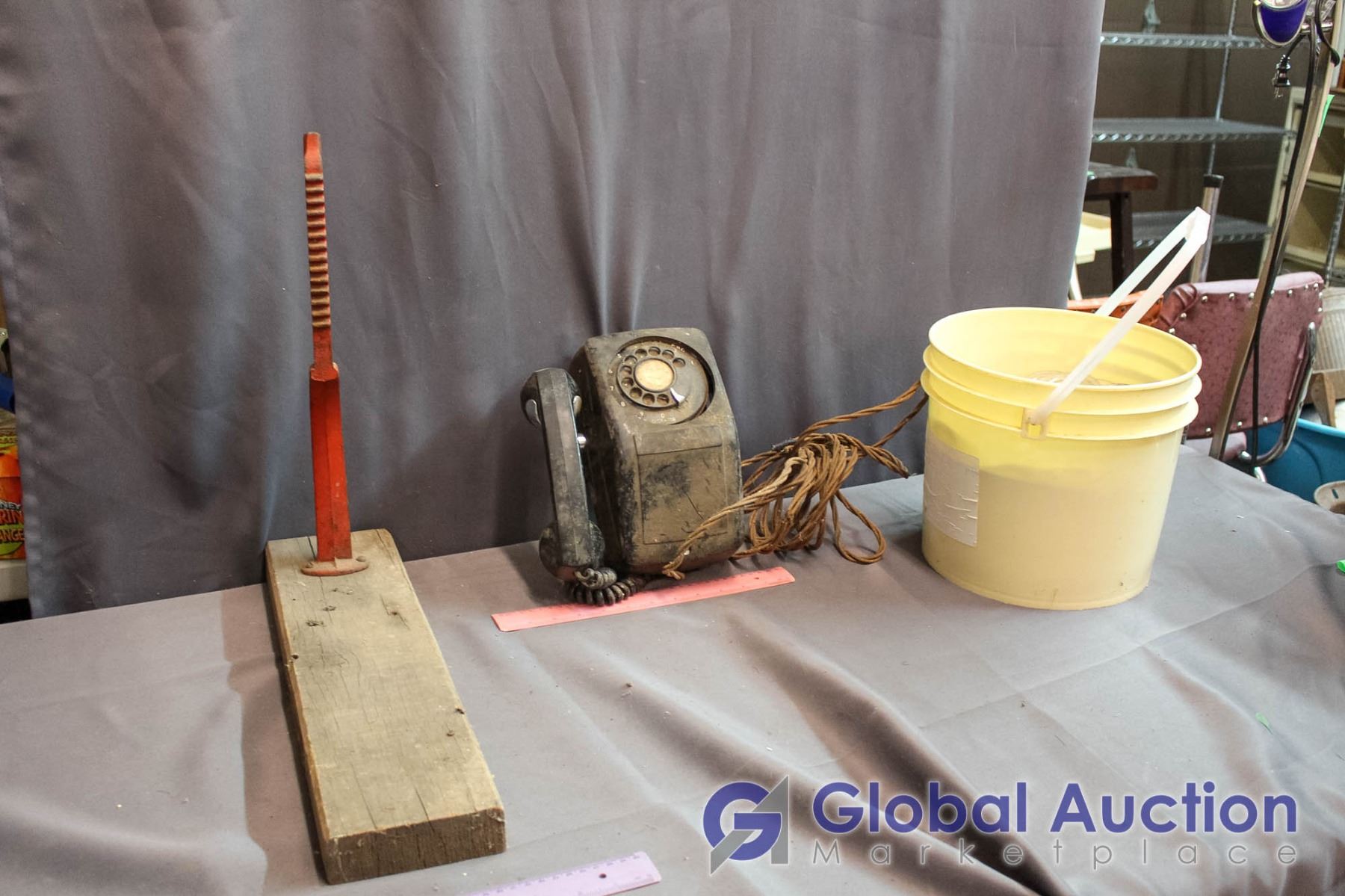 Vintage Phone, Pail Full of Glass Jar Lids, Misc