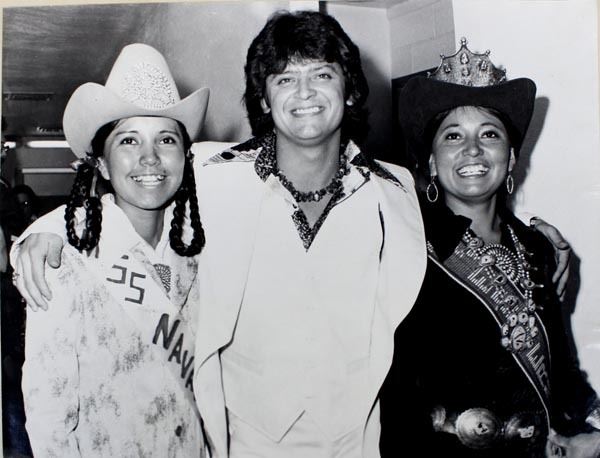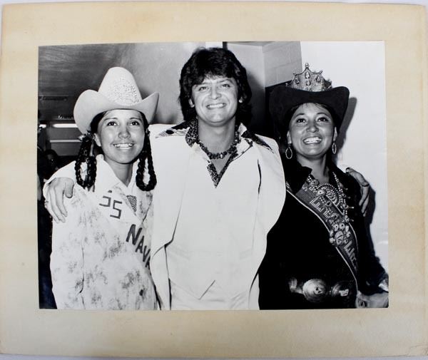 Vintage Photo of Western Country Singer Johnny Rodriguez with Miss Navajo Nation Princess and Queen , mounted on heavy cardstock, measures 10.5" x 14", ca. 1970s