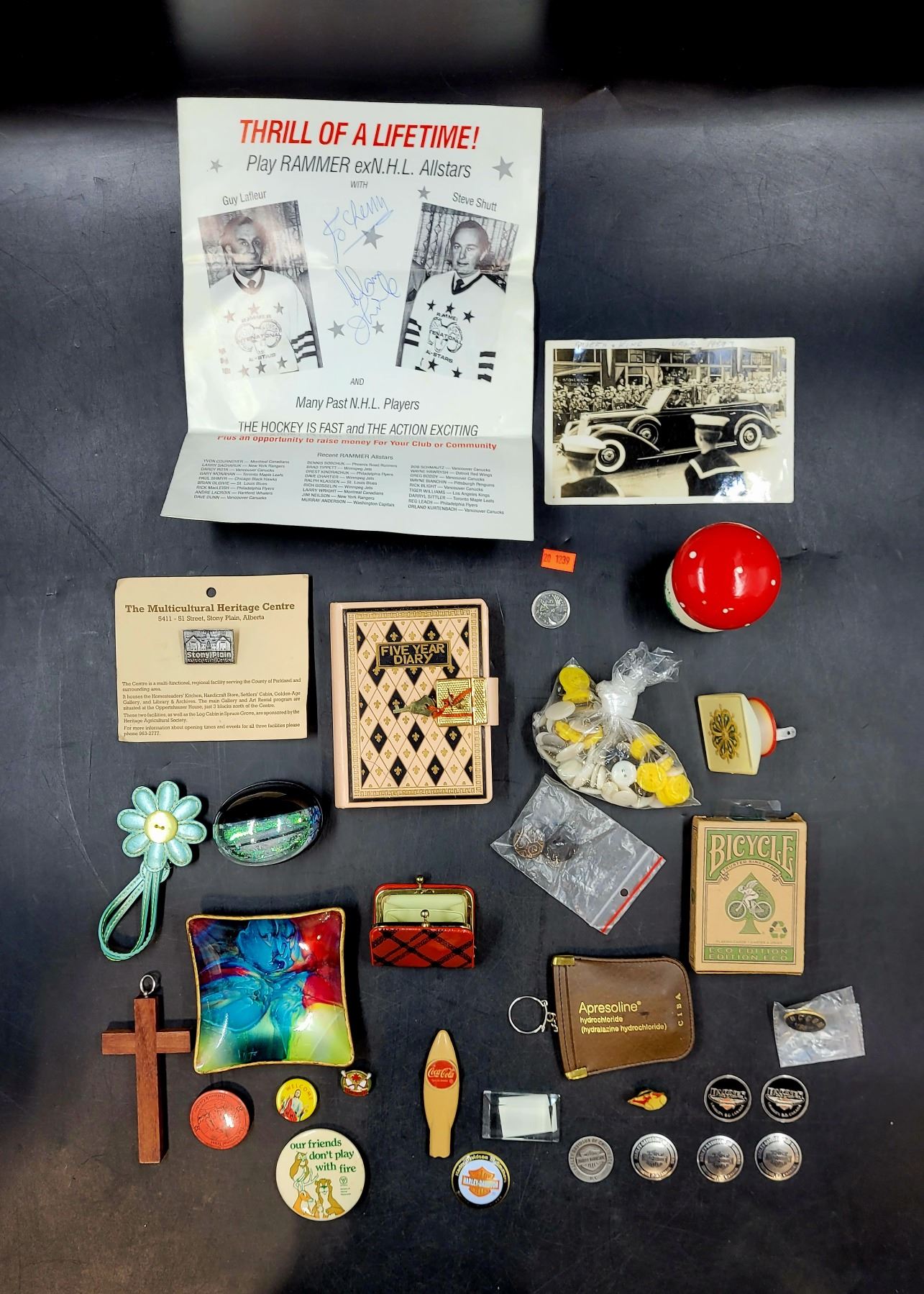 Vintage Photograph, Diary, Buttons, Cross Pendant, & More