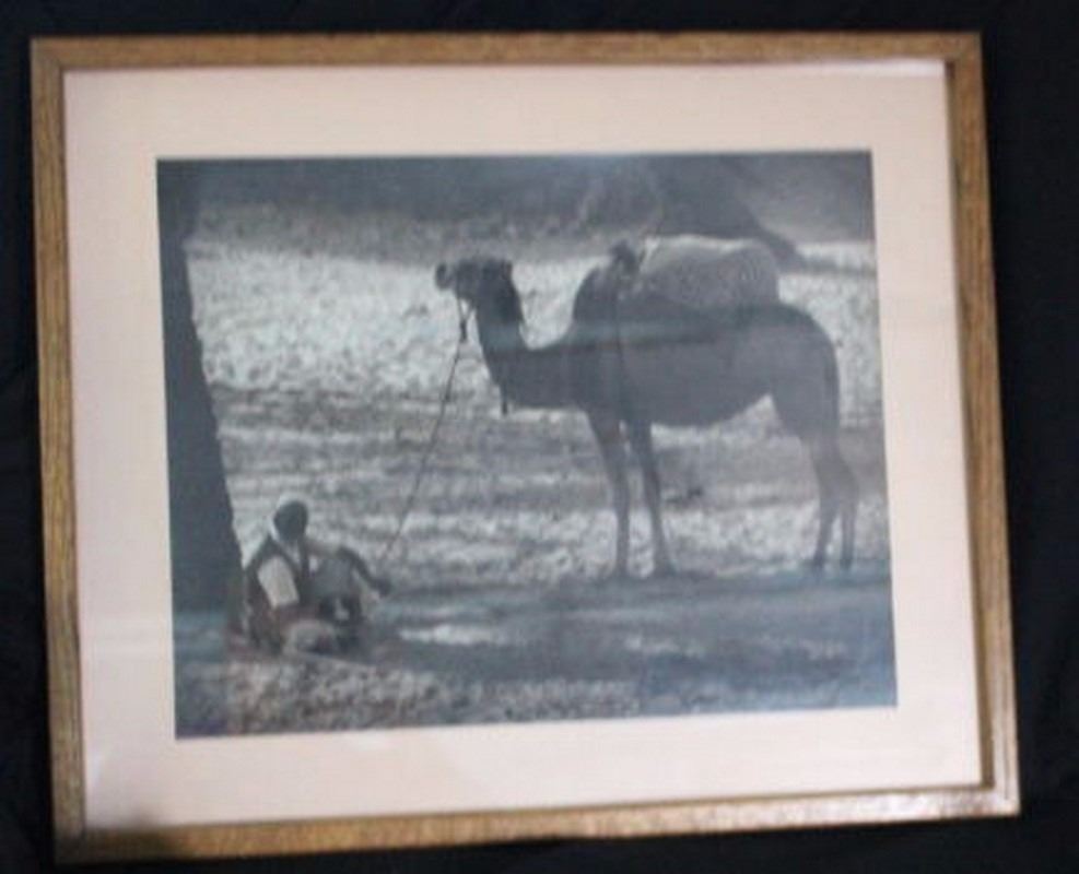 Vintage Black & White Photograph of Camel & Tribesman Resting Under the Shade of a Tree 25x21" solid oak frame