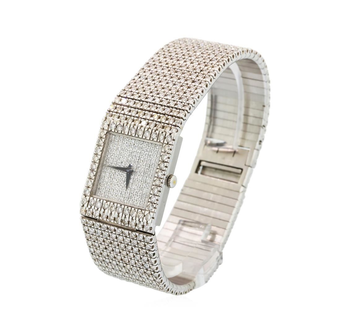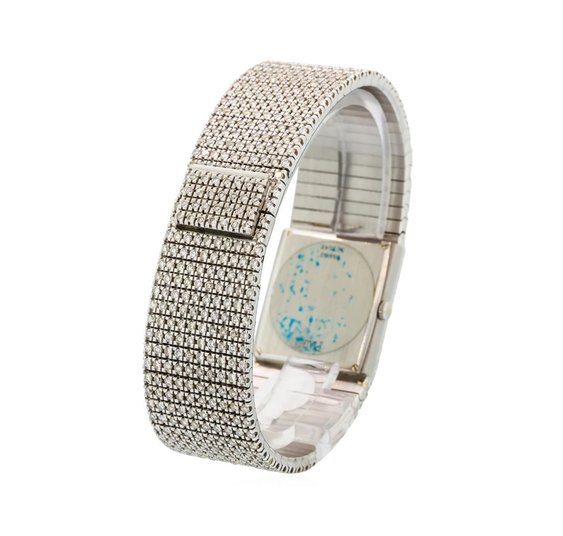 One, Vintage Piaget wristwatch electronically tested 18KT white gold, Integrated Case: 25 x 24mm, Swiss Hallmarked Case Back: secured by four set screws, engraved with the manufacturers name and ID numbers, Crown: scalloped, Bezel: diamond set pattern continuation, Crystal: synthetic sapphire lens. Circa late 1970's.Piaget Swiss mechanical stem wind Movement: Eighteen jewels, five position adjustments, Dial: diamond set, with baton pointed hands, 18KT White gold flexible Piaget Bracelet: set throughout with diamonds, tapering from One inch width to Three Quarter inch width, Condition: G-6 Extra Fine. Seven inch length. Containing: Eight Hundred Sixty prong set single cut and round brilliant cut diamonds, measuring from 1.00mm in diameter up to 2.00mm in diameter, approximate total weight of 868 Stones = 14.73ct. Graded in the setting. Clarity: VVS-1 to VS-2 Average Color D - F Average. Total Weight of Diamonds 14.73ct. Total Weight of Watch 135.49gm. AIG Appraised at $125,000.00.