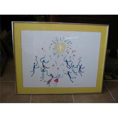 very attractive Picasso Print, circle of friends litho/serigraph w printed signature of picasso is on the lower right hand side. (see image #2). multi color combination with focal point of attractive yellow mat on a pure white backgraound. white aluminum frame, covered with glass. measures 22" T. X 28.5 " W. incl. frame. in excellent condition. something to think about. a quick note: t print belongs to my dear friend, whose mother passed away about a year ago. price reduced! OFFER ACCEPTED.