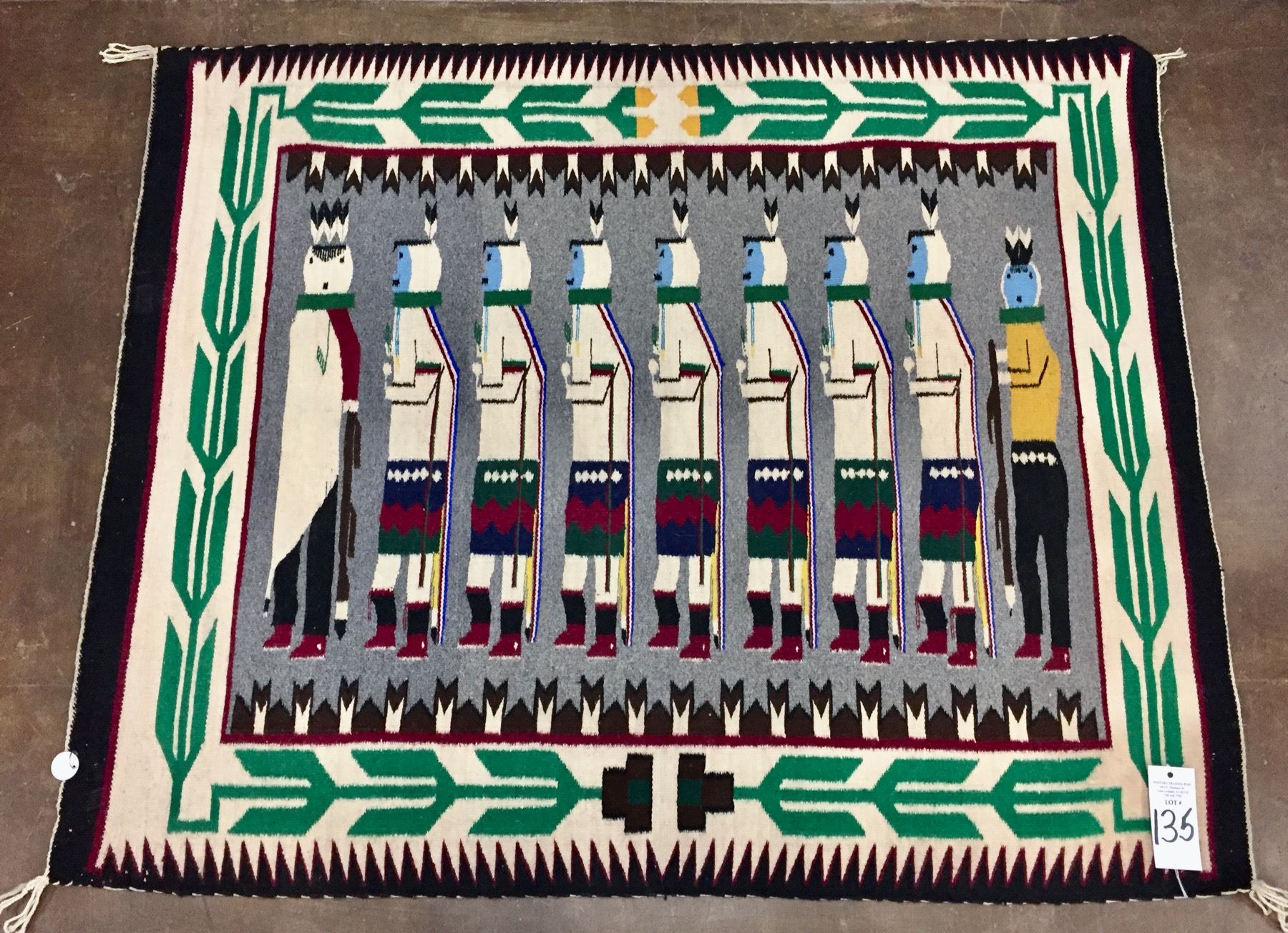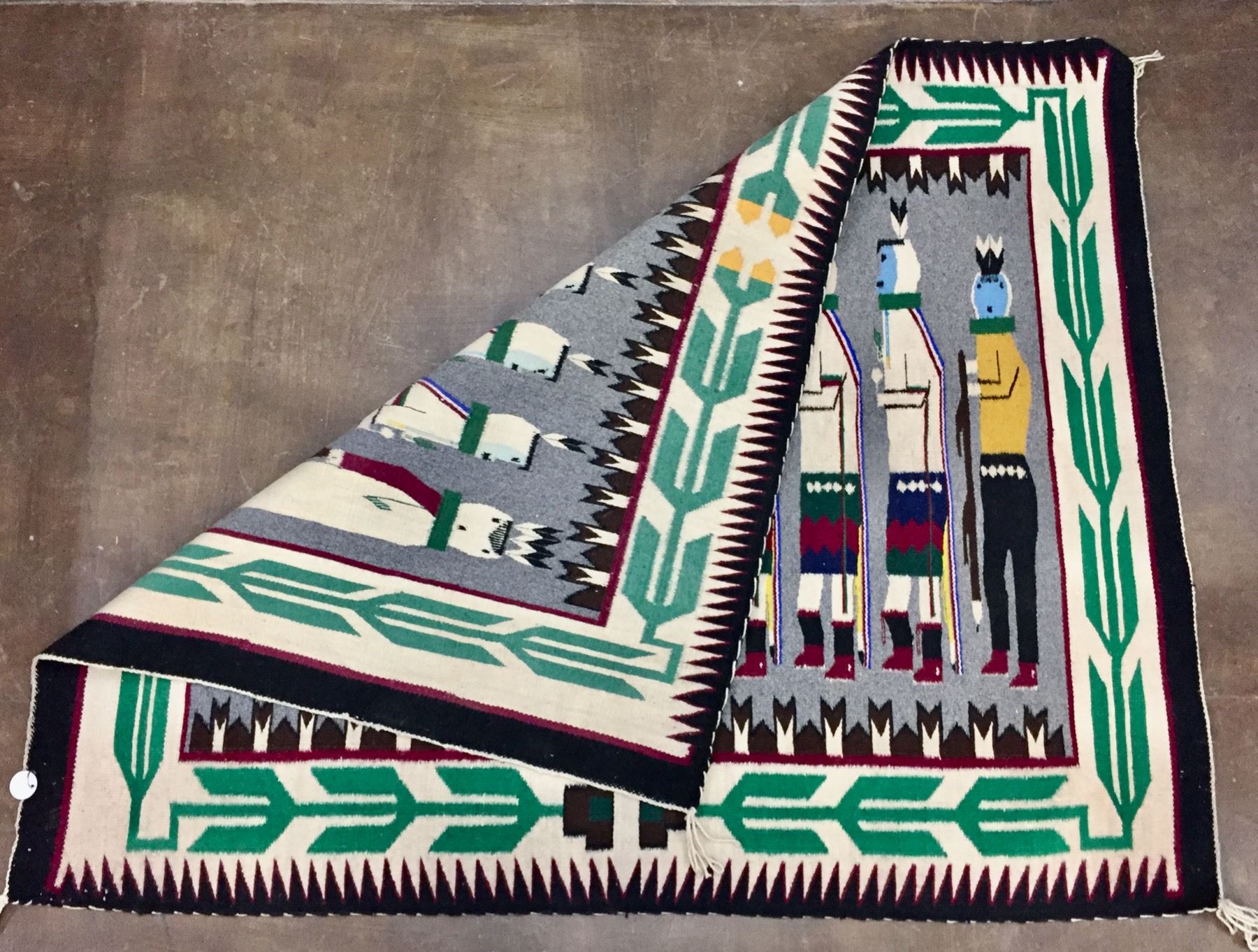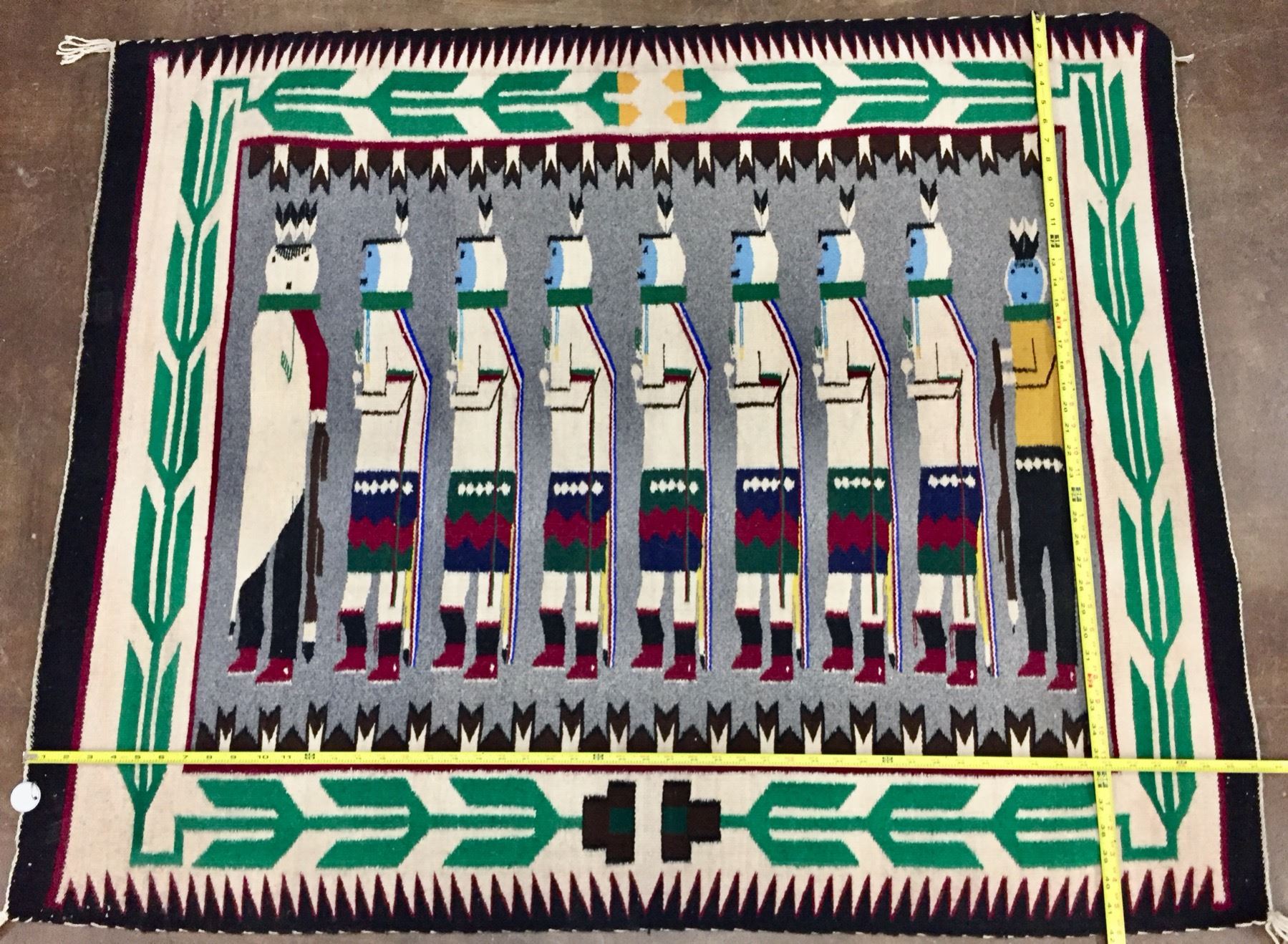Description: For your consideration, we offer for sale this vintage Pictorial Navajo Textile featuring bright colors in a tight weave. Maker: Unknown Navajo Weaver. Approx. Age: Circa 1970s. Size: 51-1/2”w x 42” long. Condition: Fair for its age, fading, wear and aging expected. Please look closely at the pictures - they are an important part of our description. Shipping: There will be a $5 handling / packaging fee for shipping this lot. The actual cost of postage will be added on top of that.