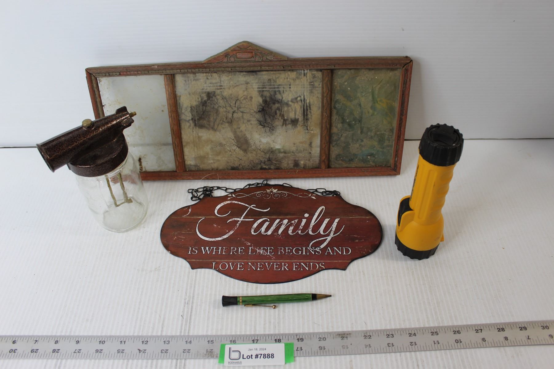 Vintage Picture Frame, Family Sign, Flashlight, Vacuum Attachment, Mechanical Pencil
